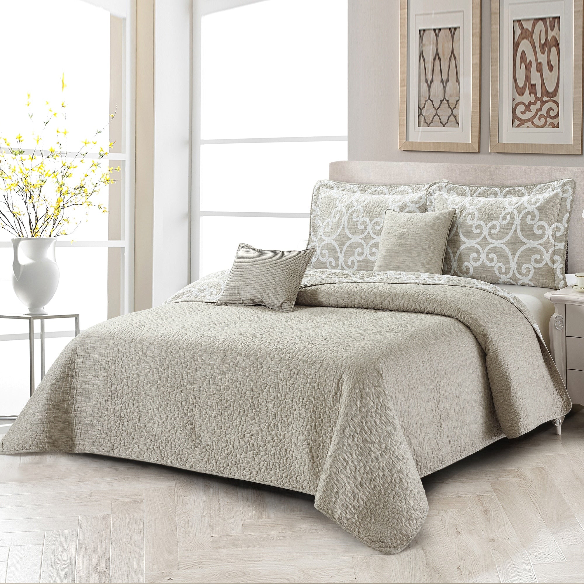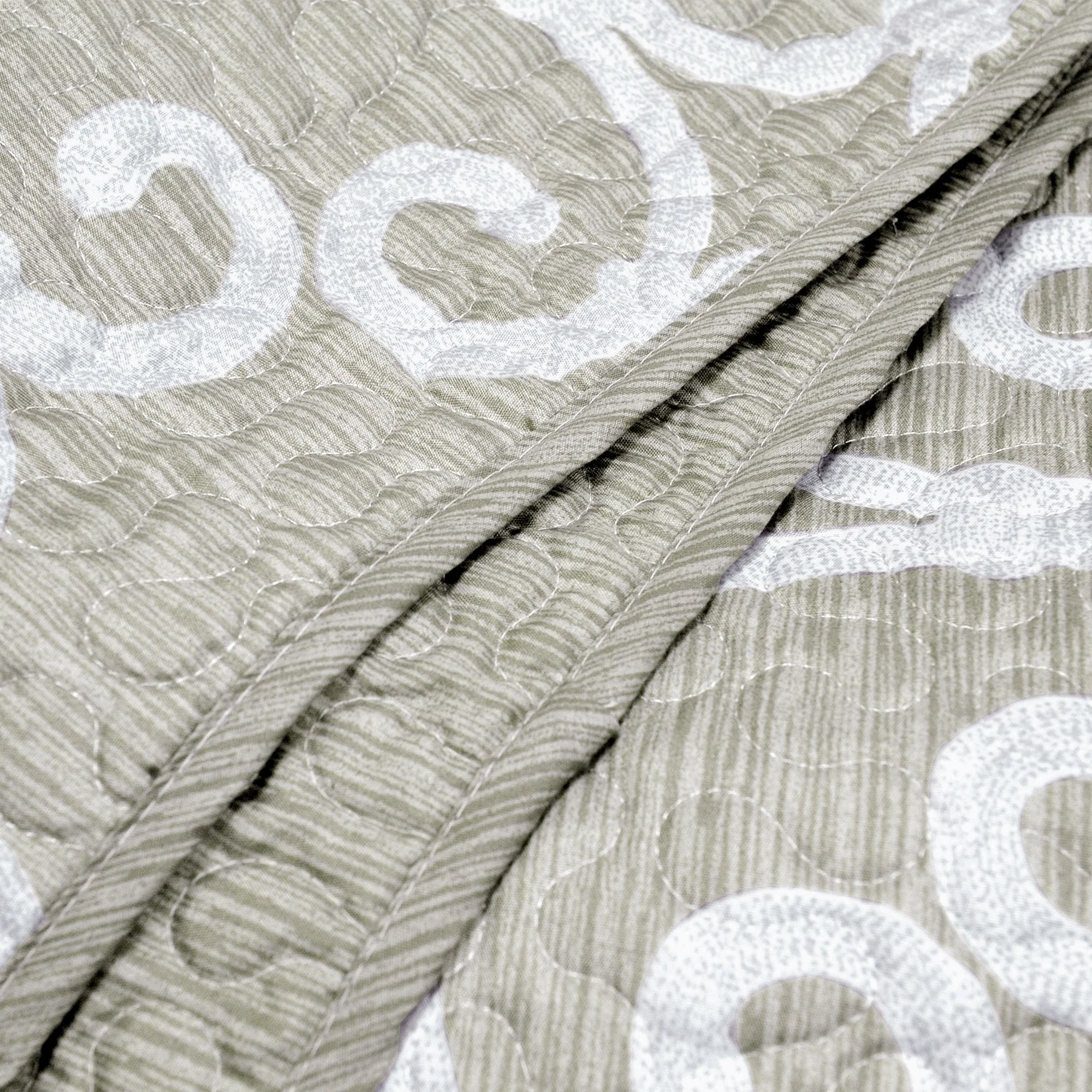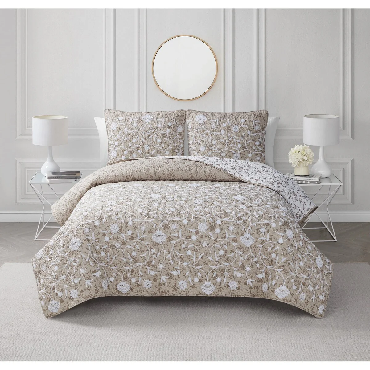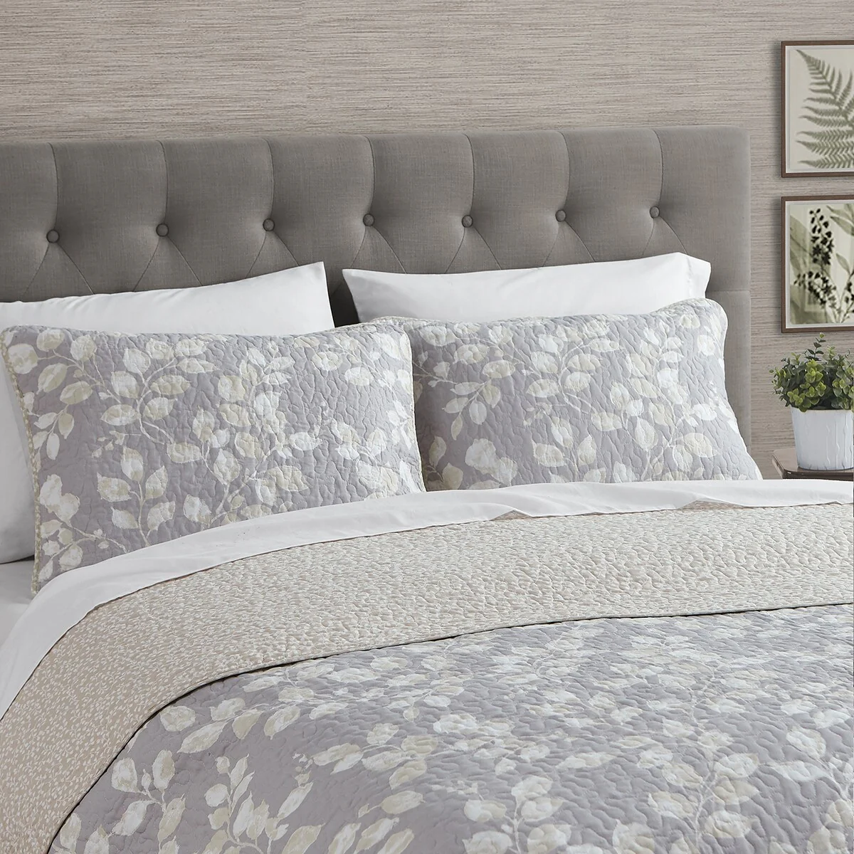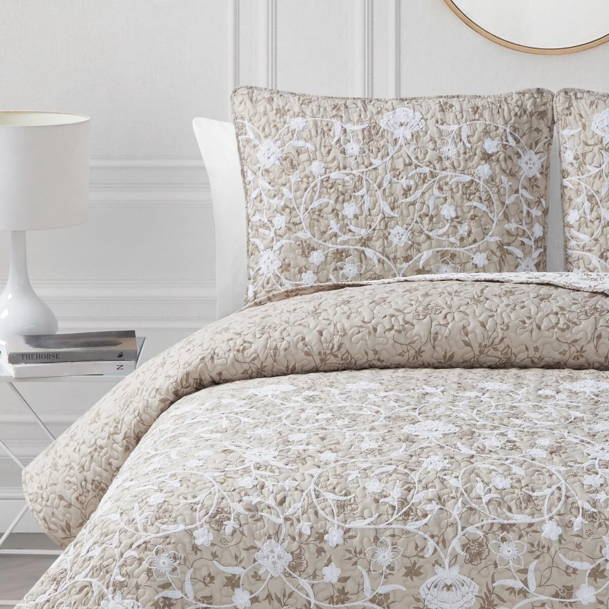 CEDAR COURT Kendall Vine Leaf Embroidery Taupe Neutral All-Season Reversible Soft Microfiber Quilt Set