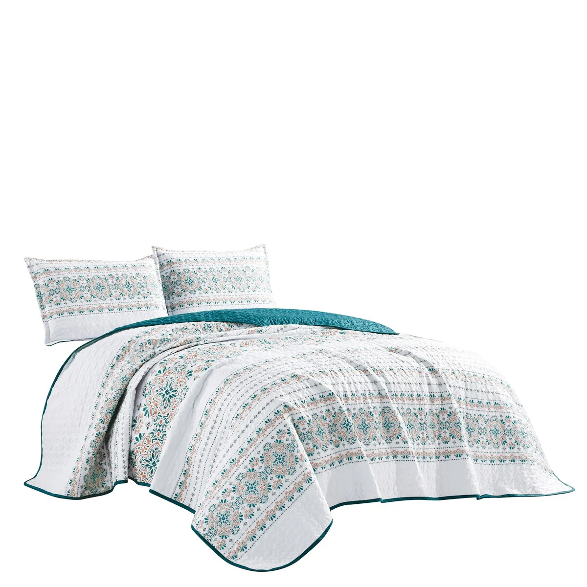 3 Piece Queen Size Cotton Quilt Set with Paisley Print, Teal Blue