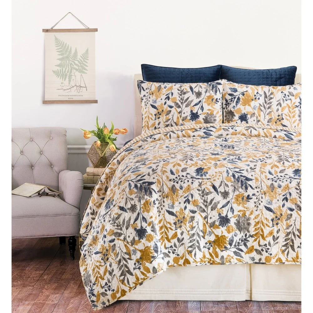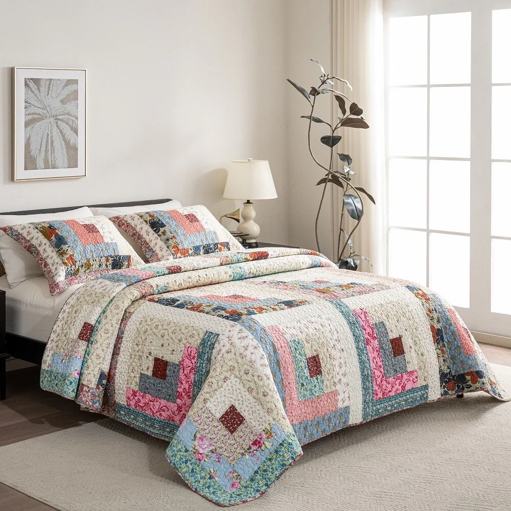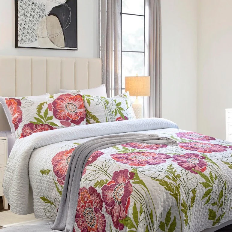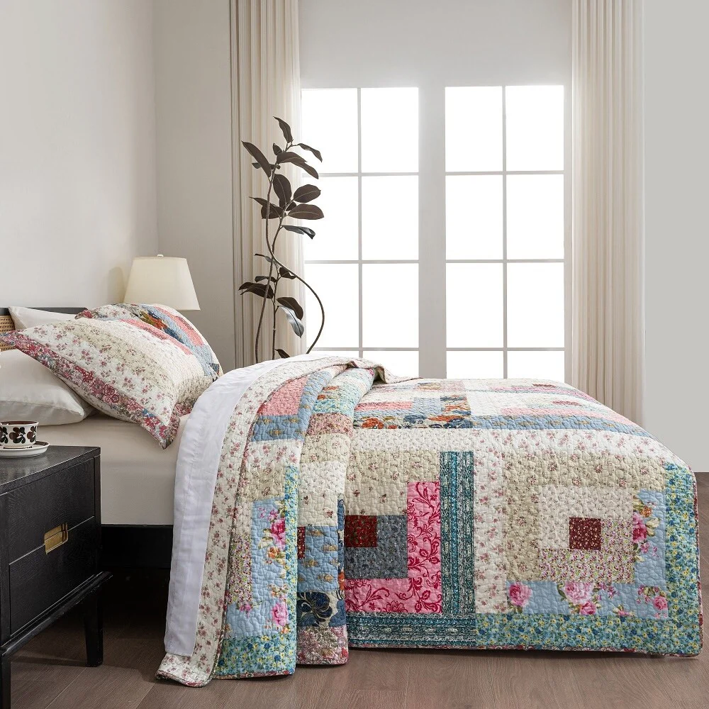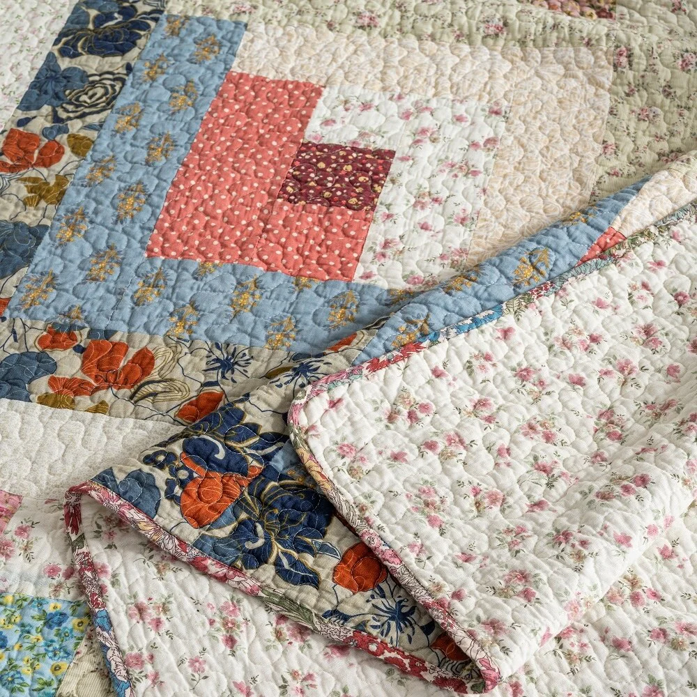 French Country Floral Blooming 3-Piece Cotton Reversible Quilt Bedding Set