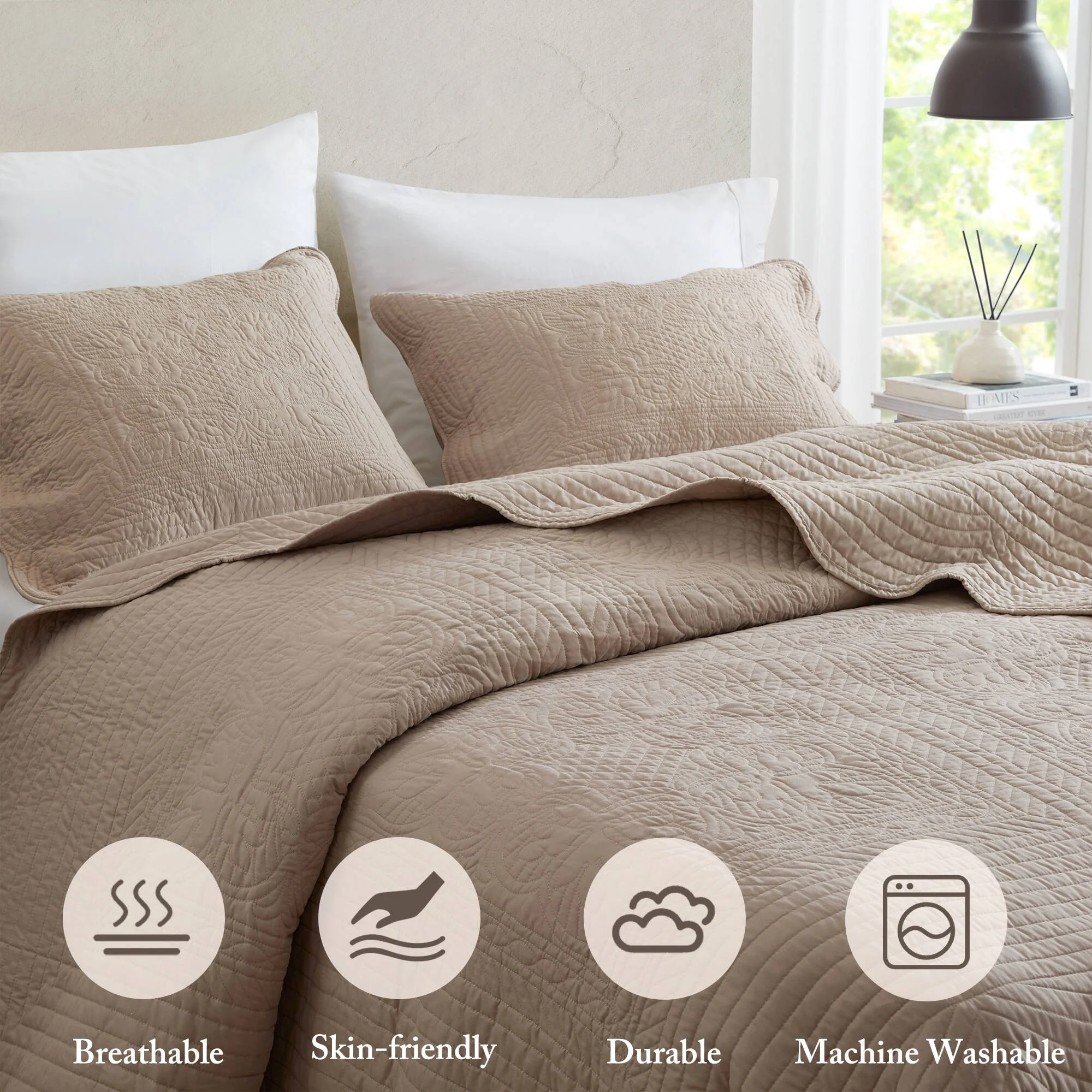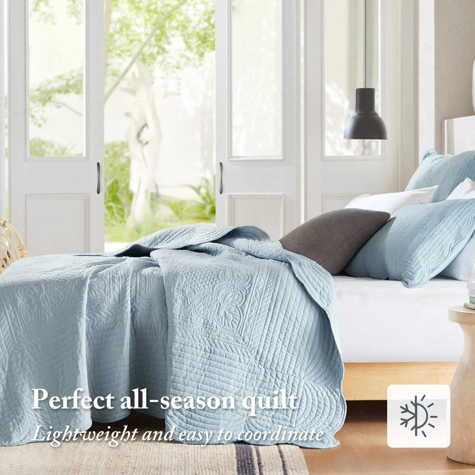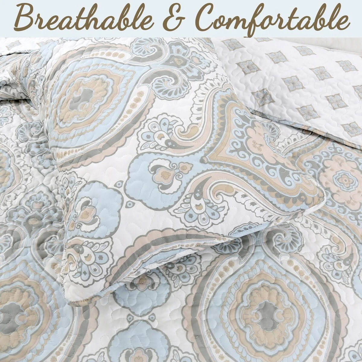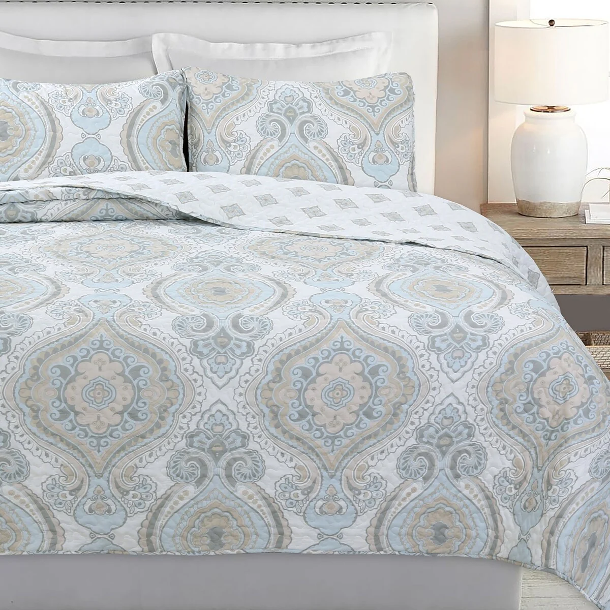 Cozy Line Modern Medallion Sky Blue Tan Gray Brocade Polyester Quilt Bedding Set