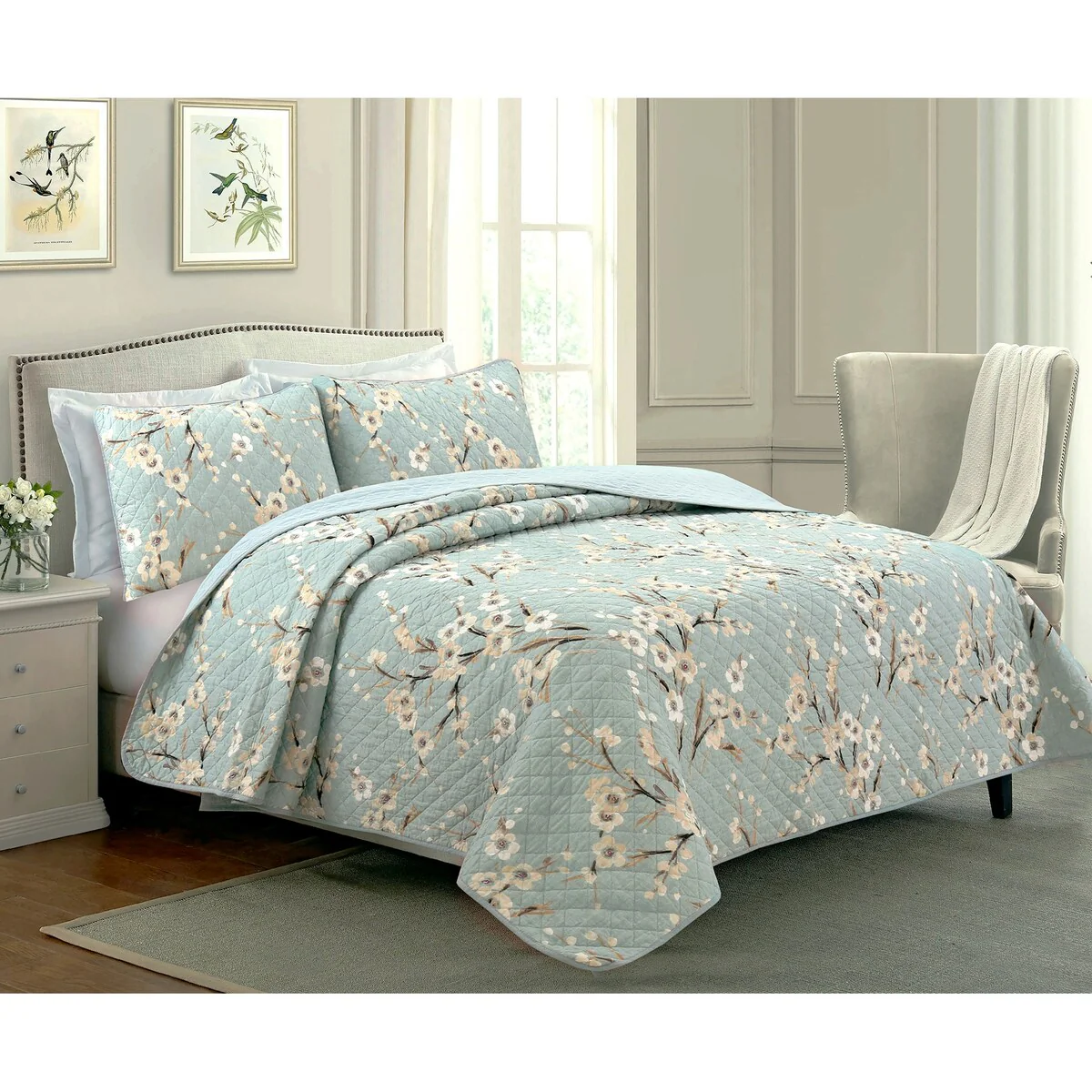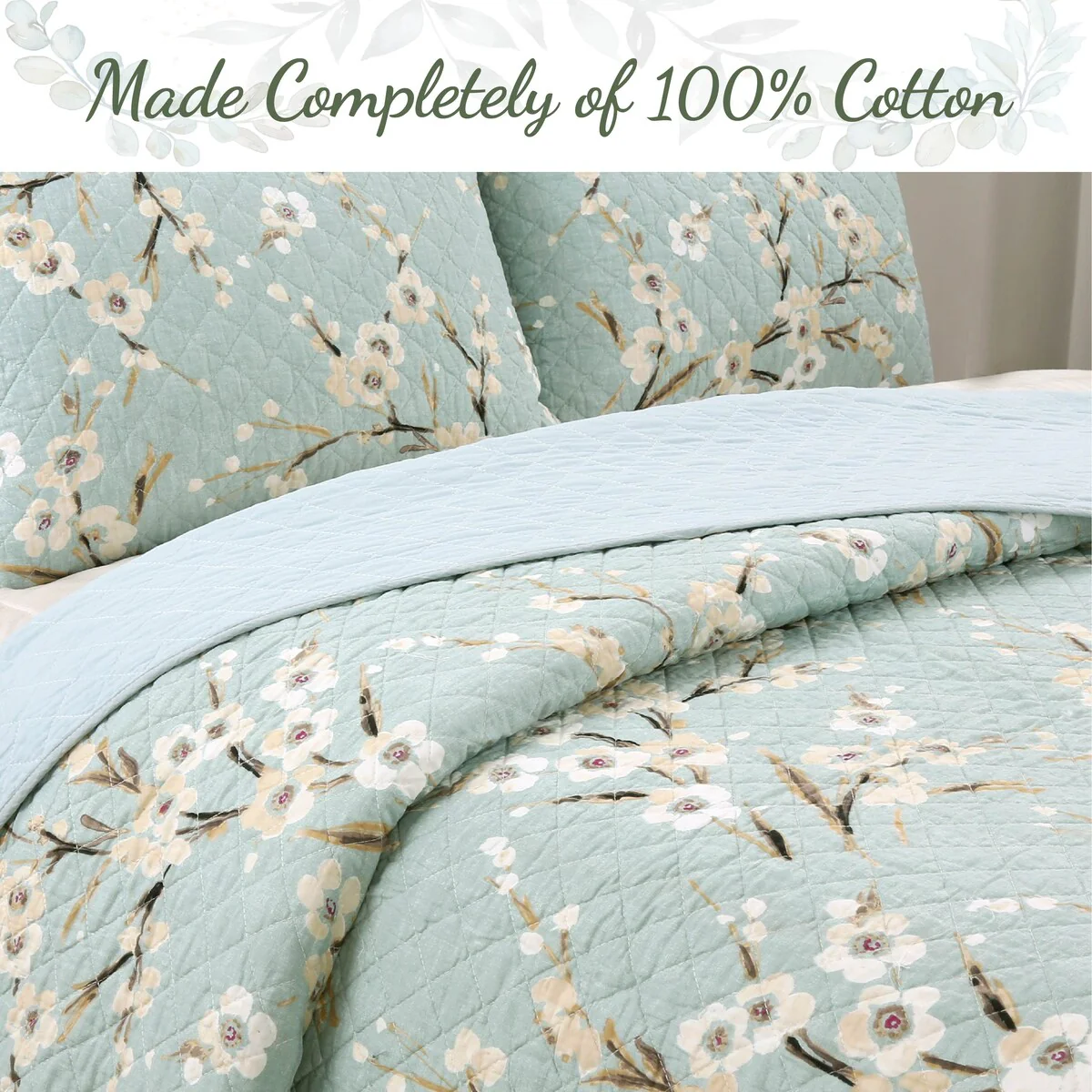 Cozy Line Cream Cherry Blossom Floral Cyan Blue Green Quilt Bedding Set