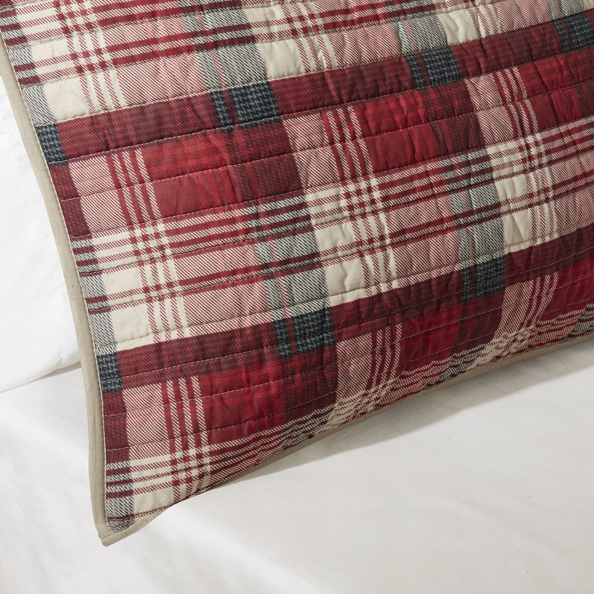 Coverlet Set: Red, Sheet Set: Light Grey - Queen