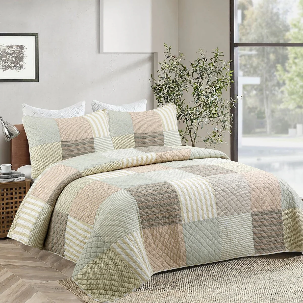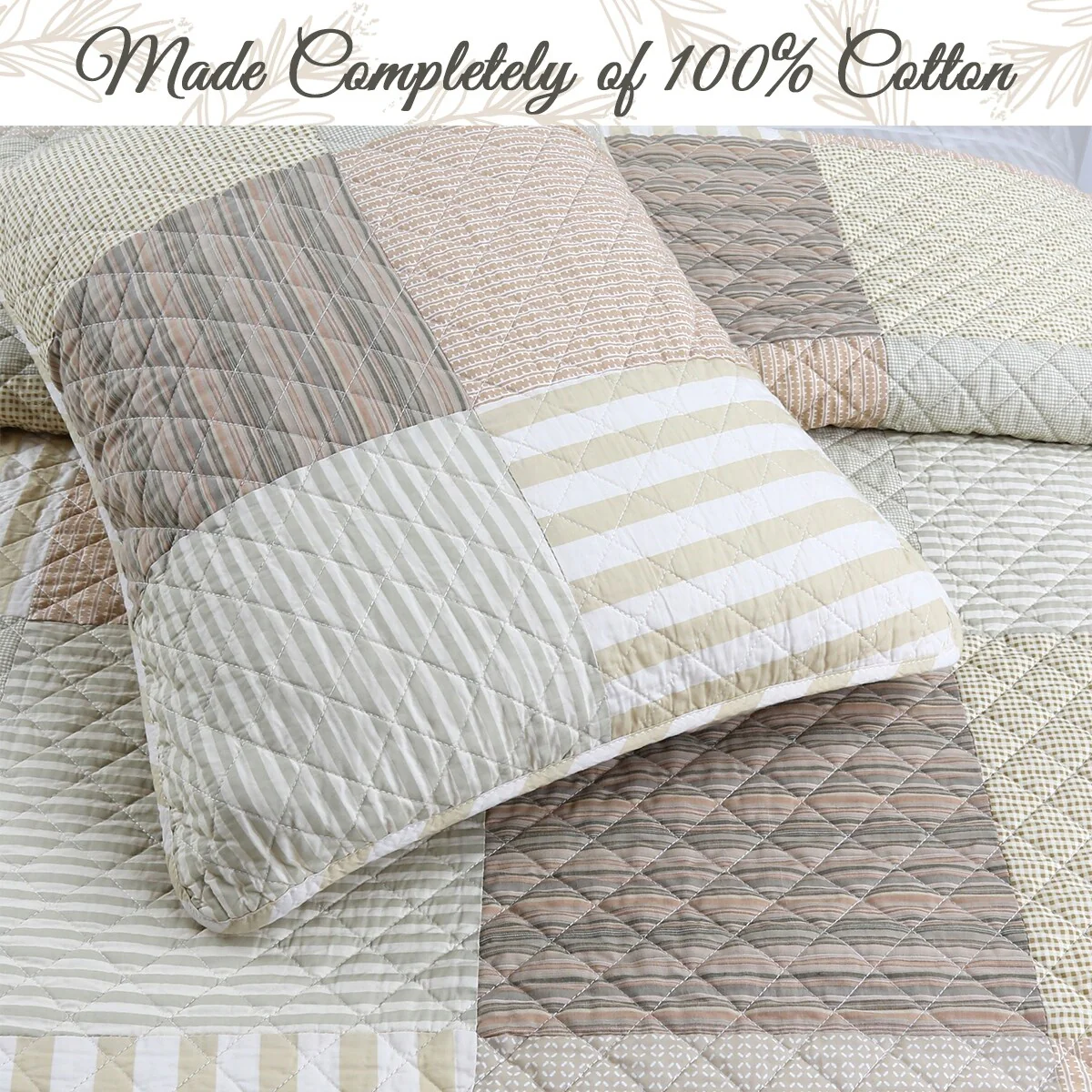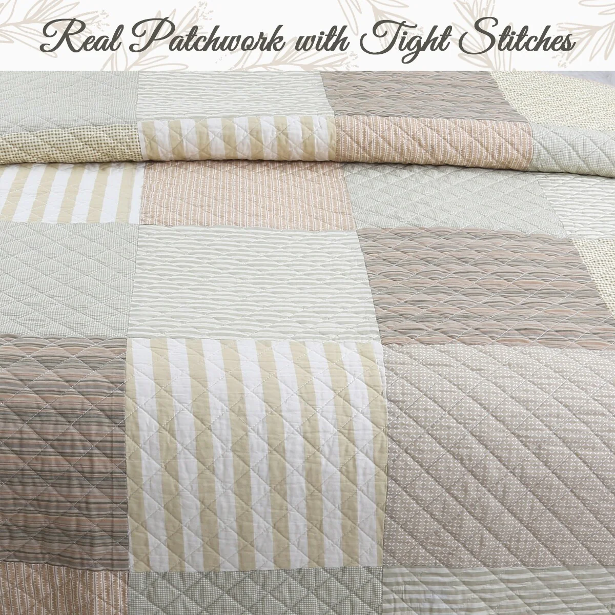 Cozy Line Stripe Checker Patchwork Cotton Reversible 3 Piece Quilt Bedding Set