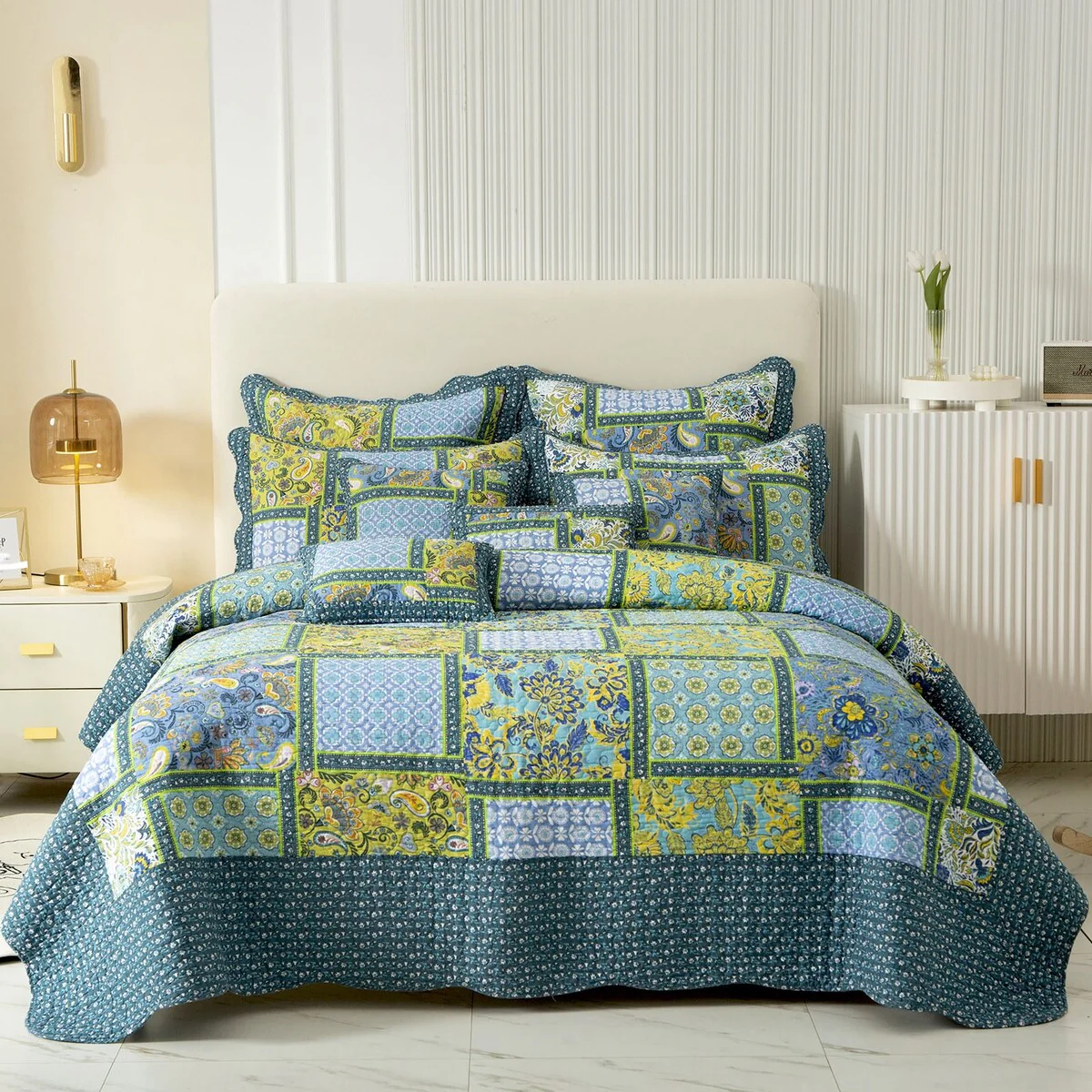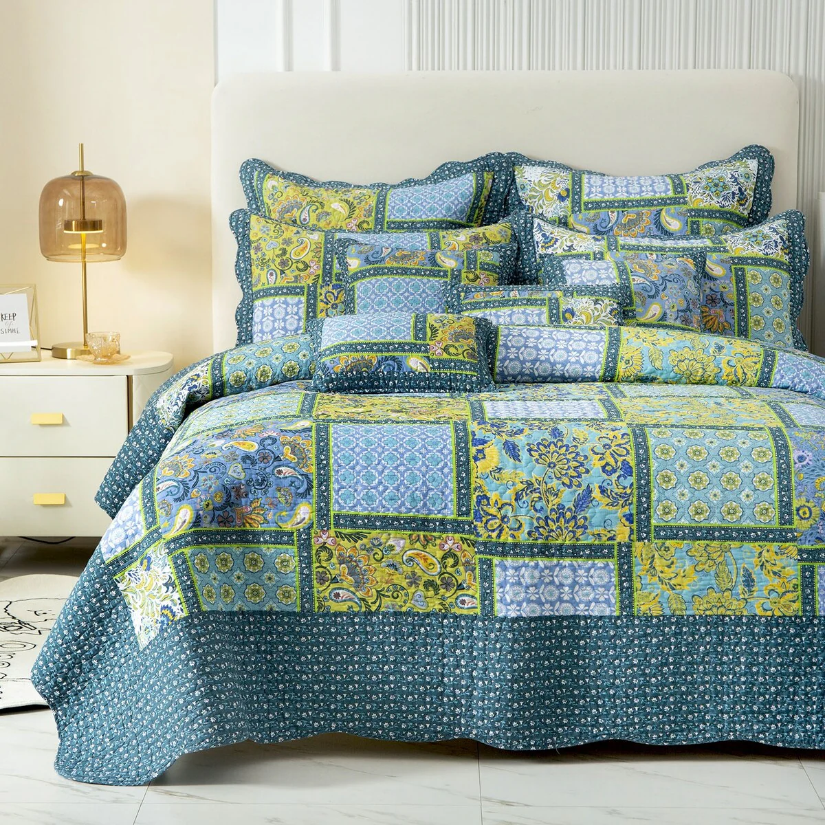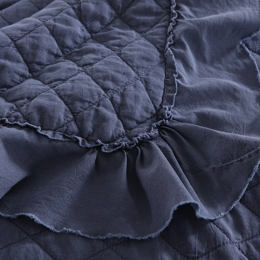 Coverlet Set: Dark Blue, Sheet Set: Grey - King
