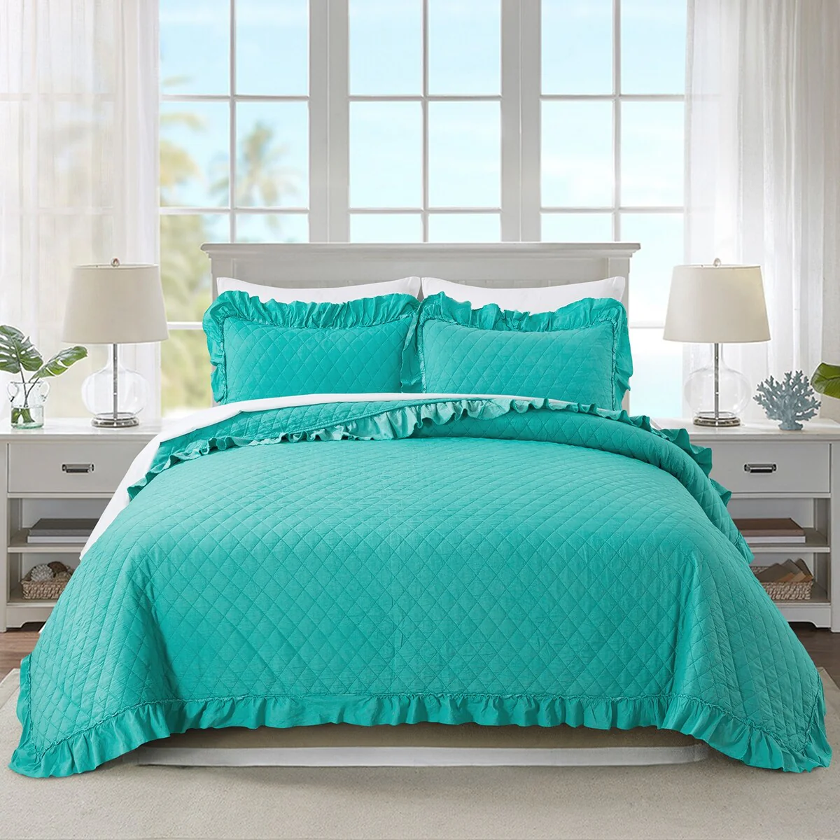 Coverlet Set: Coronet Blue, Sheet Set: White - Queen