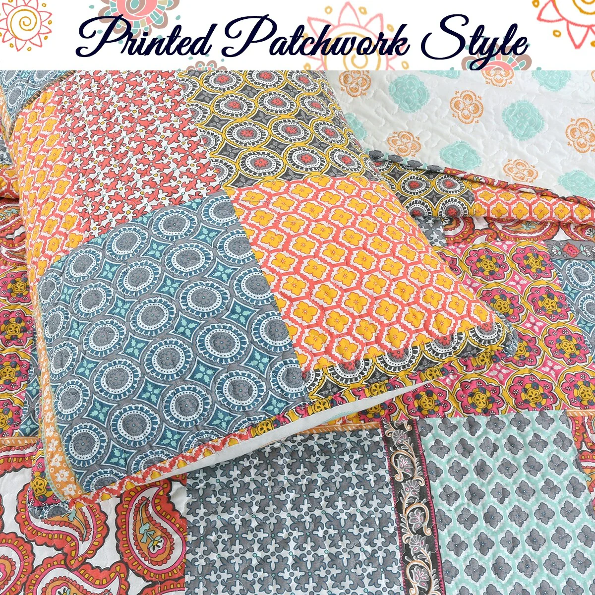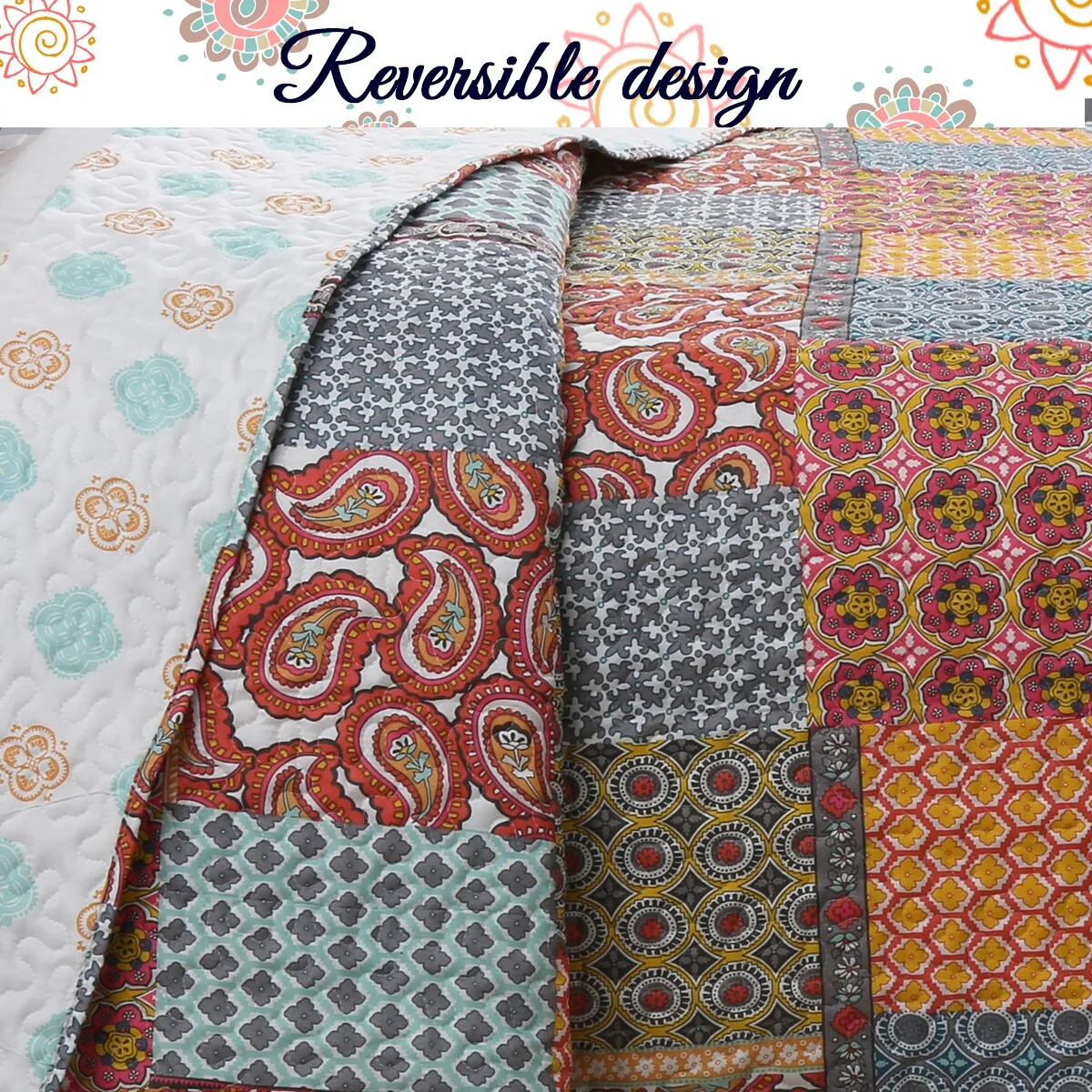 3 Piece Printed Reversible Bedding Quilt Set- Quilt And 2 Shams, Soft & Lightweight Full/Queen,King