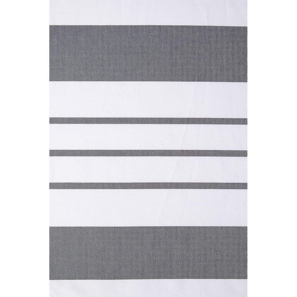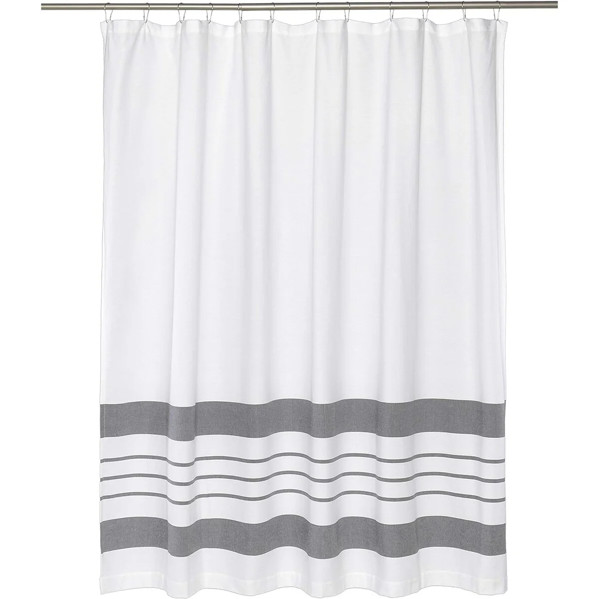 100% OEKO-TEX COTTON: This woven white shower curtain is made of durable, high-quality Oeko-Tex cotton. Oeko-Tex cotton ensures this product surpasses the highest standard of testing and helps you to make responsible decisions that protect our planet for future generations. 72 INCH X 72 INCH STANDARD SIZE: Designed for a standard size bathtub shower for use with an interior shower curtain liner (liner not included). SIMPLE STRIPE DESIGN: The white and gray shower curtain features a timeless stripe design that drapes beautifully for a fresh, clean look in your bathroom, spa or hotel. The white fabric allows light to come through the curtain so that your space feels bright and open. BUILT-IN RING HOLES: Each curtain contains 12 ring holes that fit standard hooks or rings (not included) for a simple installation. CARE FOR YOUR SHOWER CURTAIN: Machine wash and lay flat to dry for stress-free care. This shower curtain is long-lasting and durable for many washes.