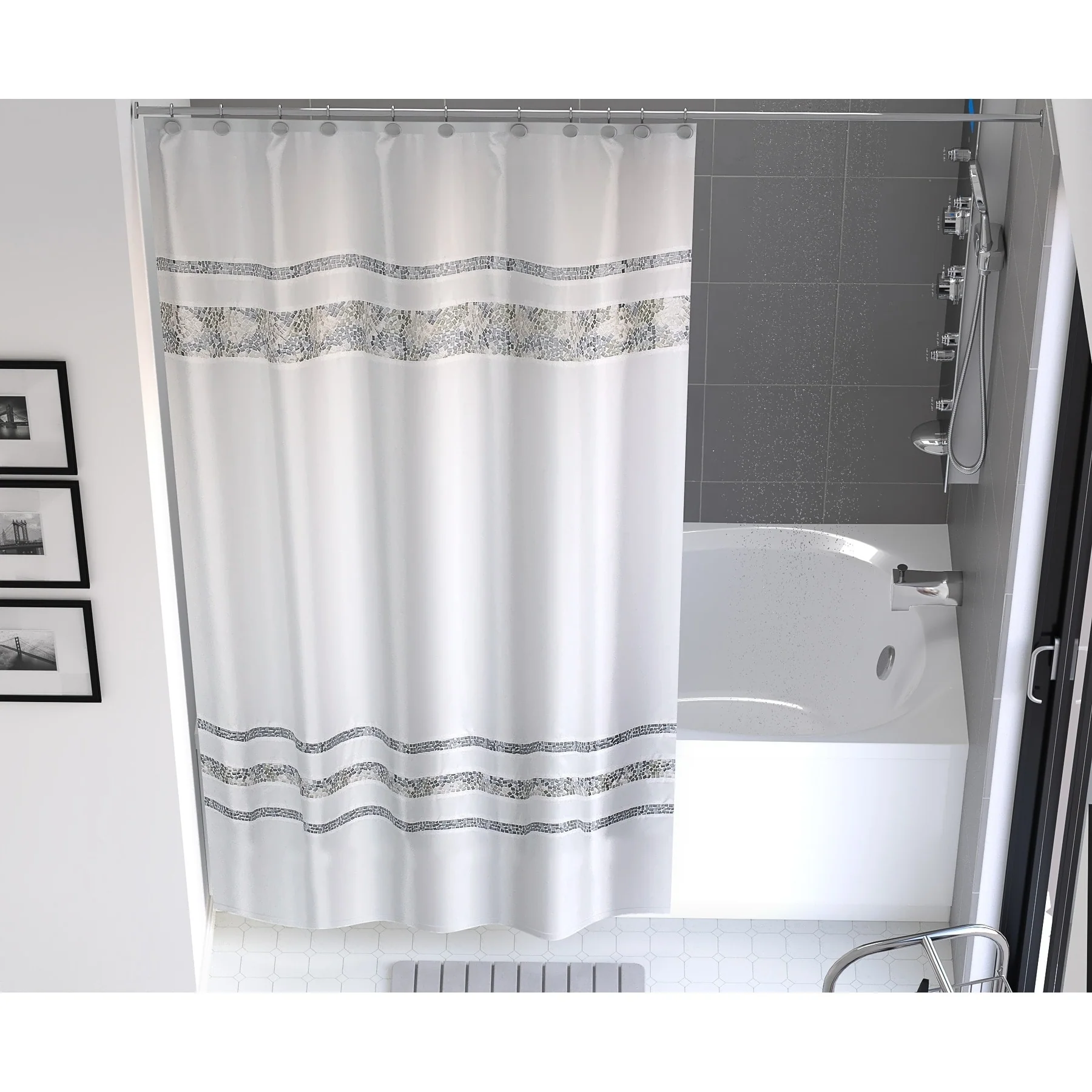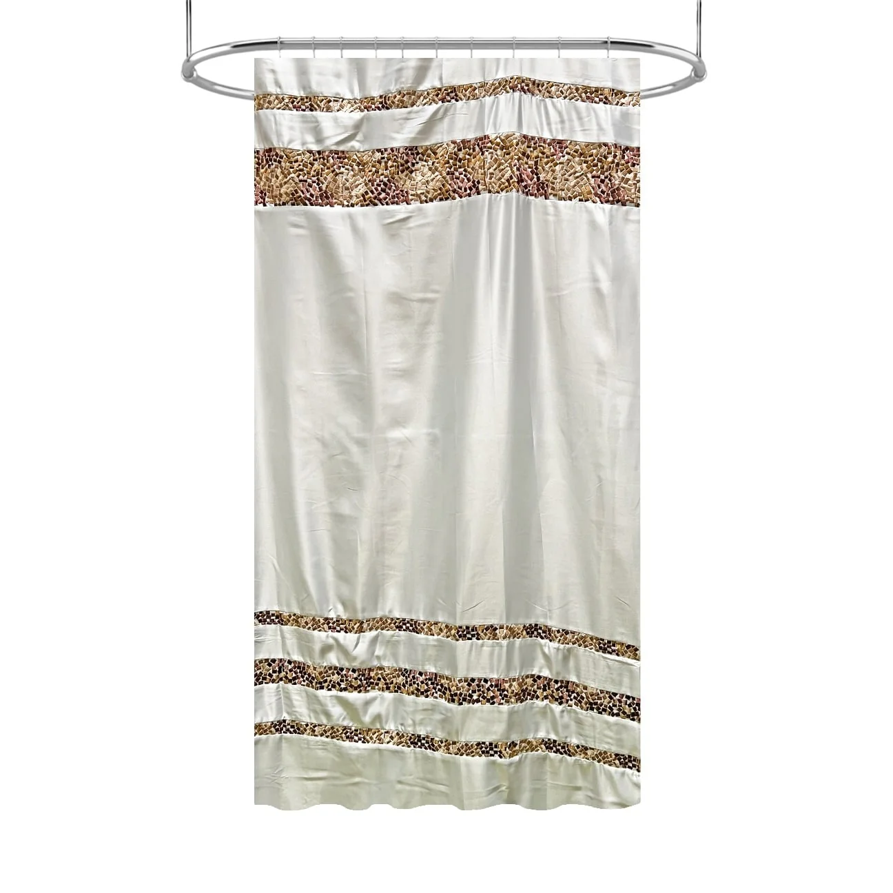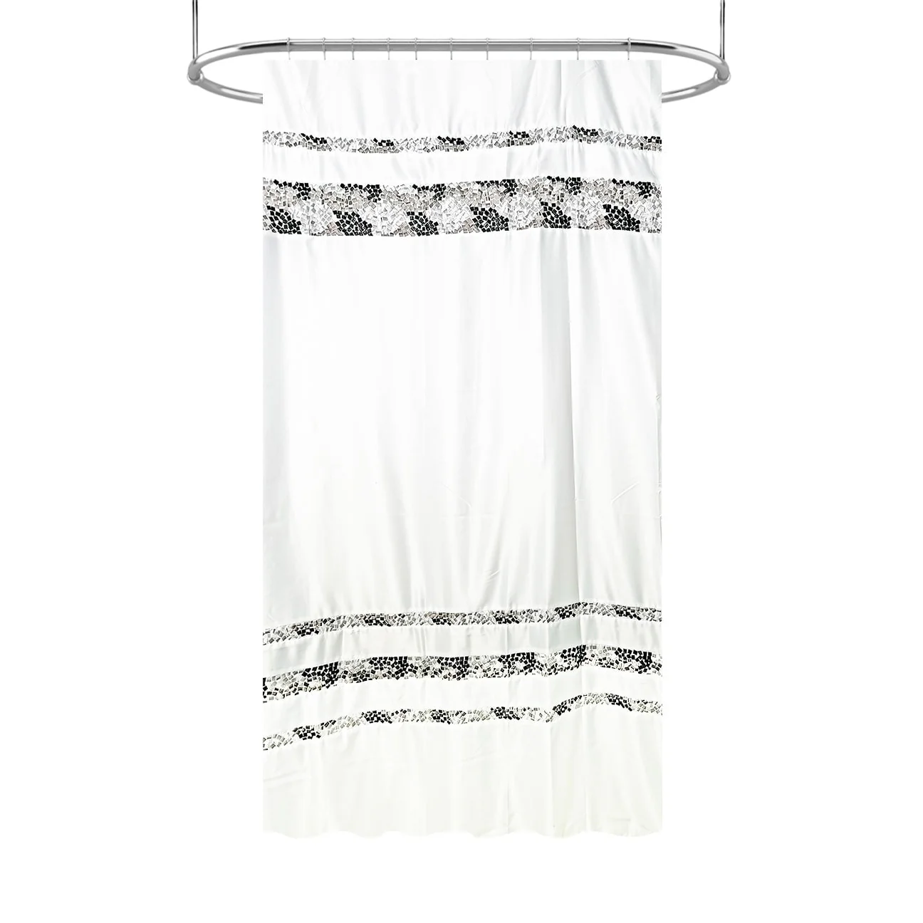 Spa Tile White Soft Fabric Shower Curtain with Multicolor Embroidered Tile Bands