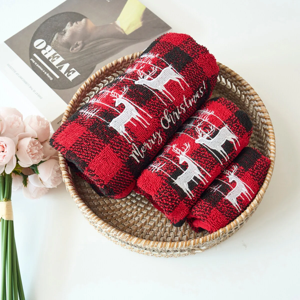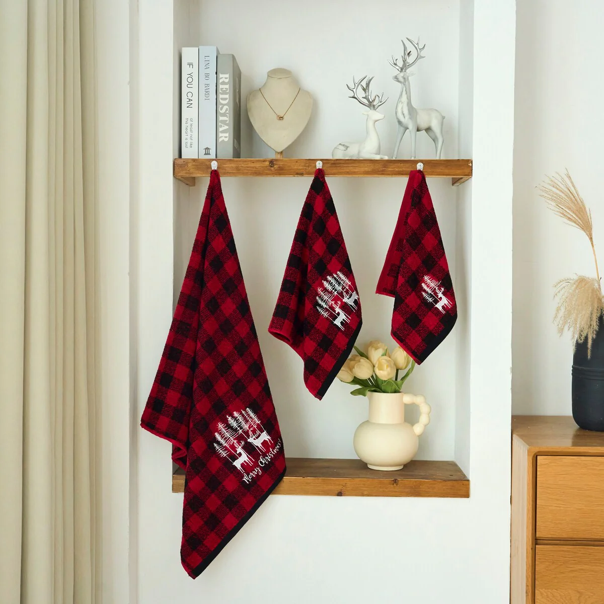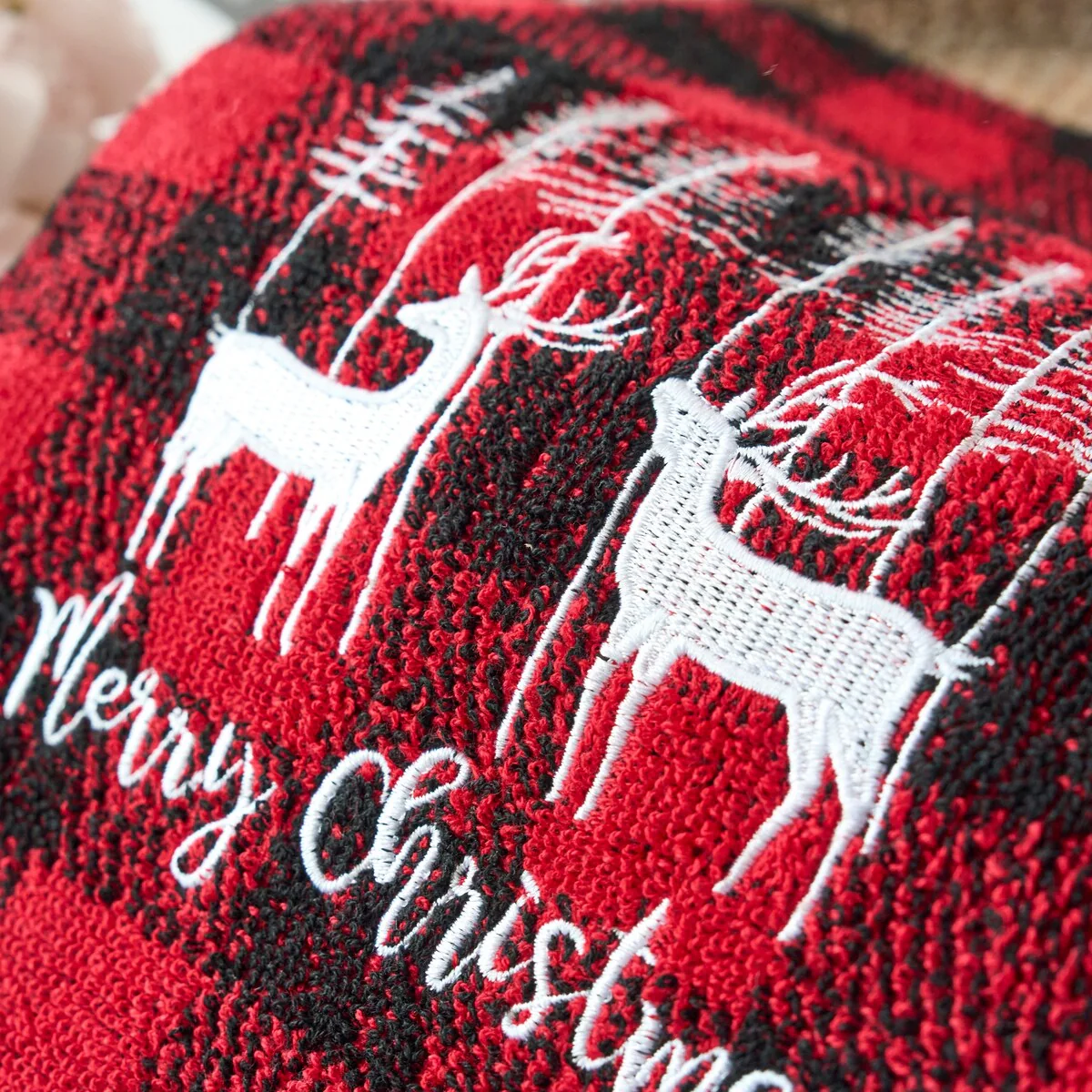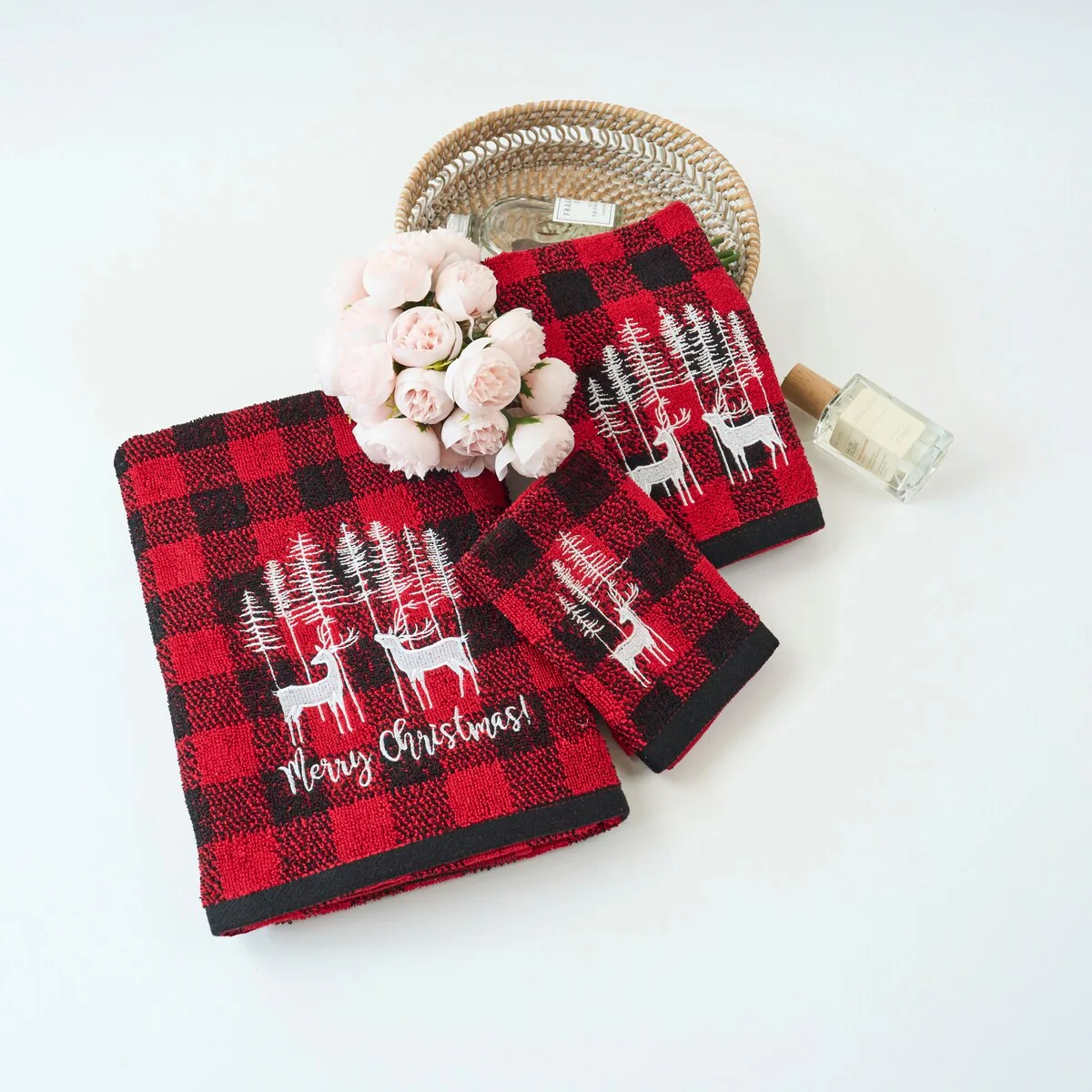 Xmas Premium Decor Soft 100% Cotton Embroidered Bathroom Modern 3 Piece Christmas Towel Set, Red Black Plaid Christmas Reindeer