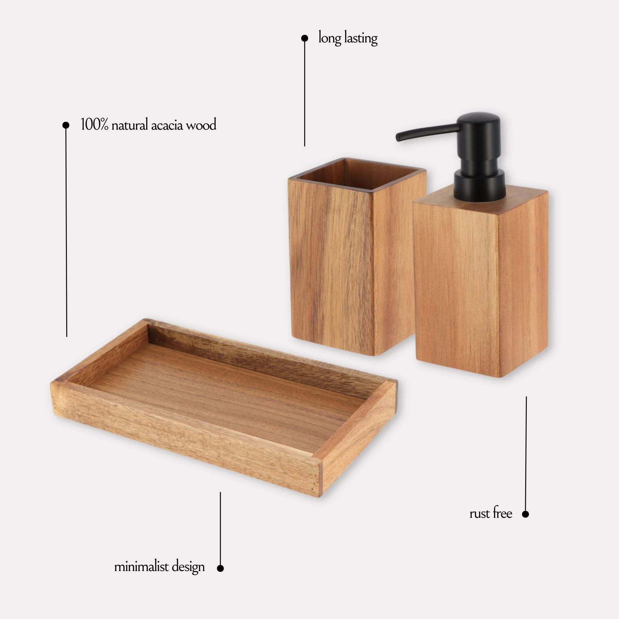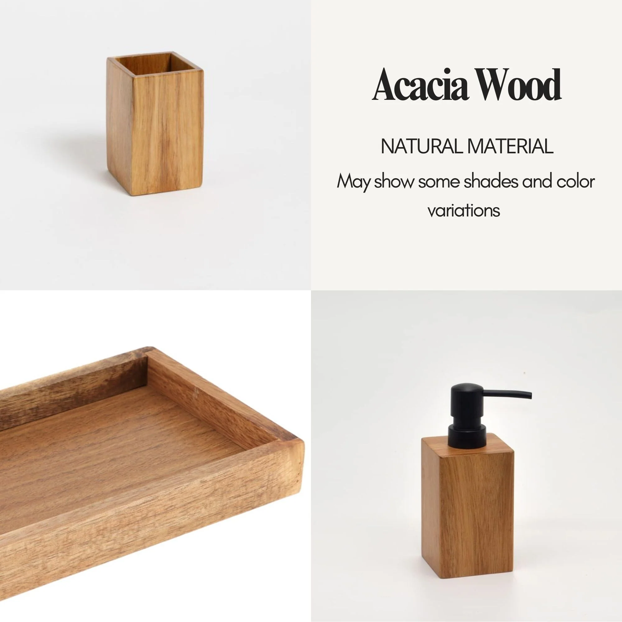 Acacia Bathroom Accessory Set 3-Pieces Rectangular - tumbler, soap dispenser and a rectangular tray