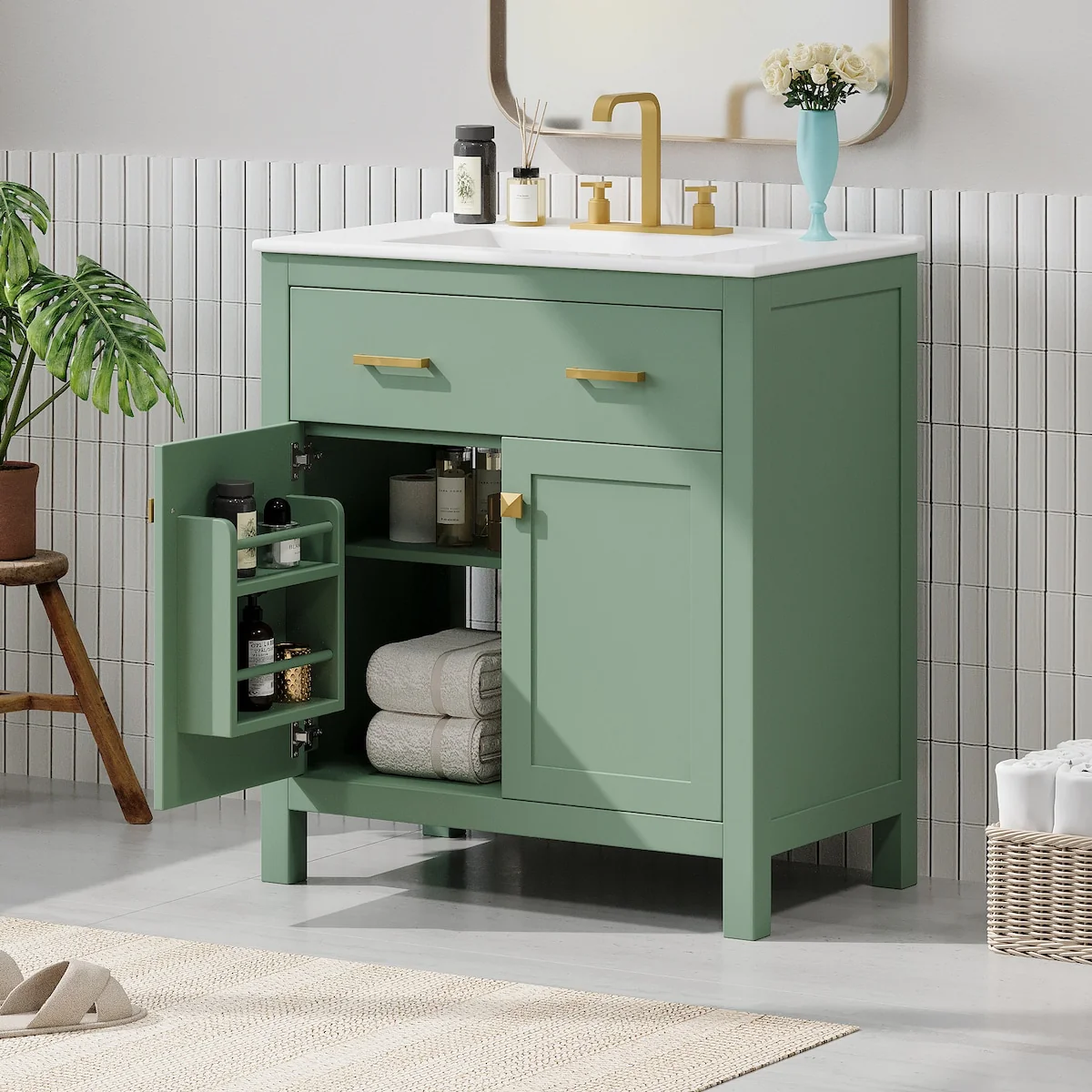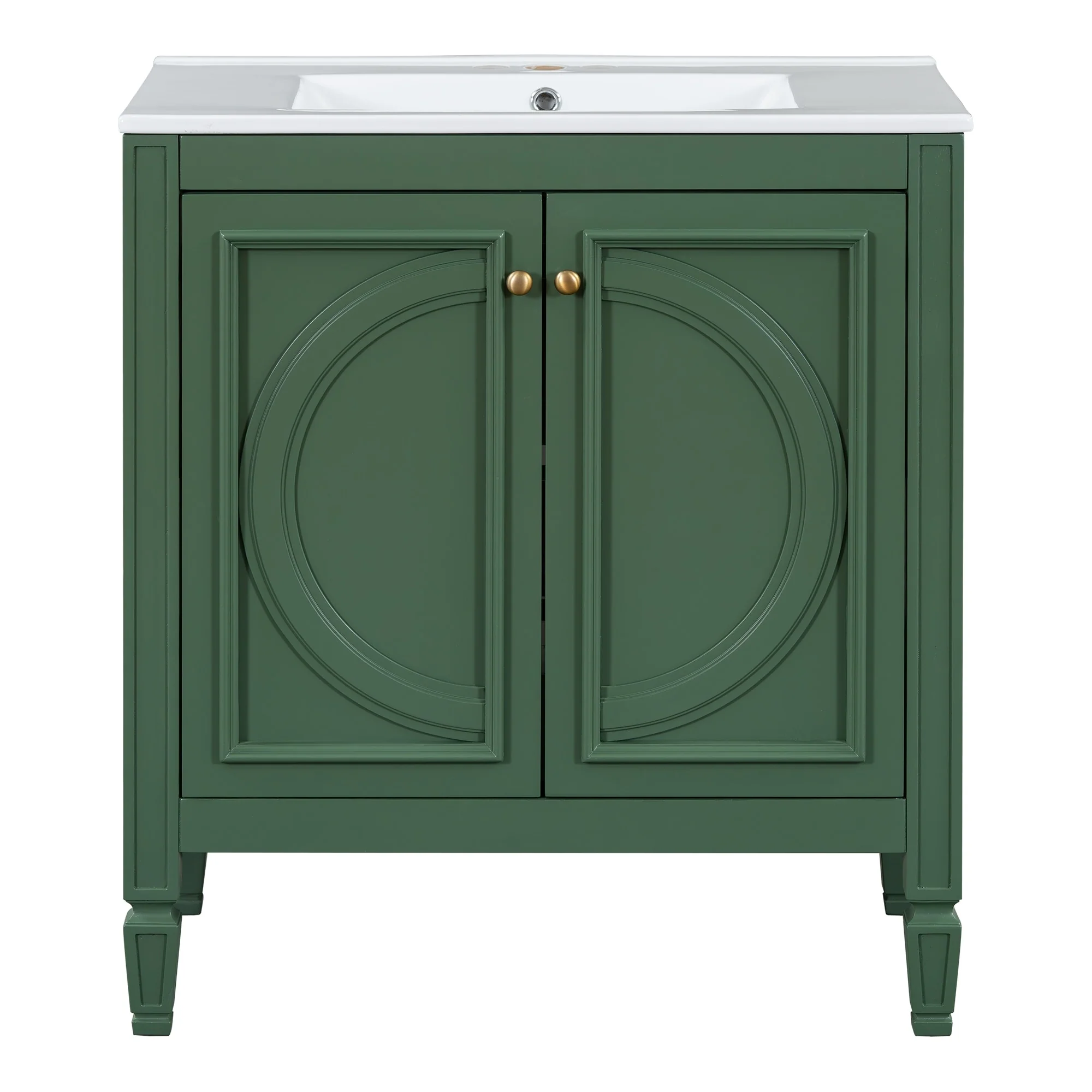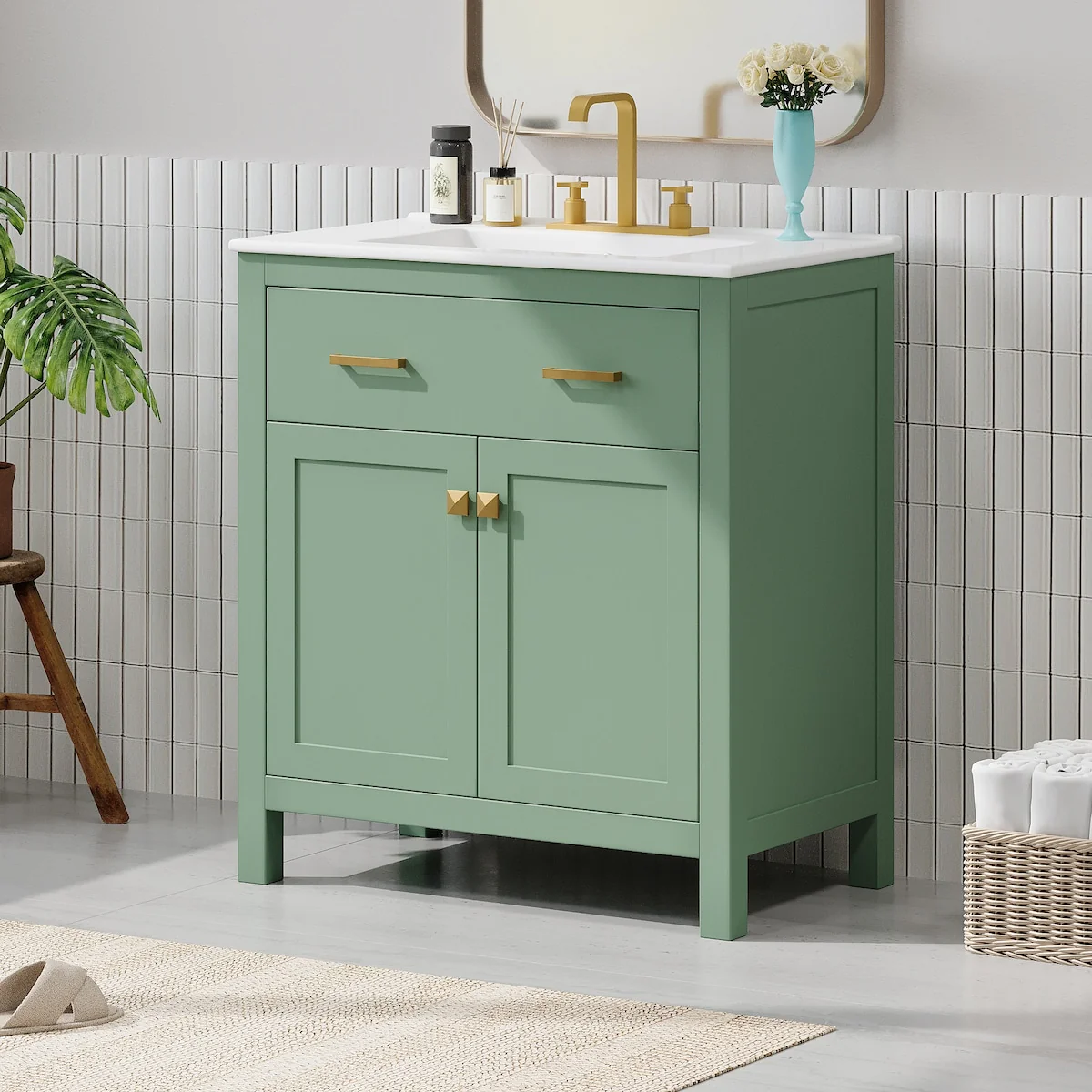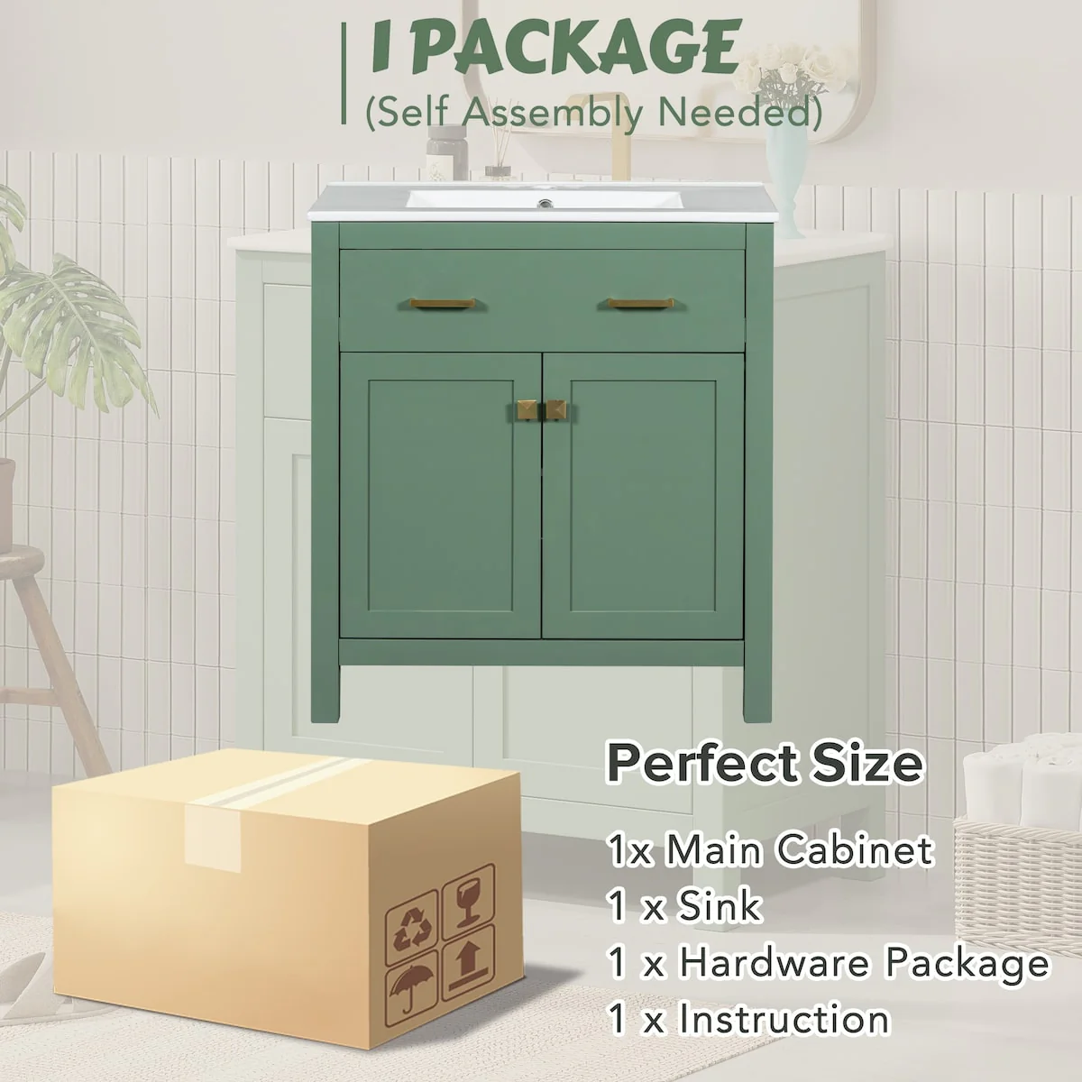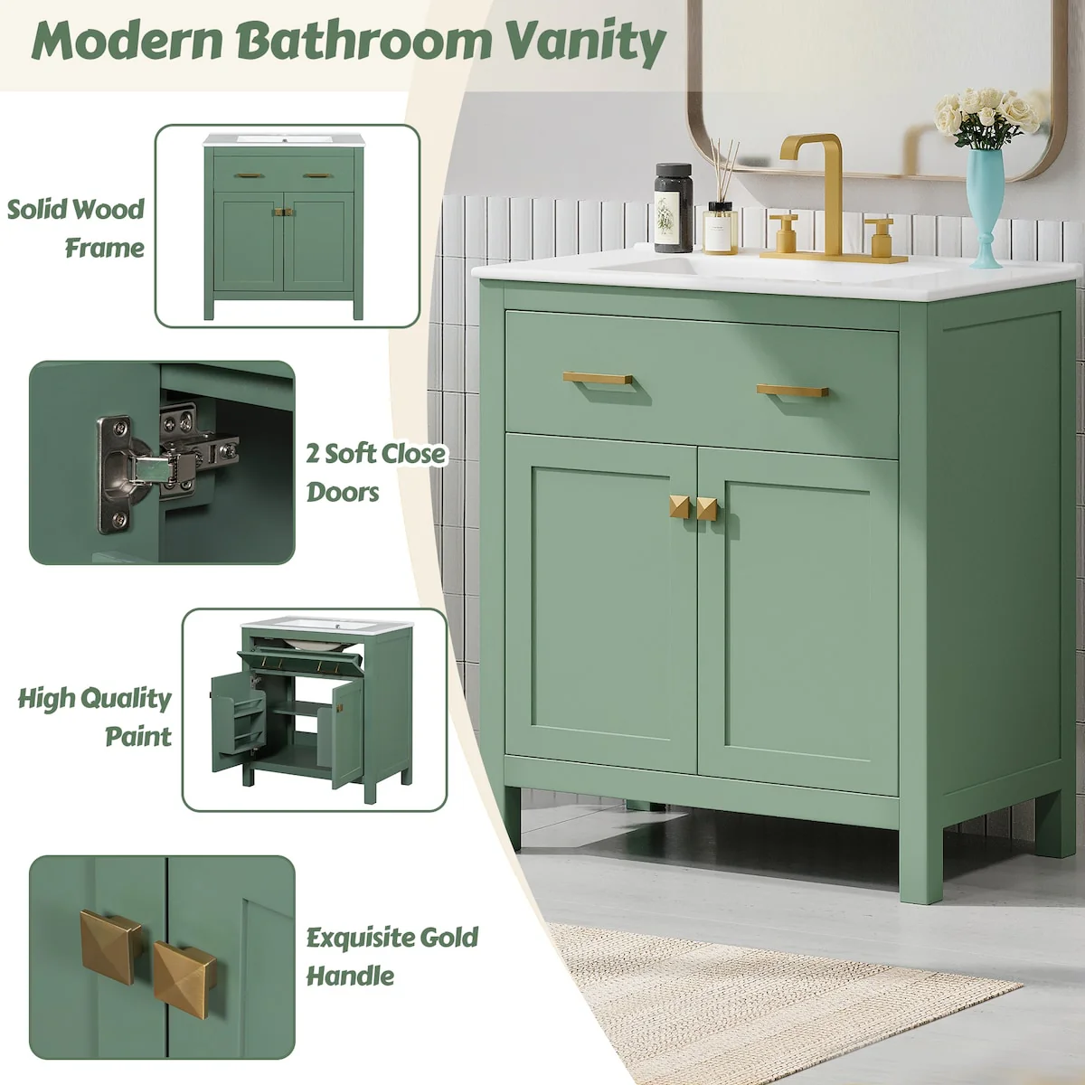 30-inch Bathroom Vanity with Ceramic Sink, Modern Green Single Bathroom Cabinet with 2 Doors and a Shelf, Soft Close Doors