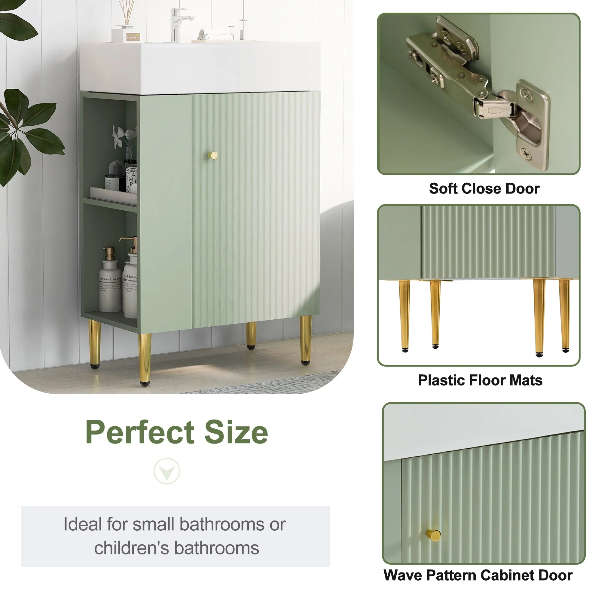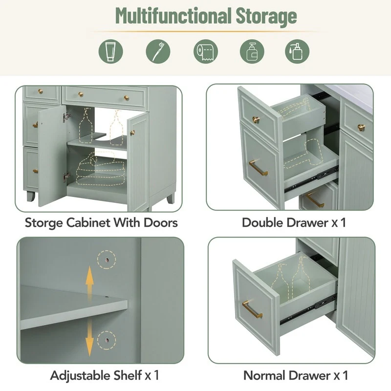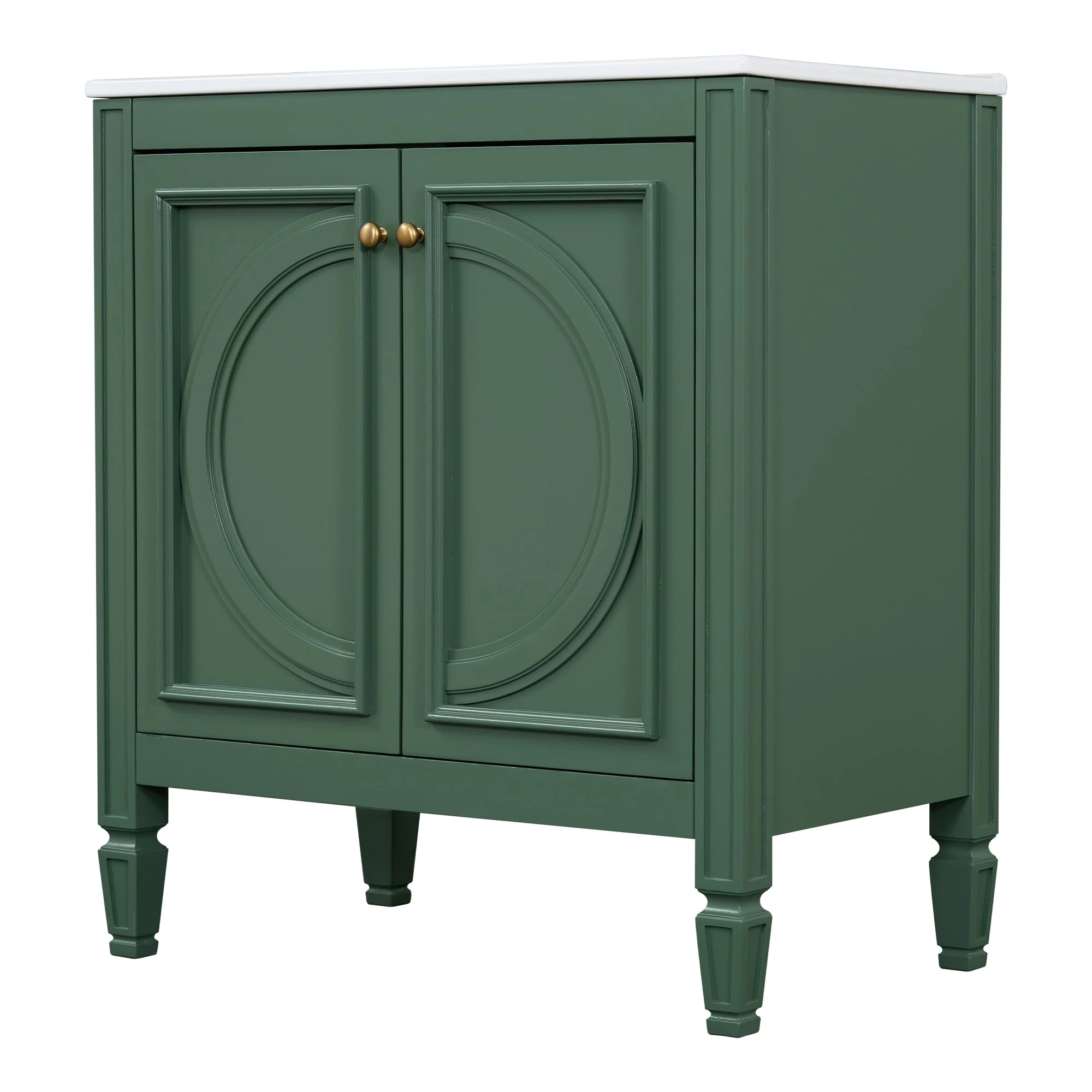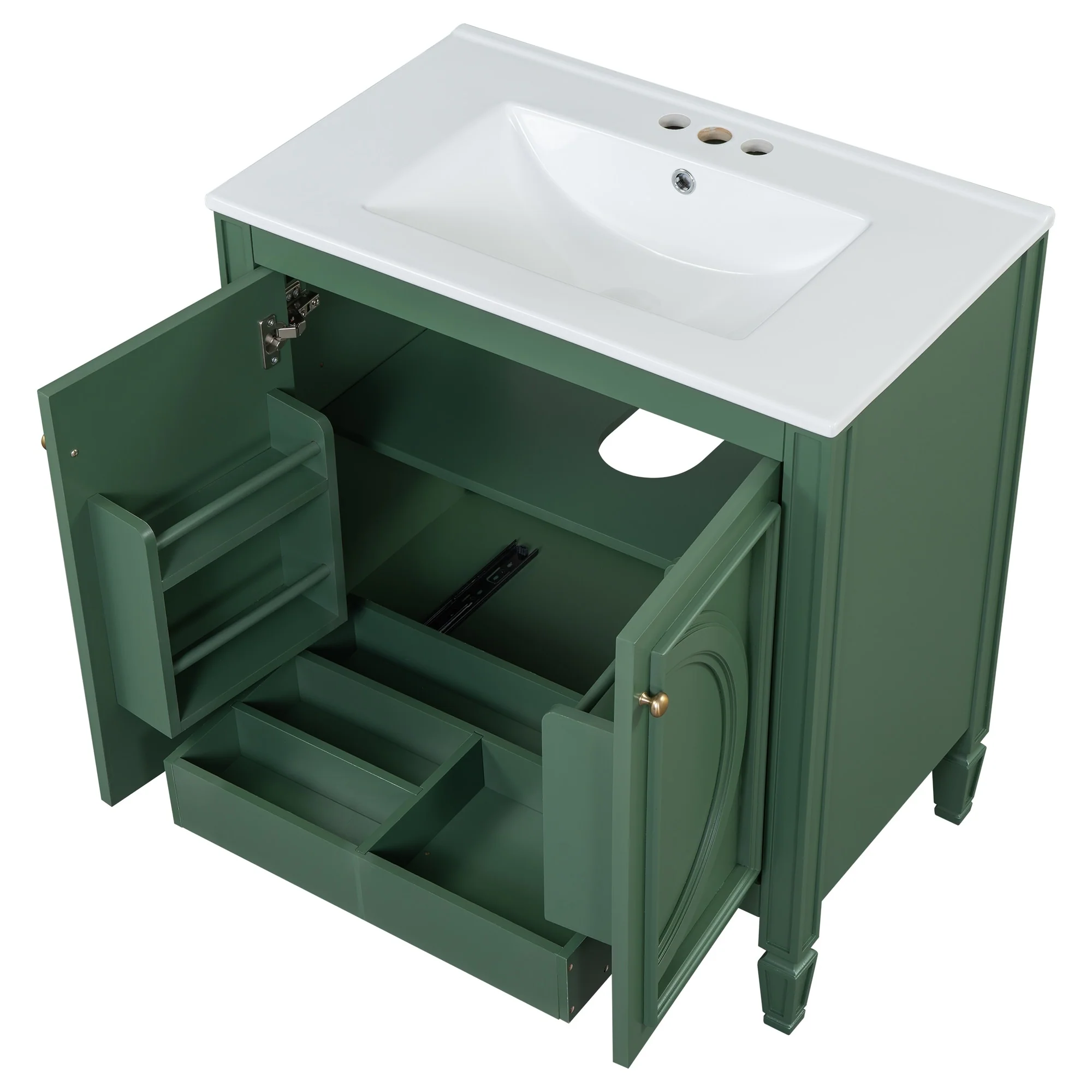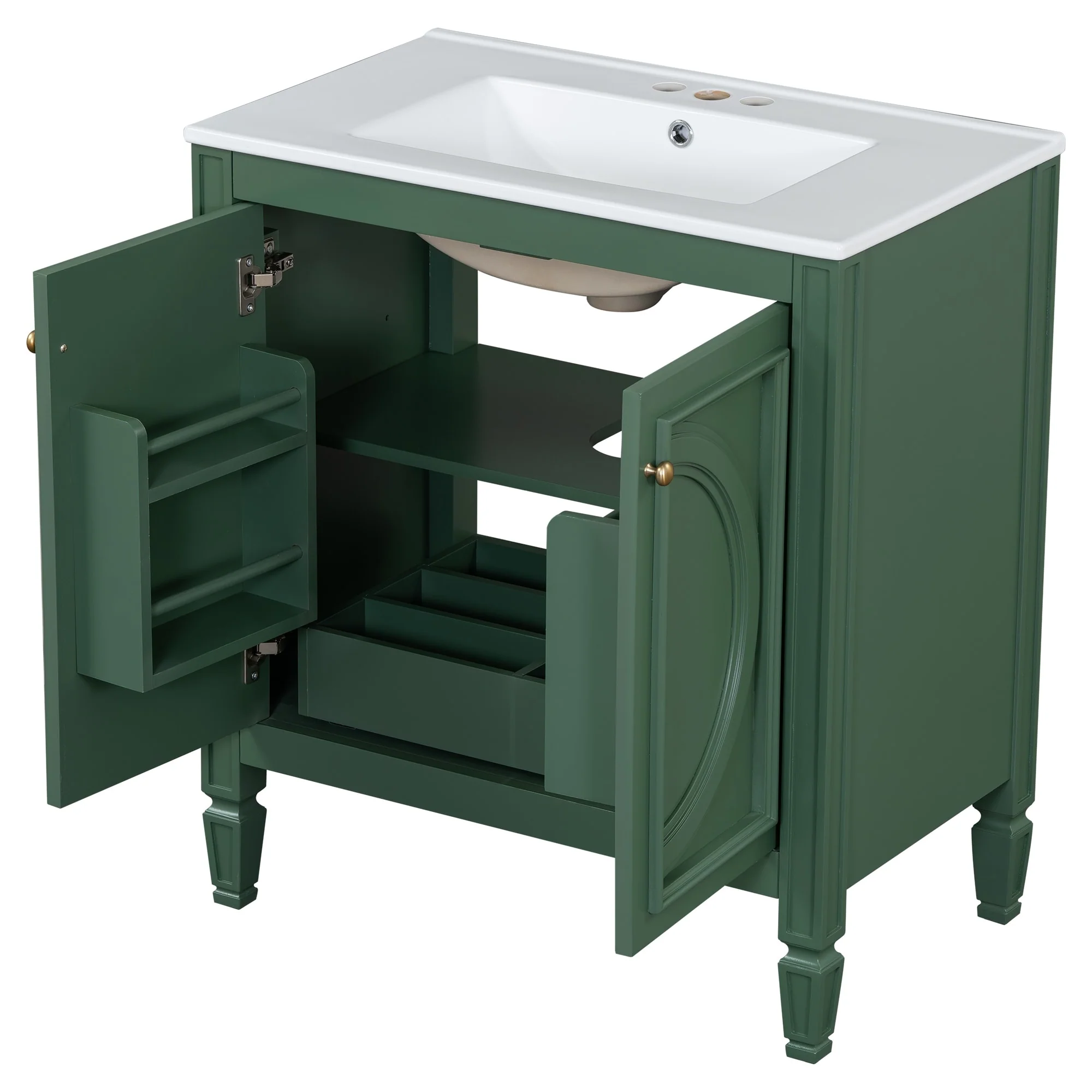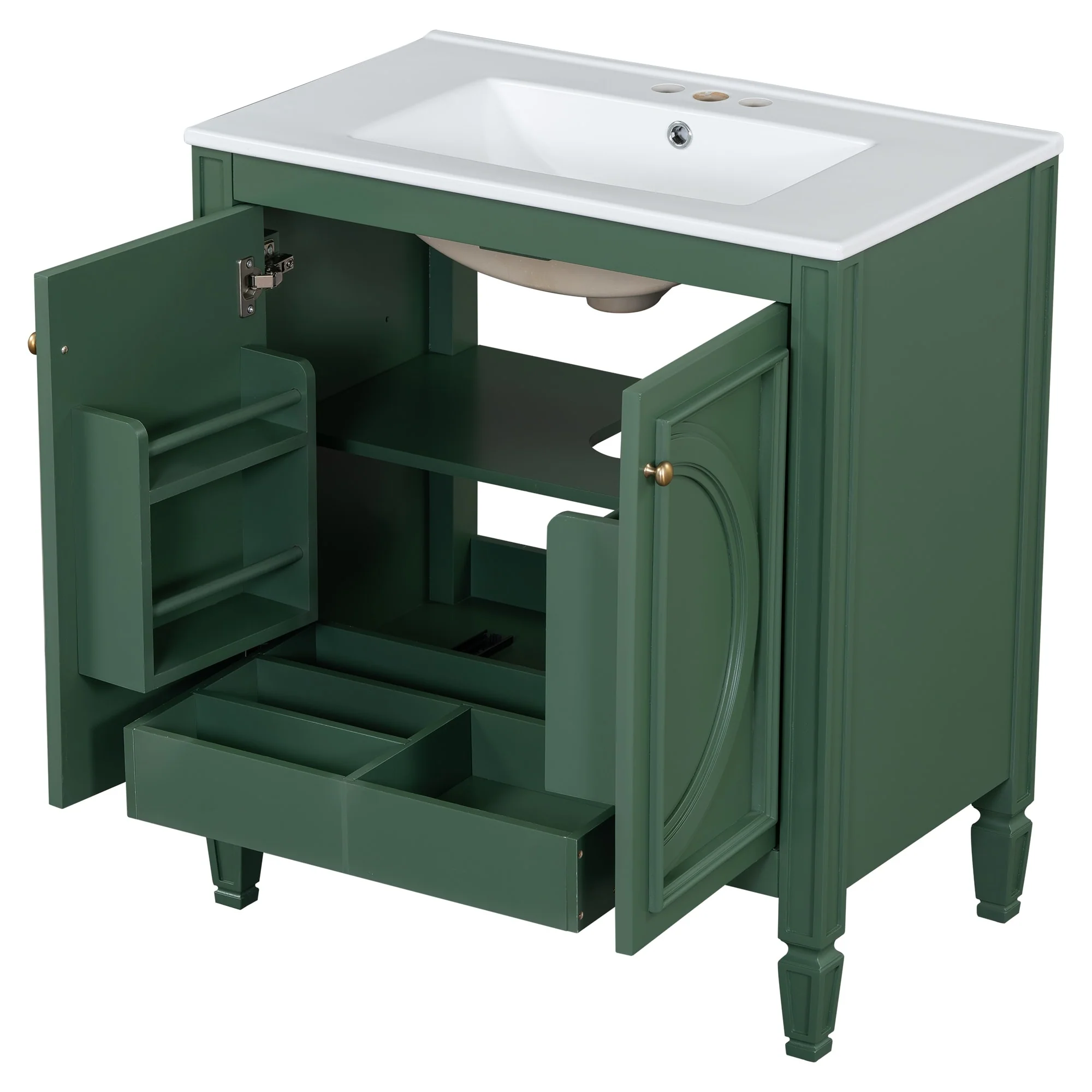 30-inch Bathroom Vanity with Ceramic Sink, Modern Green Single Bathroom Cabinet with 2 Doors and a Shelf, Soft Close Doors