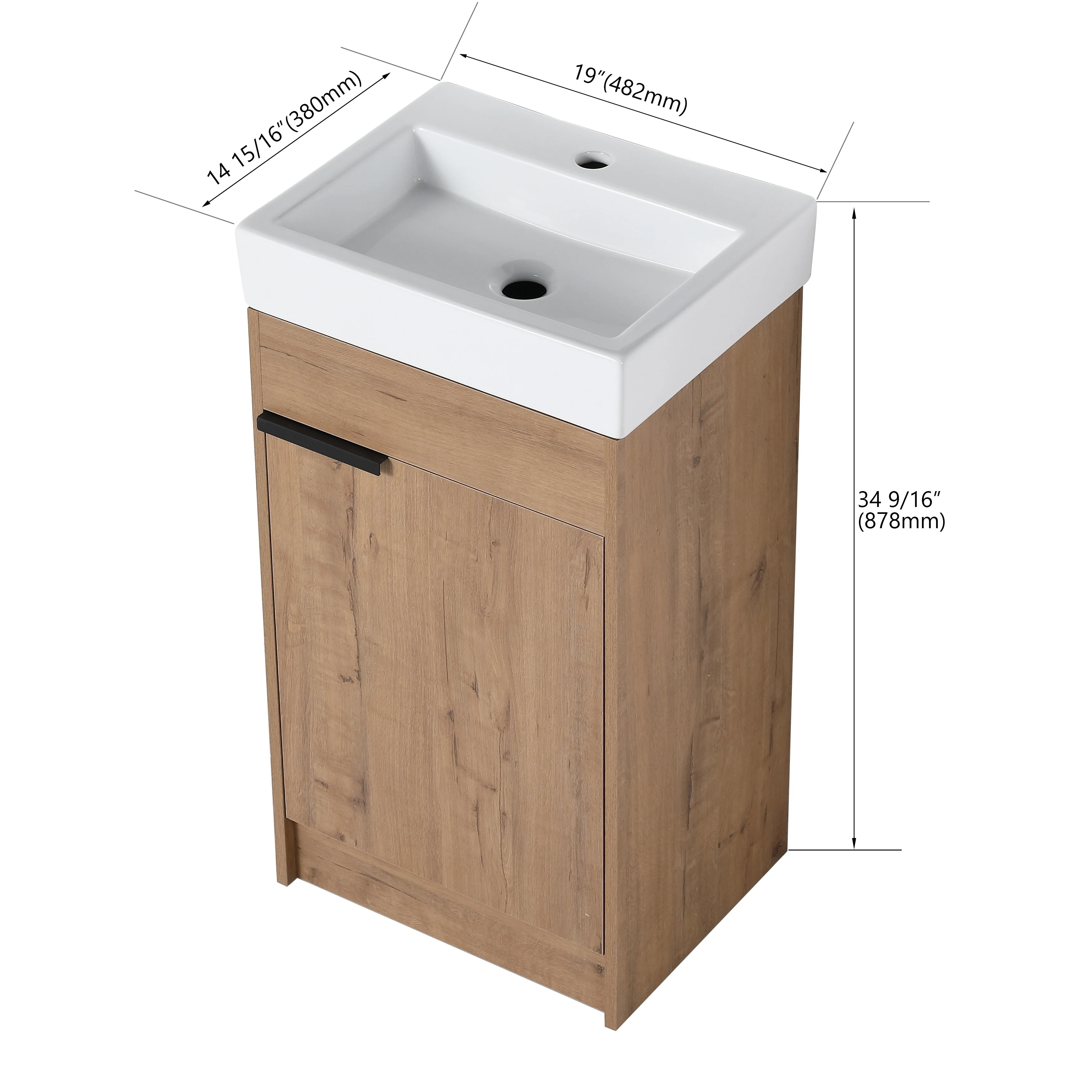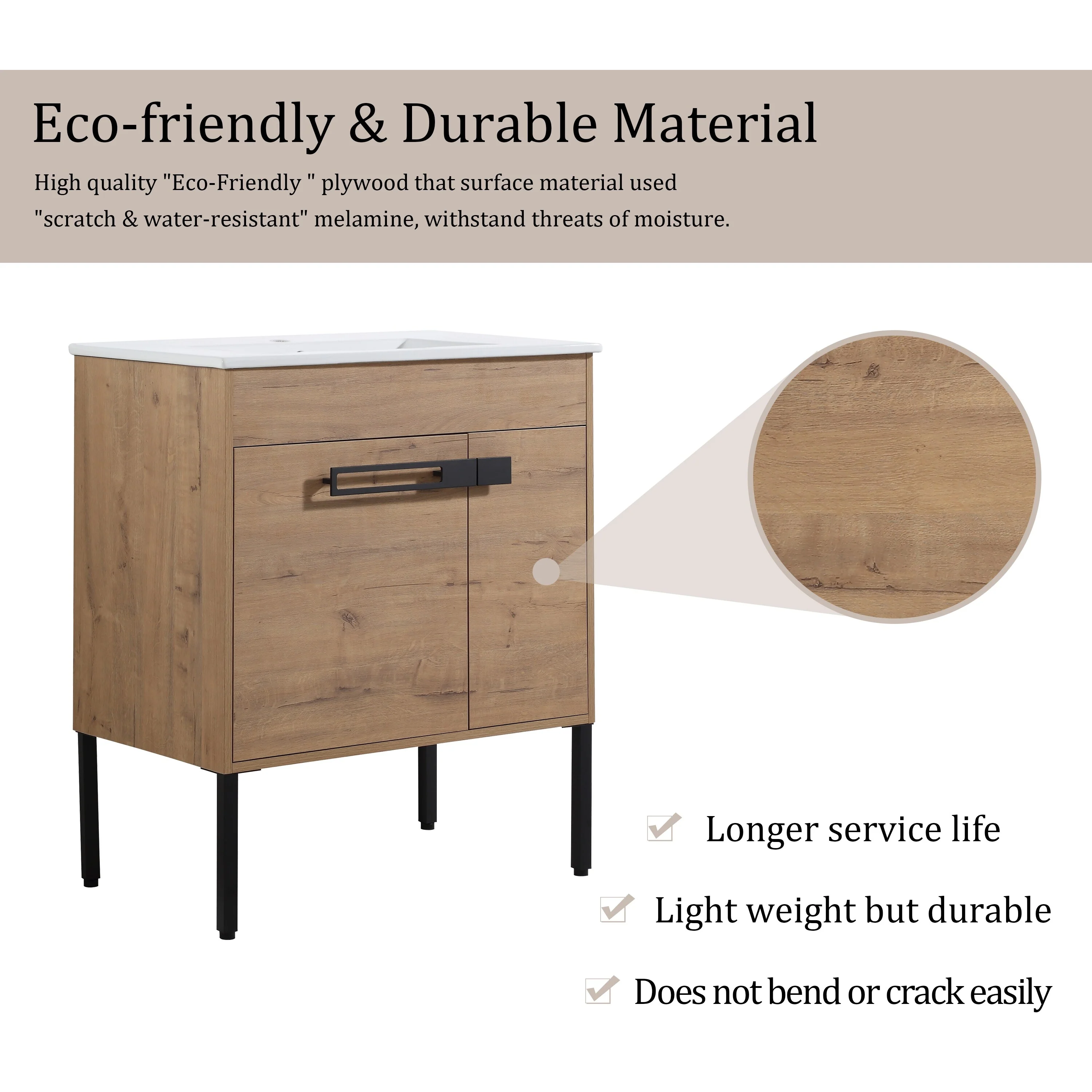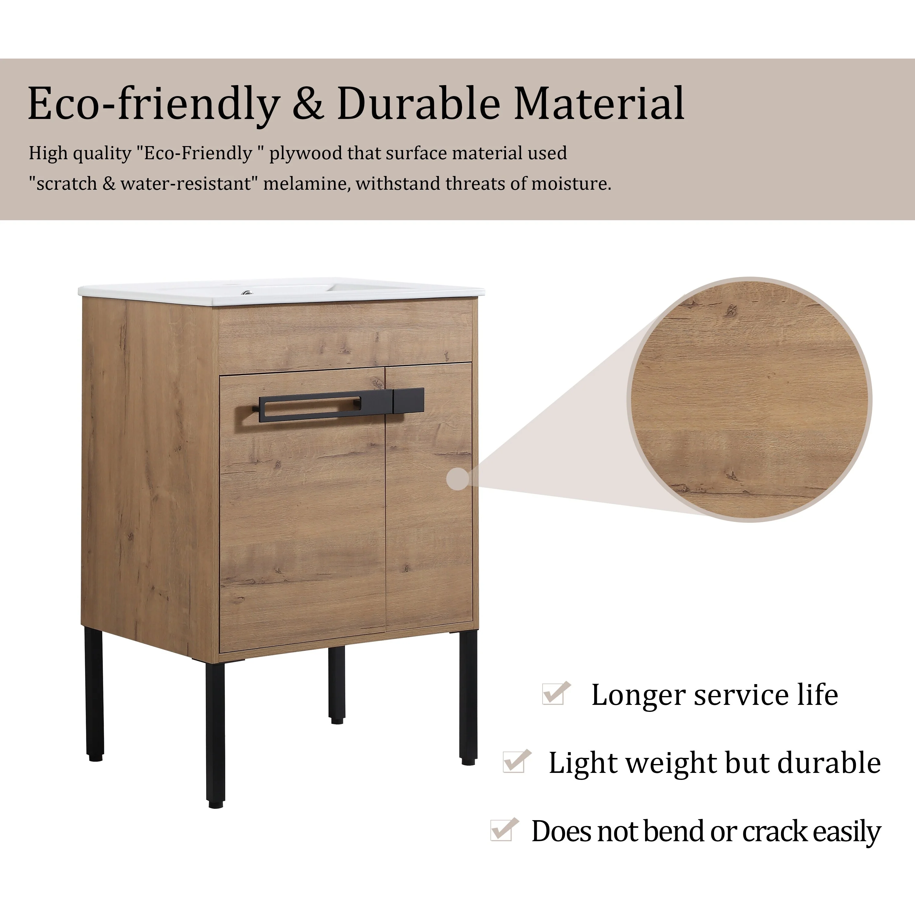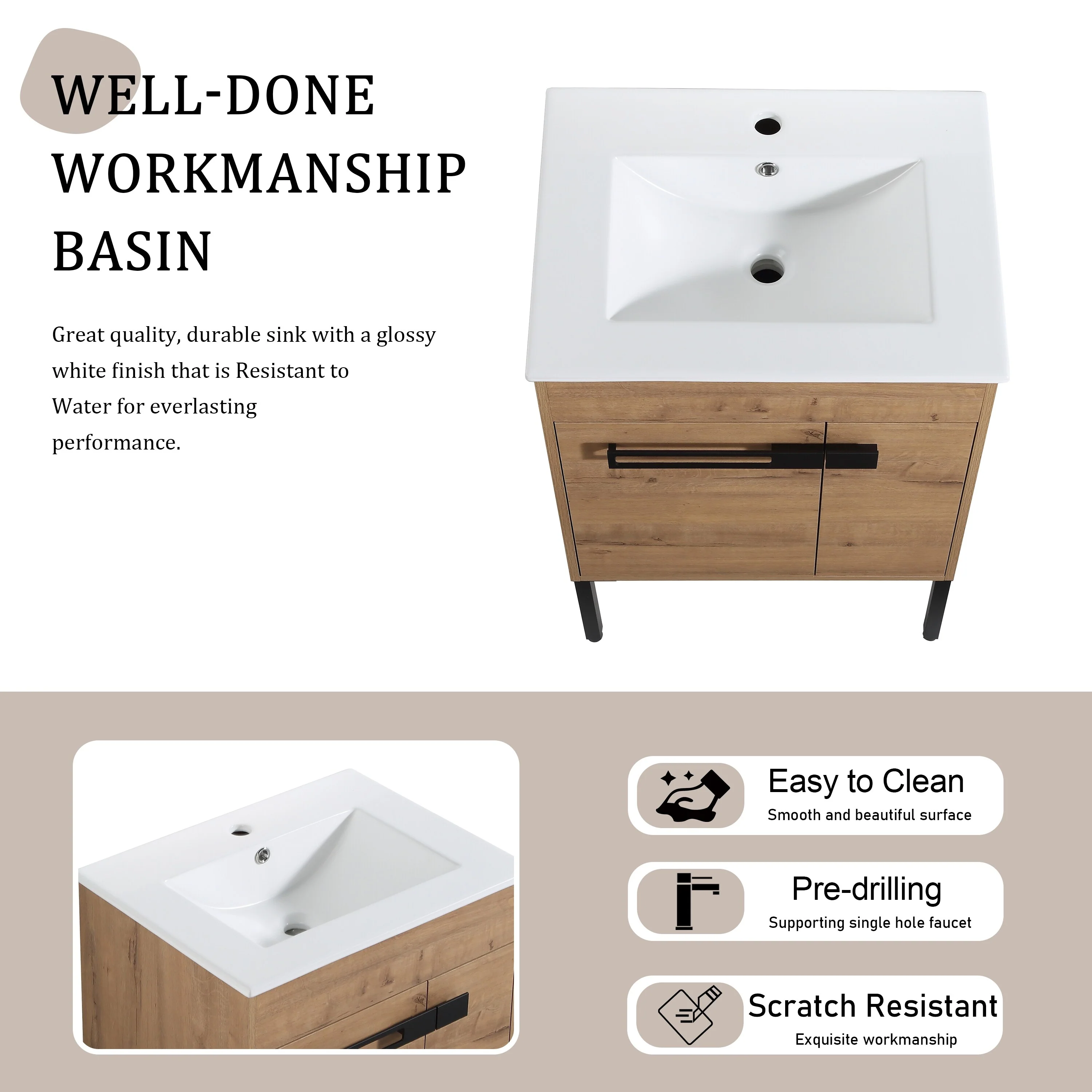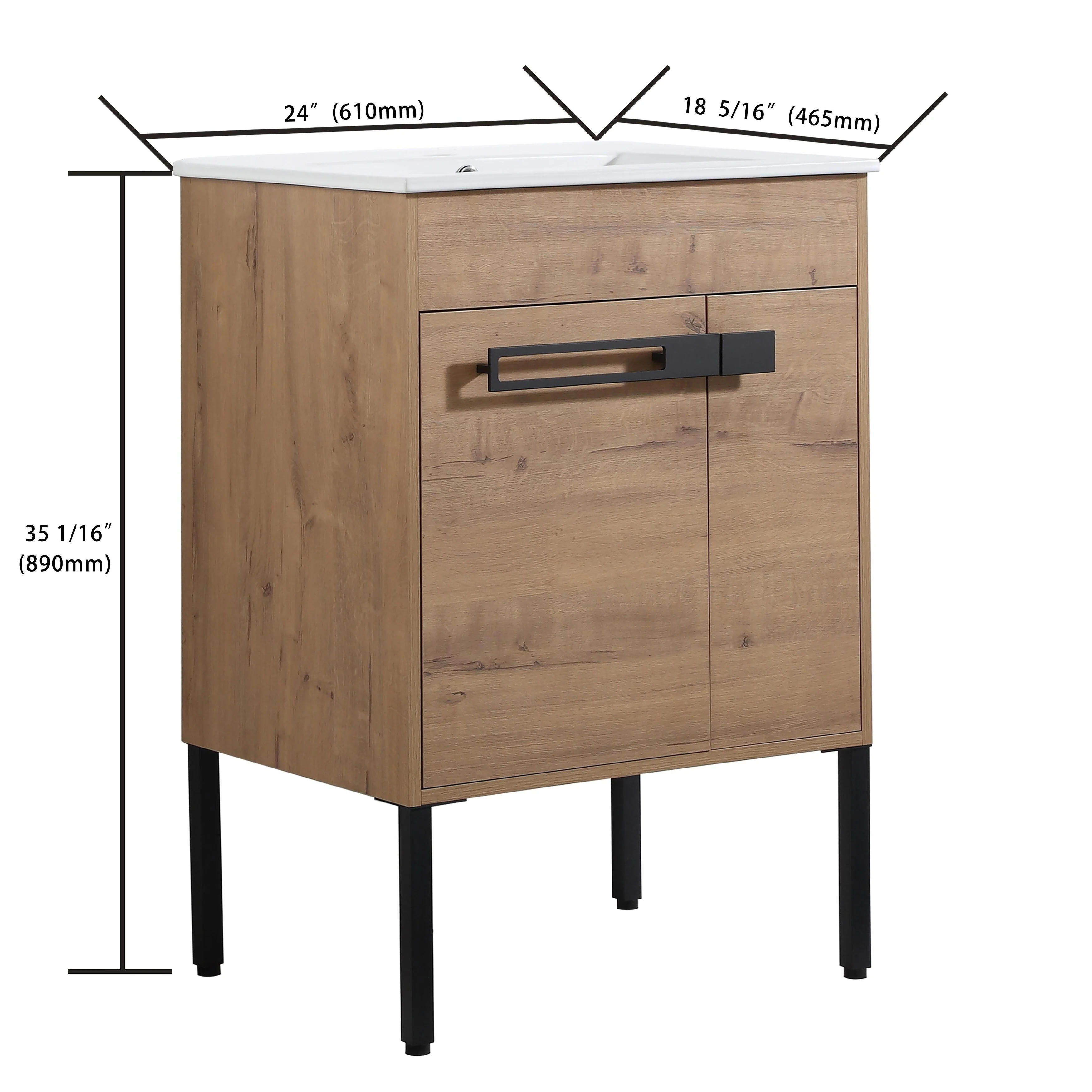 24" Bathroom Vanity Sink Combo Oak Cabinet Vanity Tempered Glass/Ceramic Sink