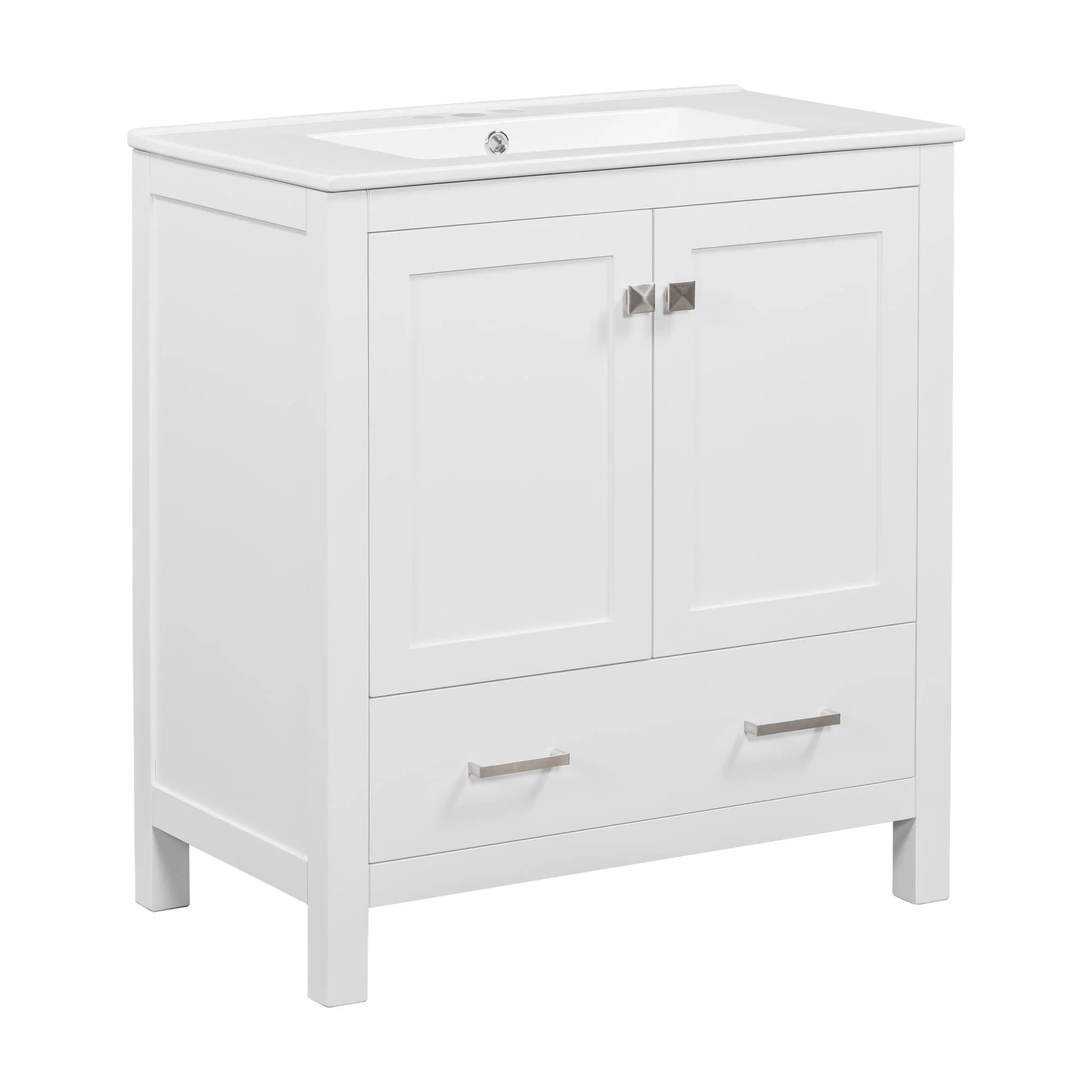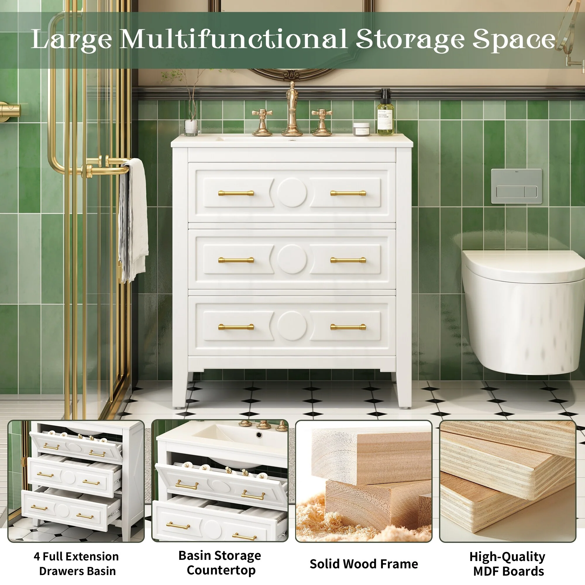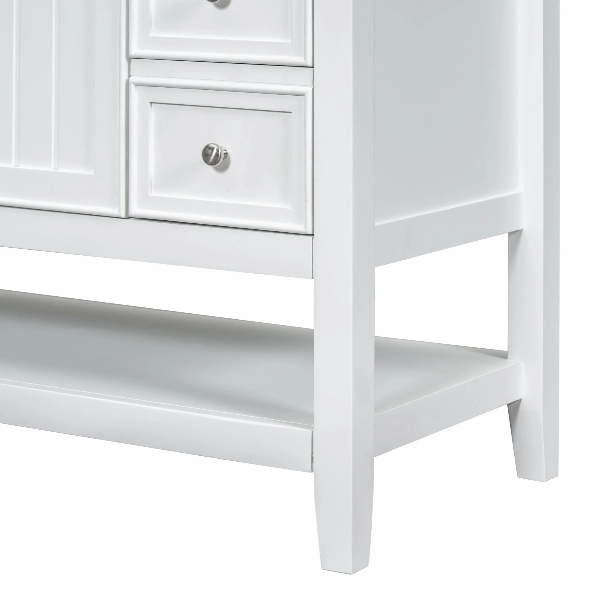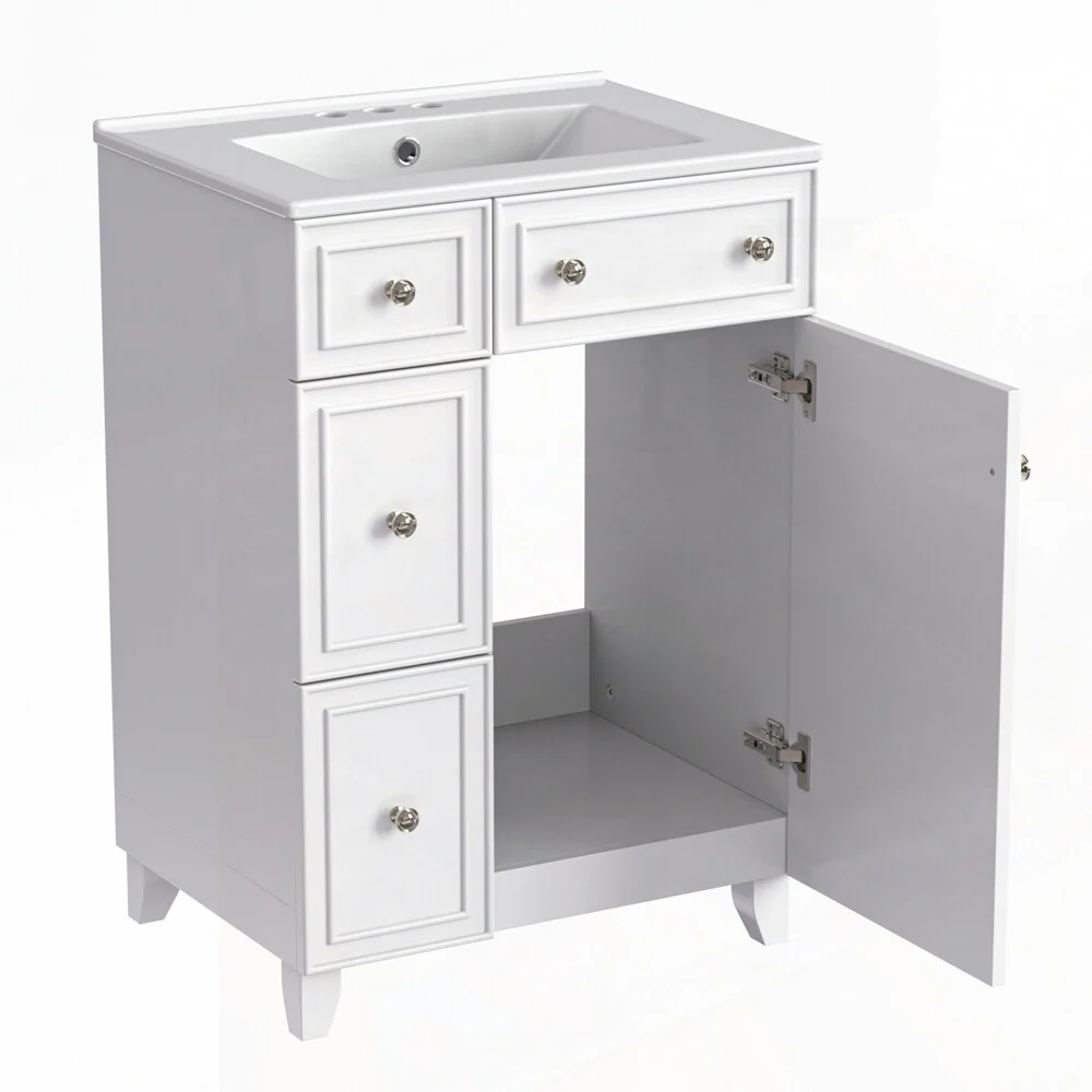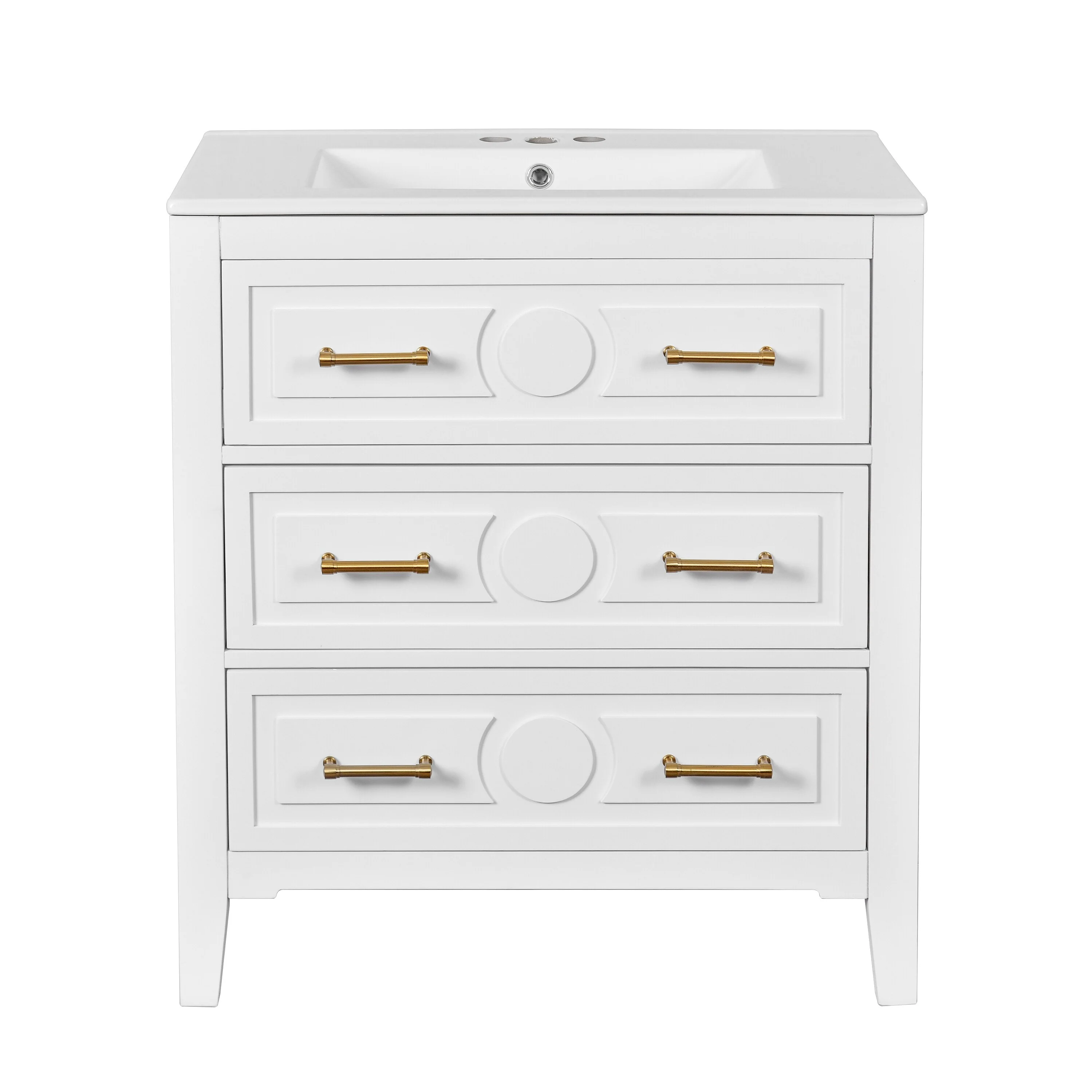 30" White Bathroom Vanity with Ceramic Sink and 3 Drawers, Retro Free-Standing Vanity Set - 30 in W Ceramic,Solid Wood+MDF