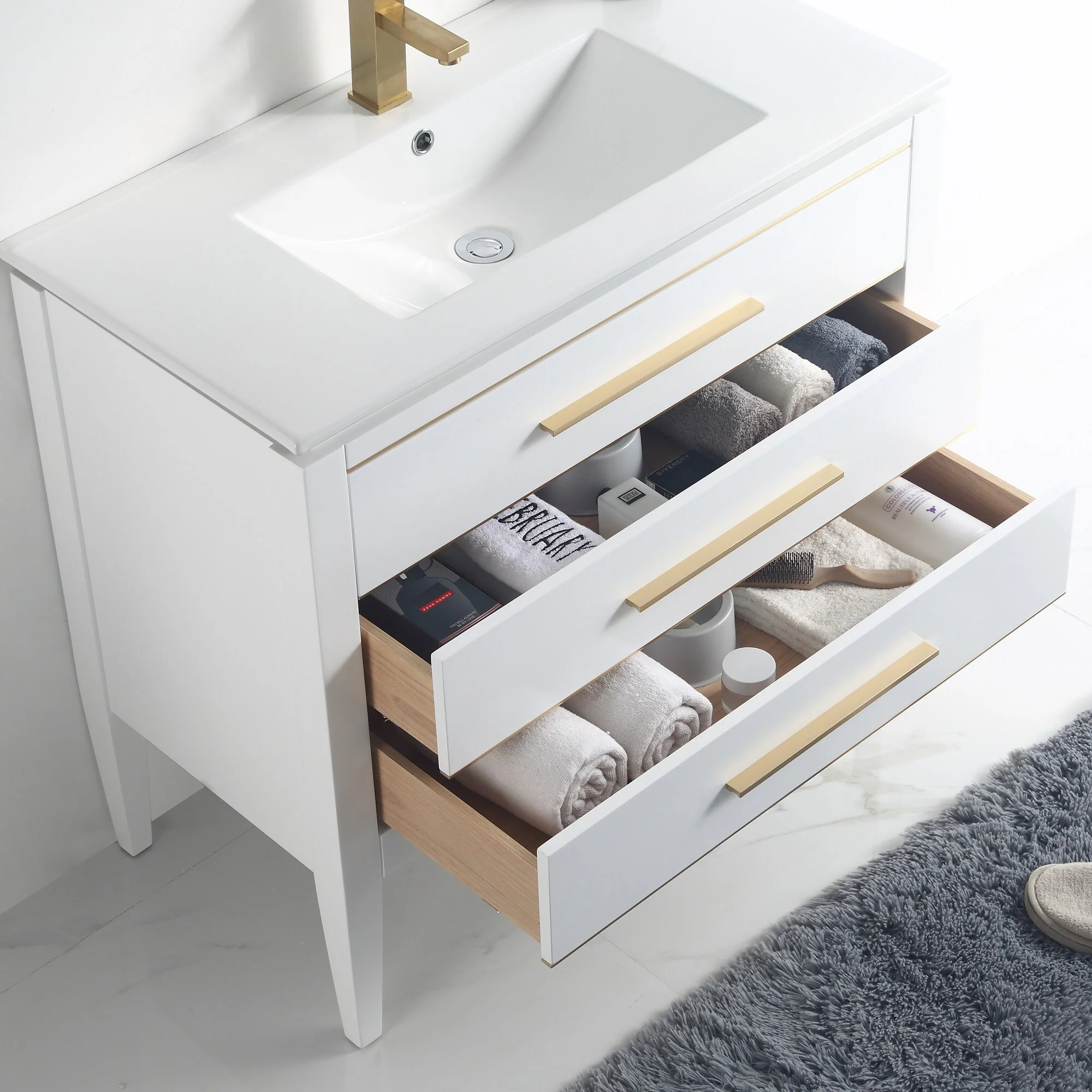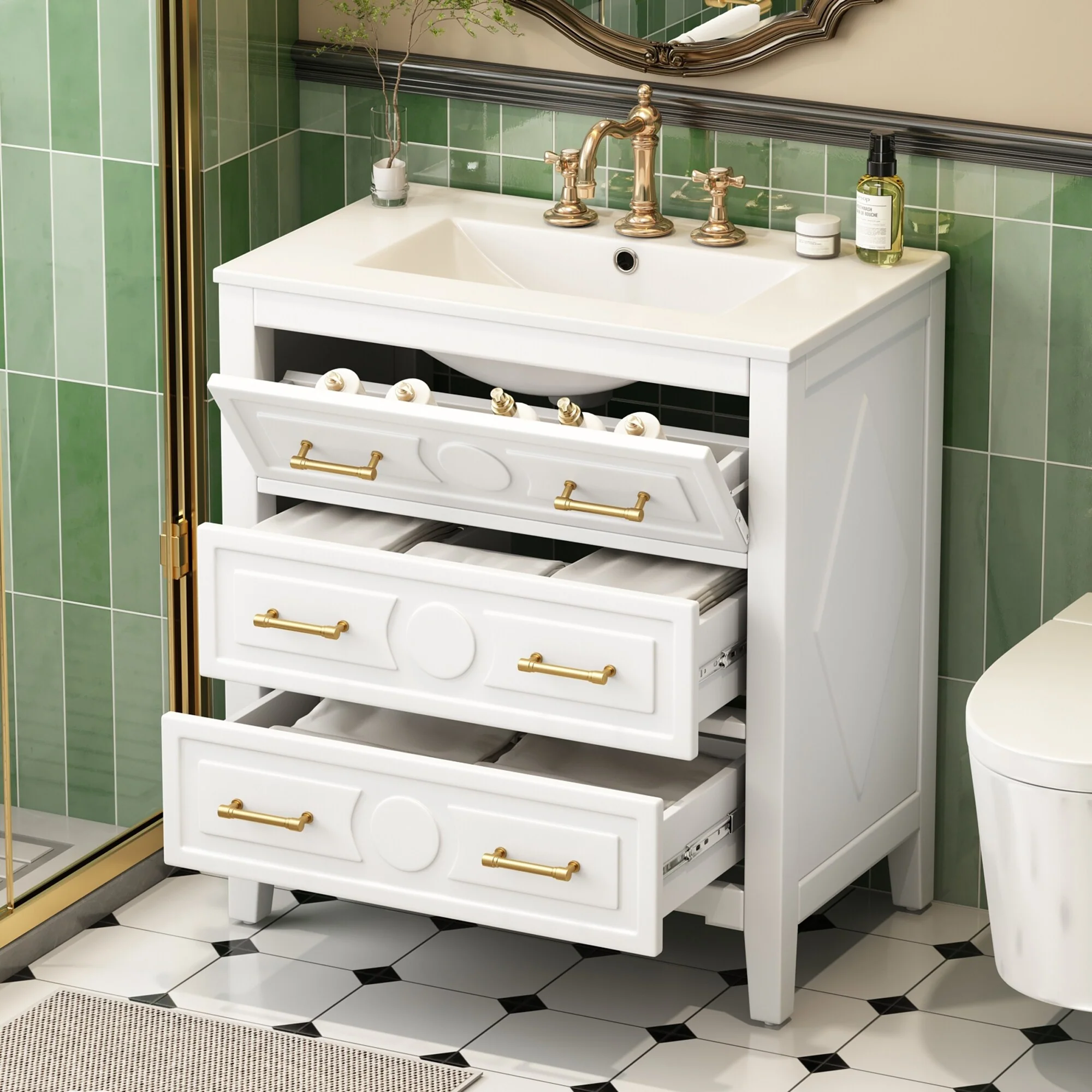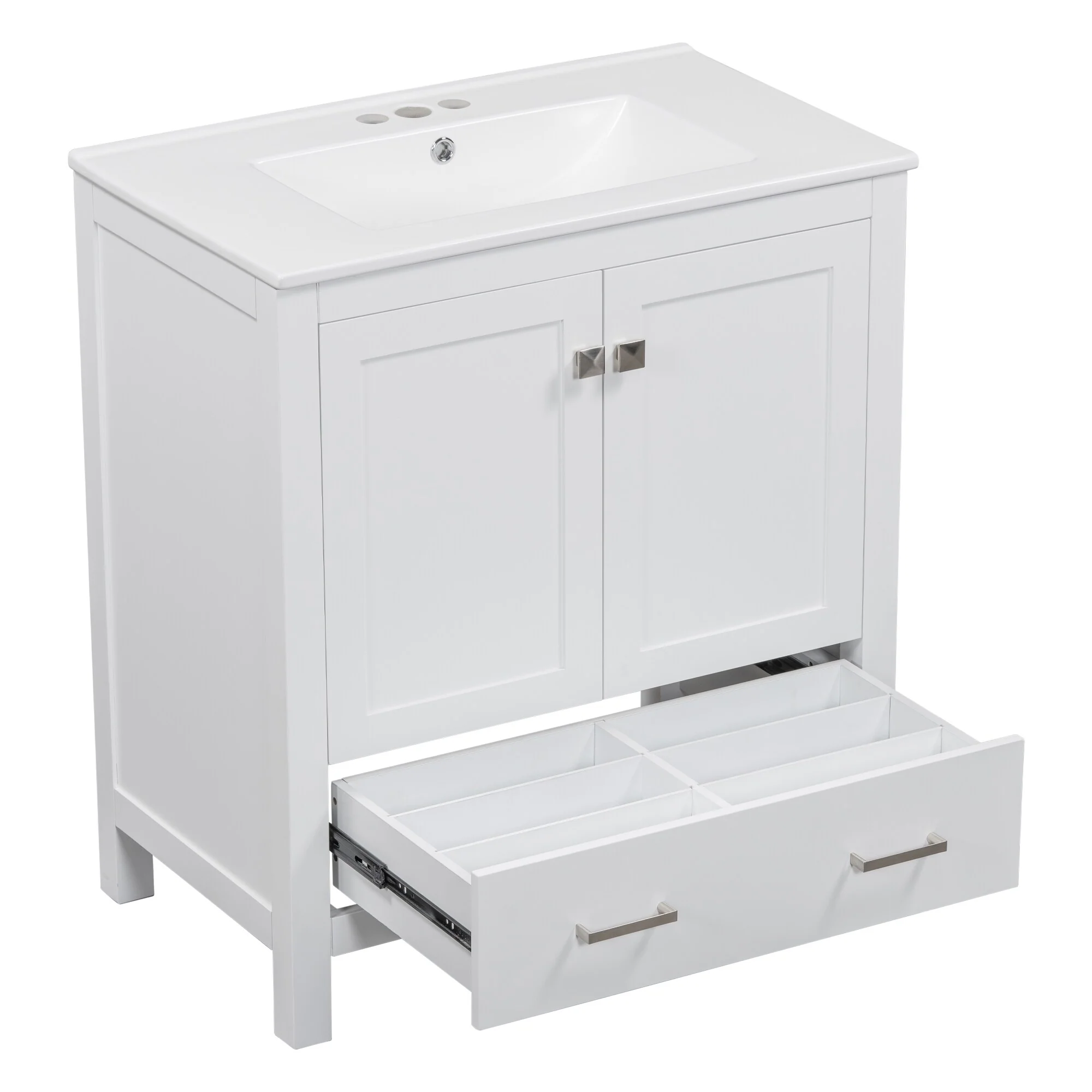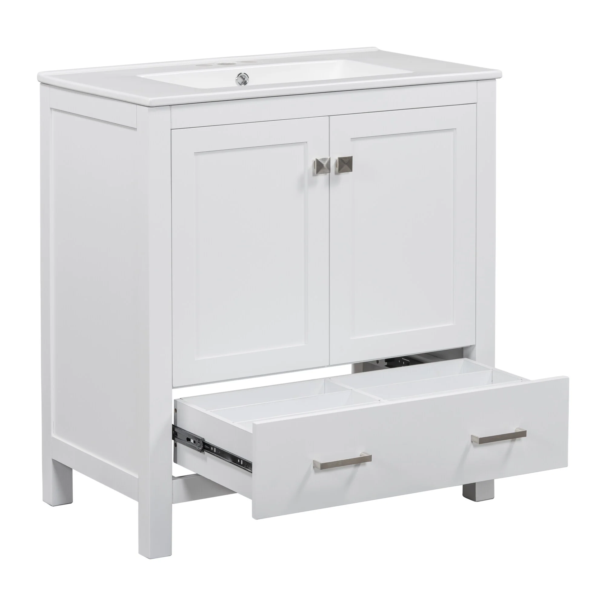 30" White Bathroom Vanity with Ceramic Sink and 3 Drawers, Retro Free-Standing Vanity Set - 30 in W Ceramic,Solid Wood+MDF