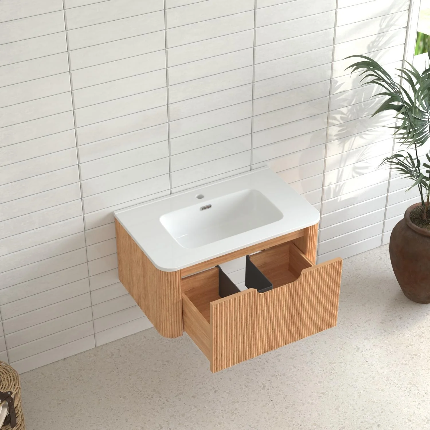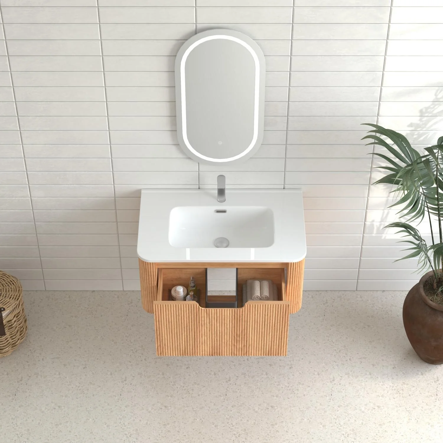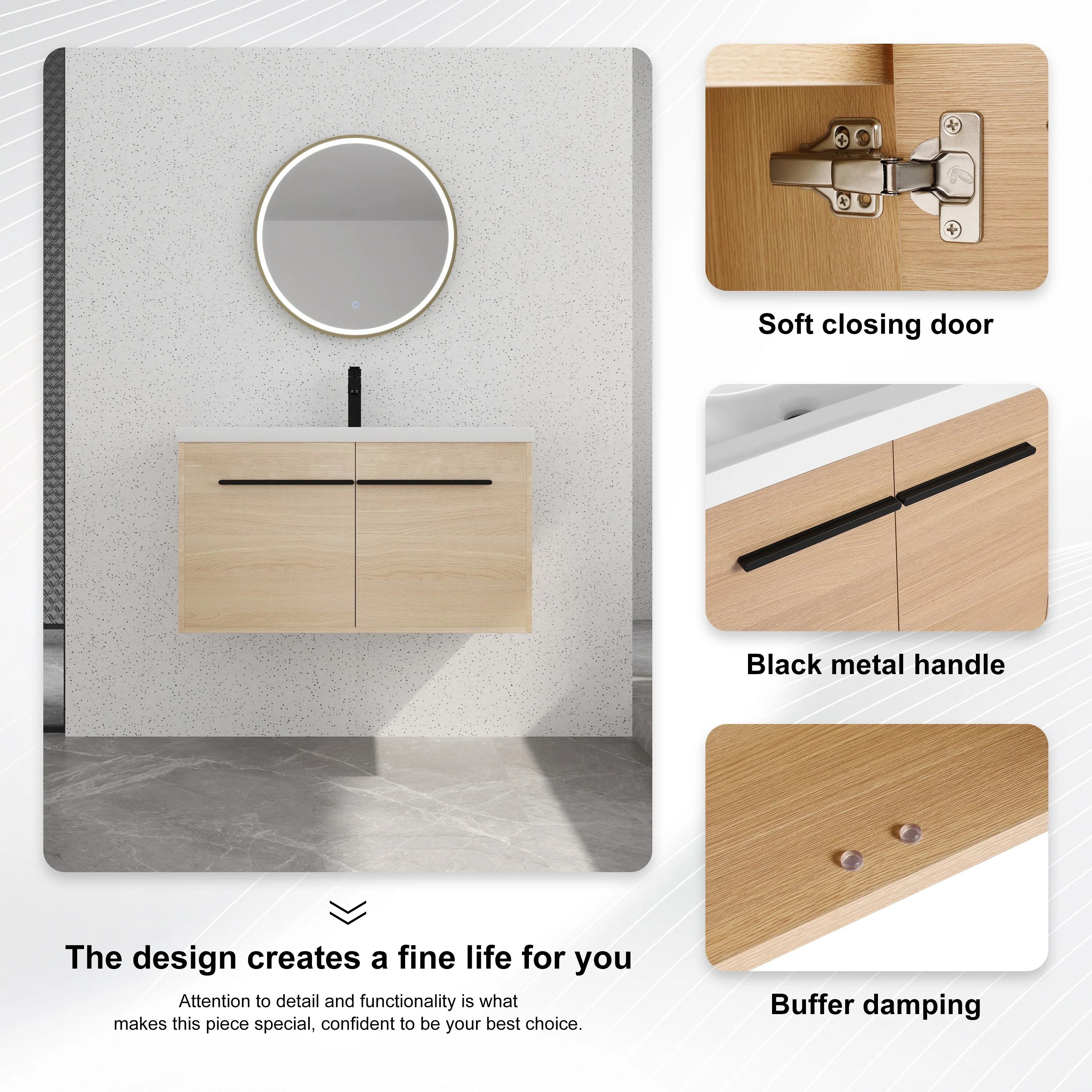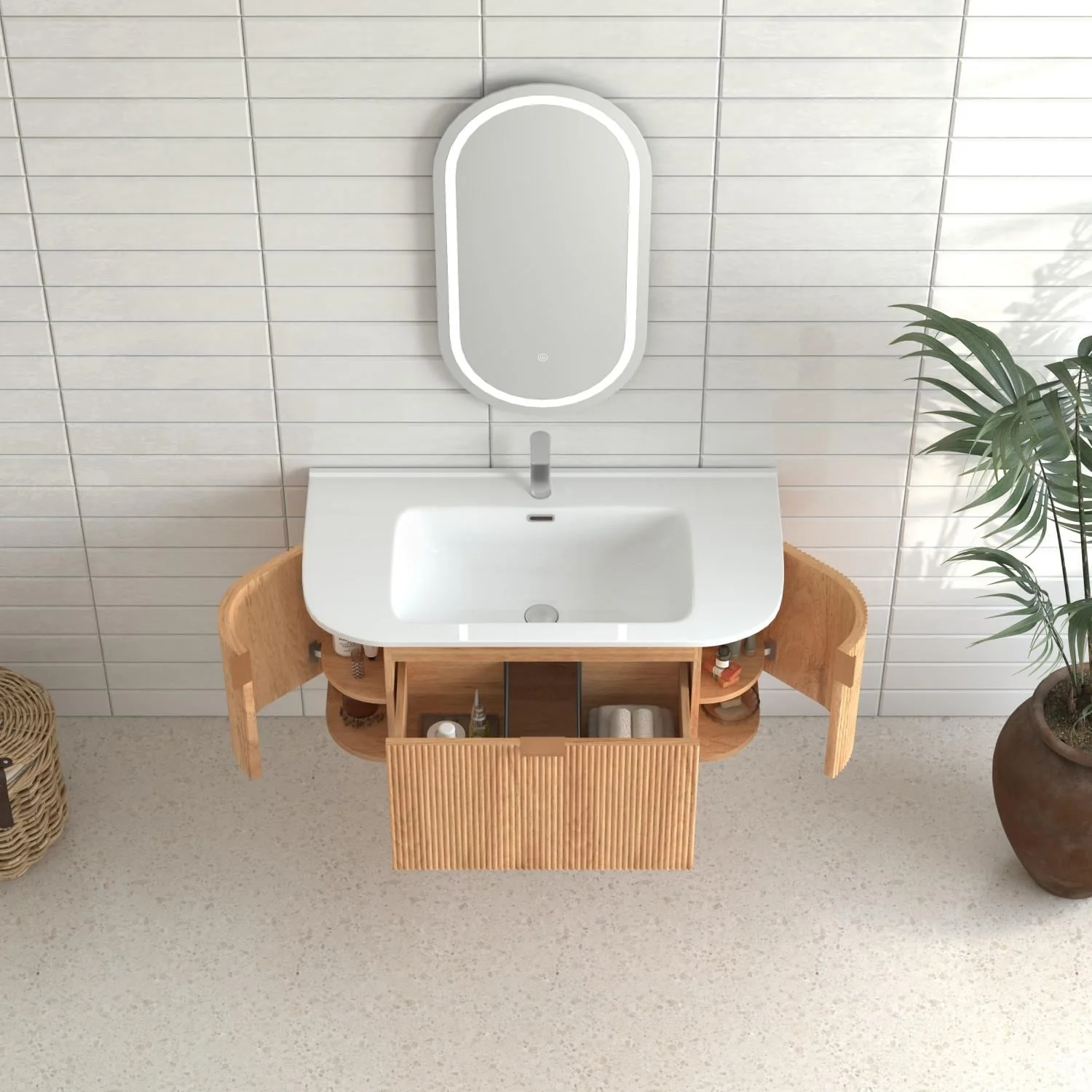 36" Bathroom Vanity with Basin, Wall-Mounted Floating Curved Edges Striped Bathroom Large Storage Cabinet with 2 Side Drawers