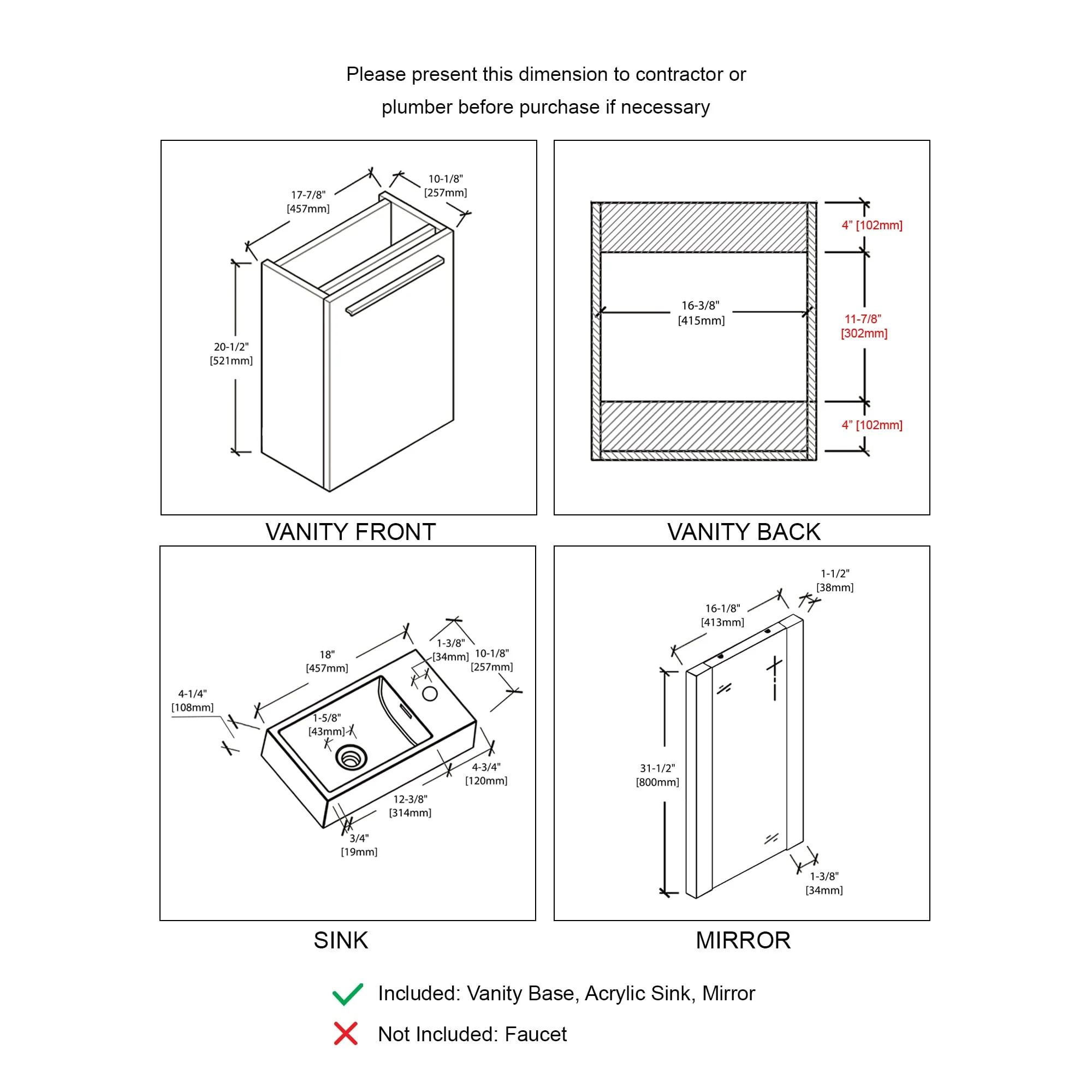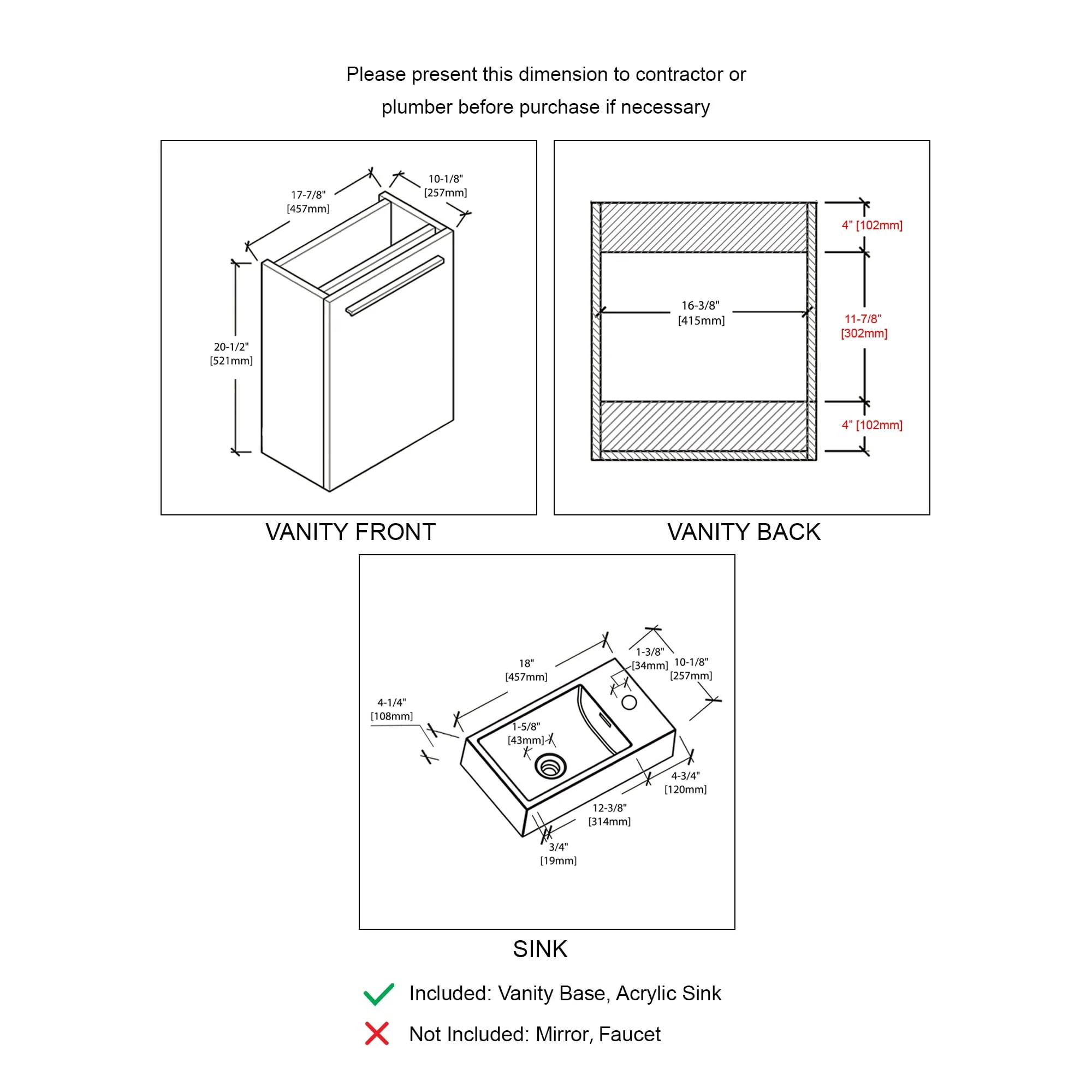 18" Floating Vanity / Wall Hung Vanity Set with Acrylic Sink , Available Mirror Option
