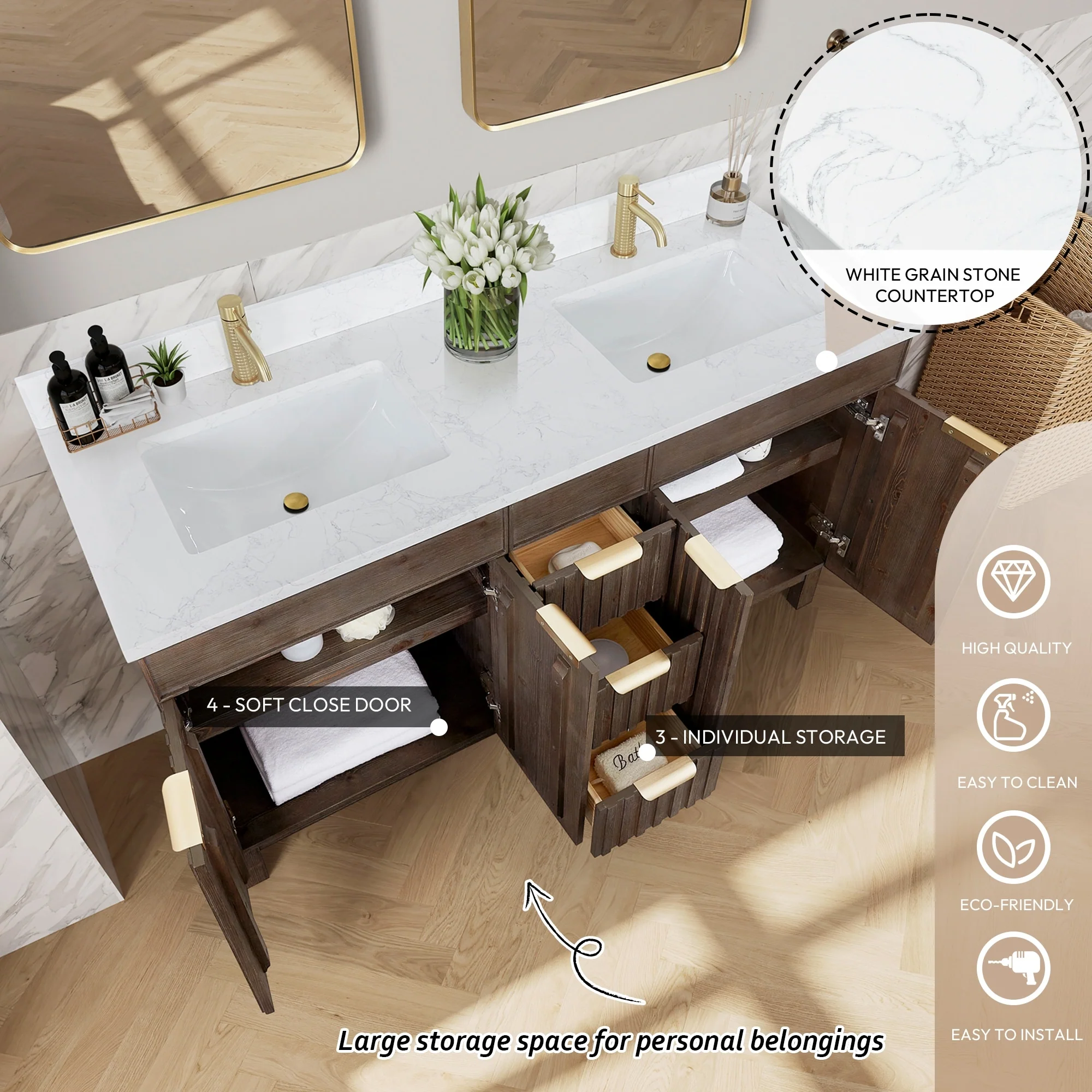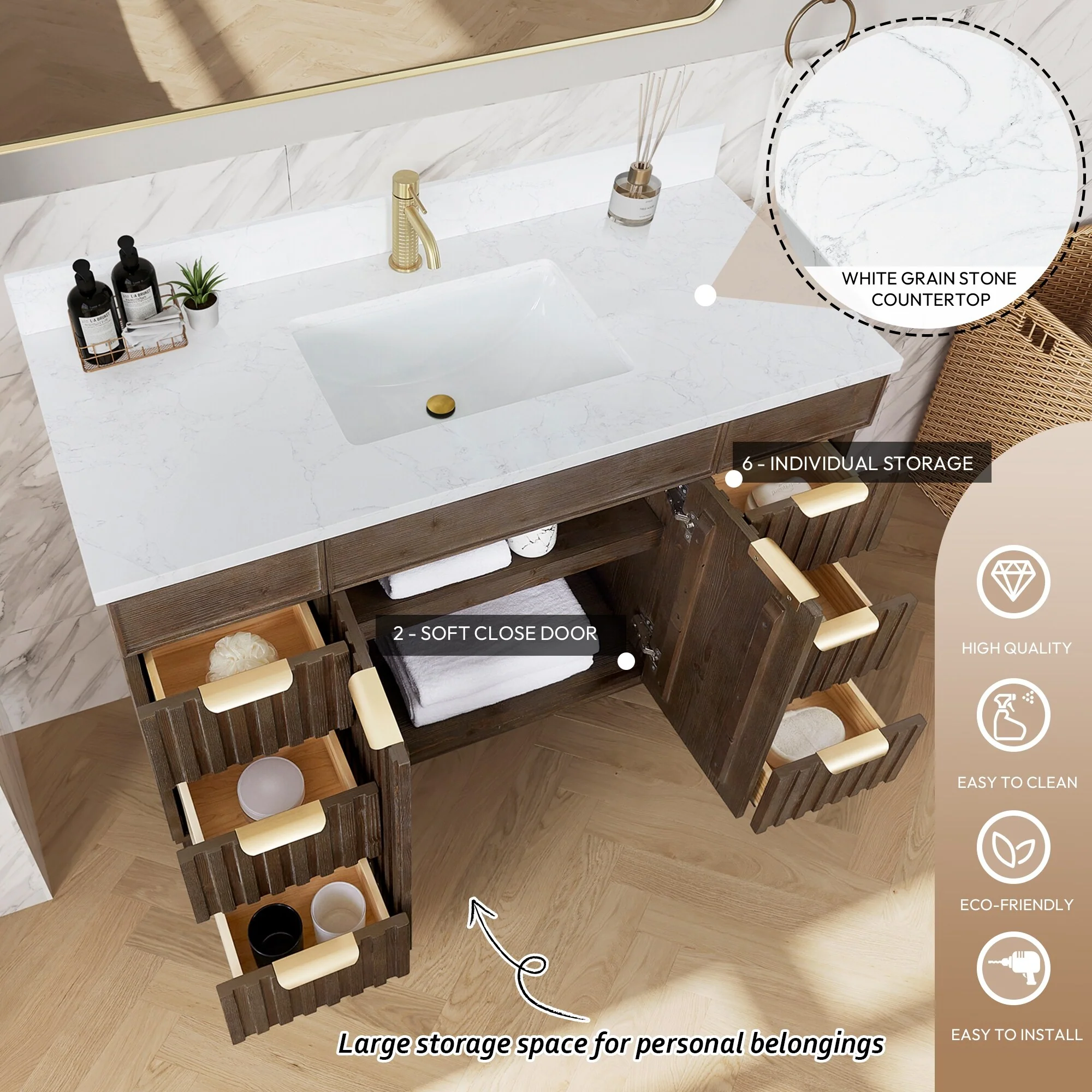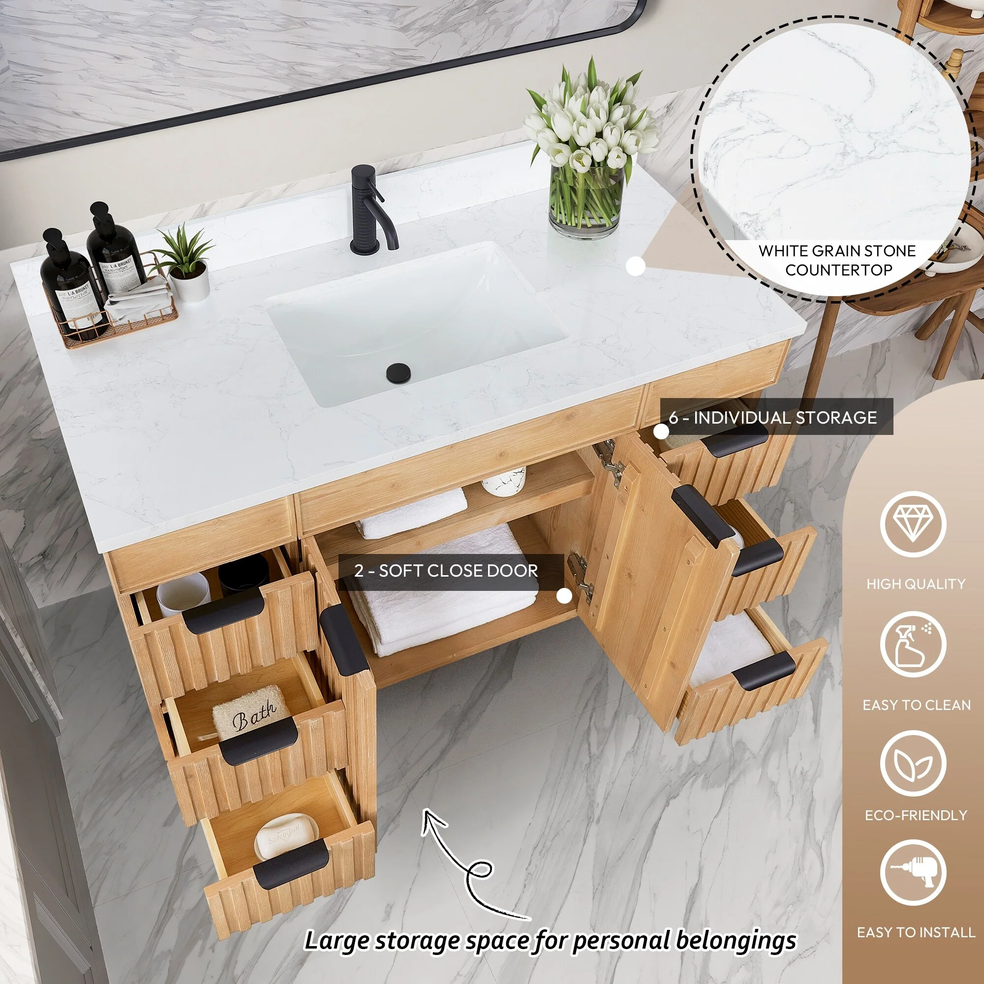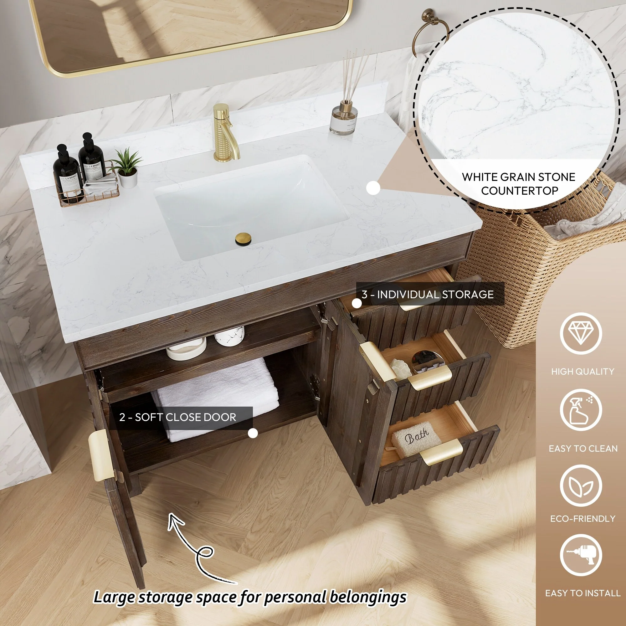 Palos Bath Vanity with Grain Composite Stone Top without Mirror