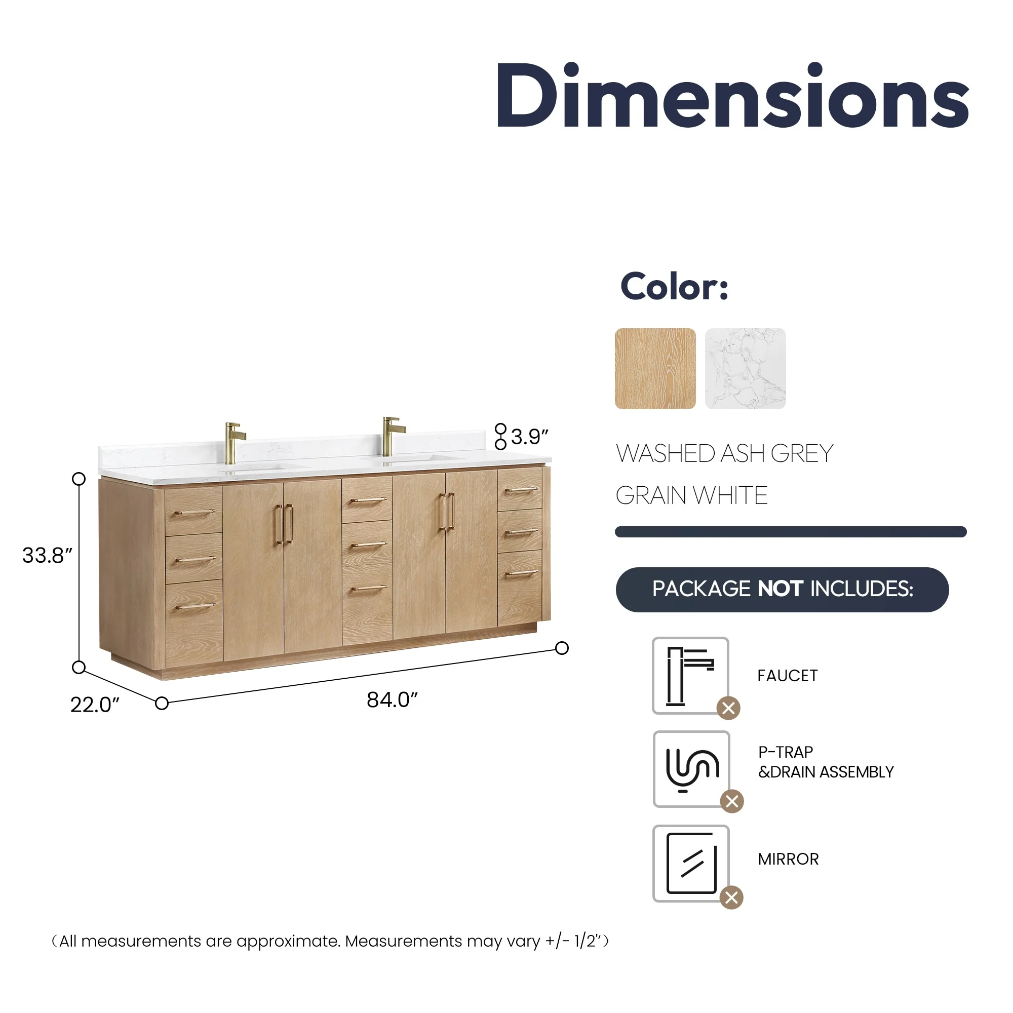 84 in. - Washed White - No Mirror