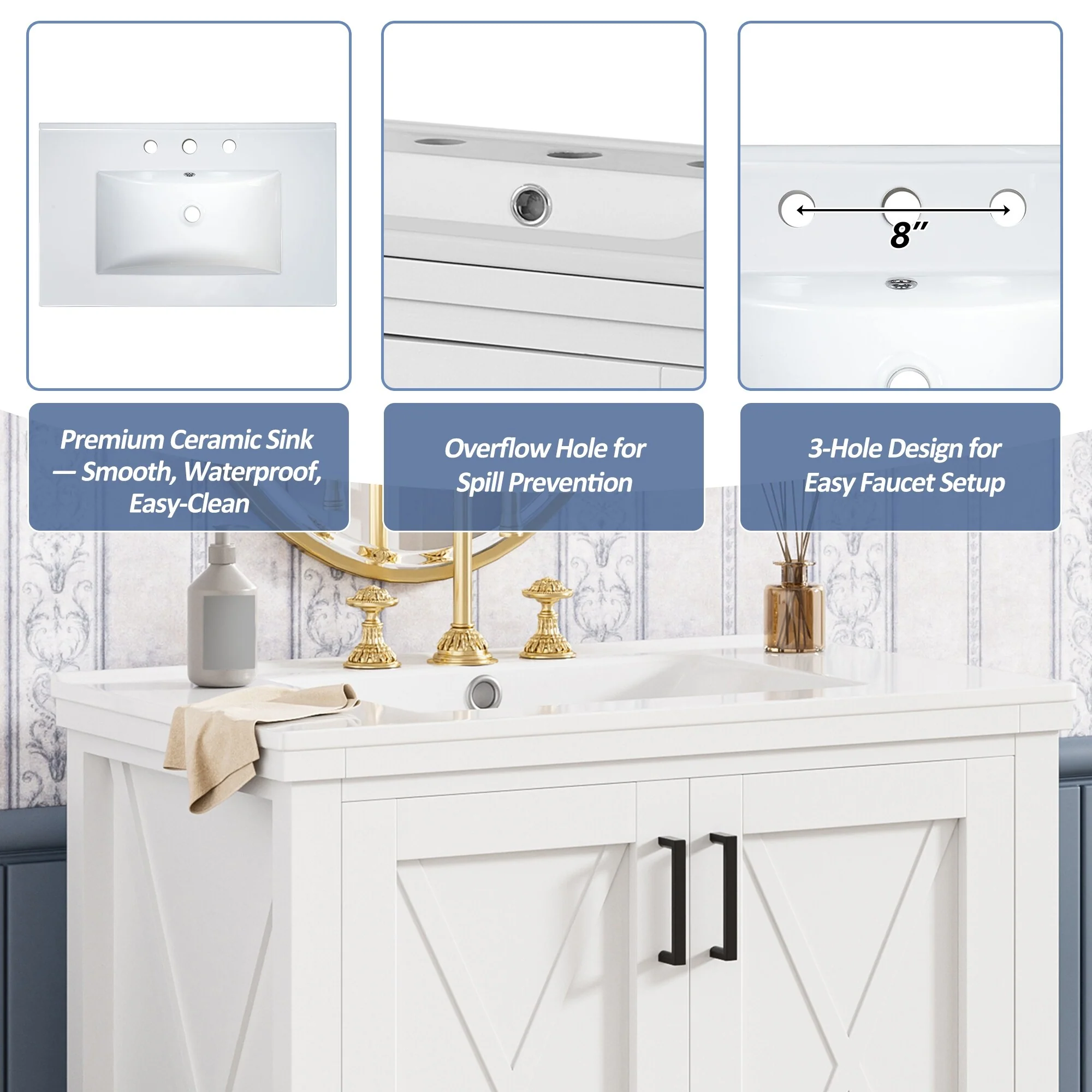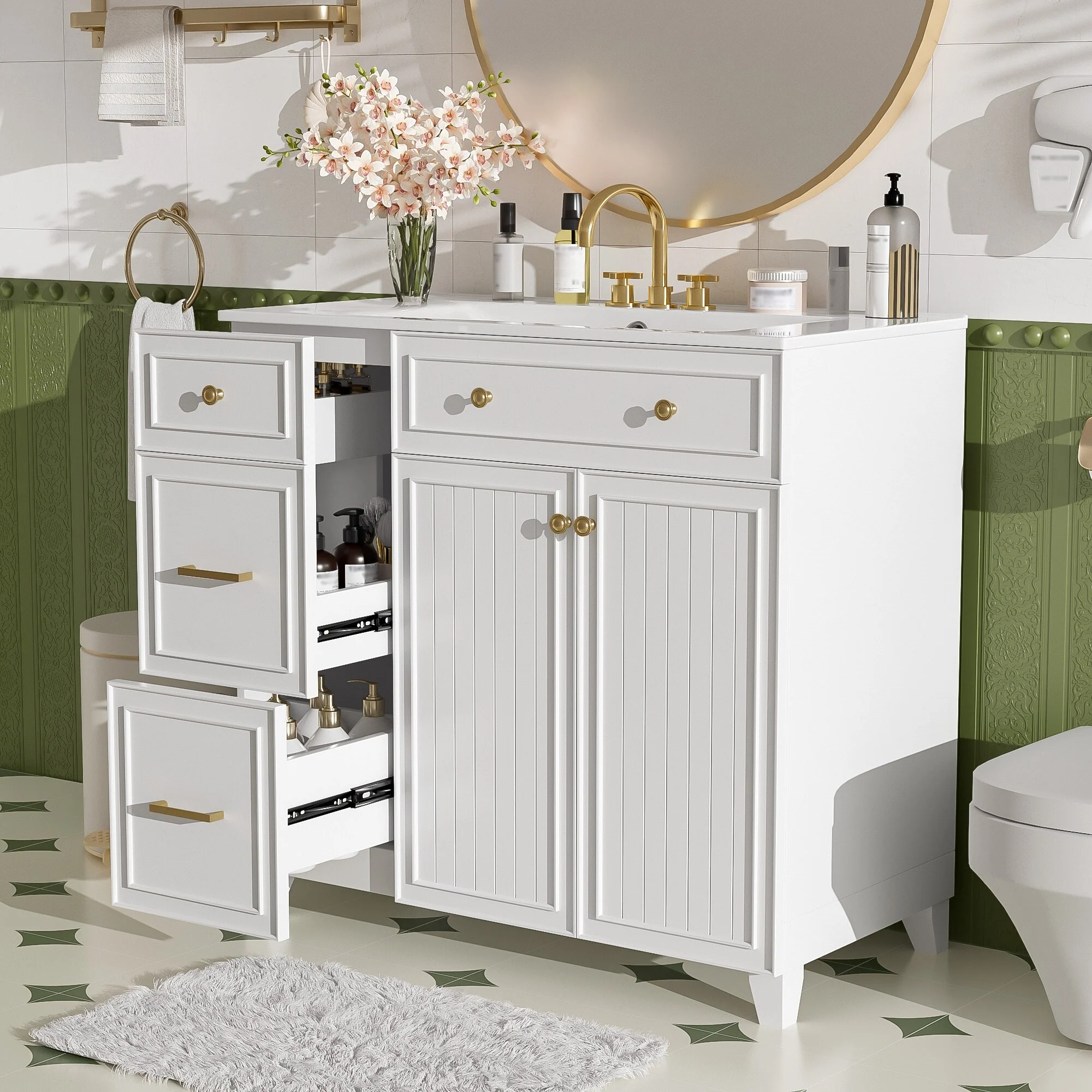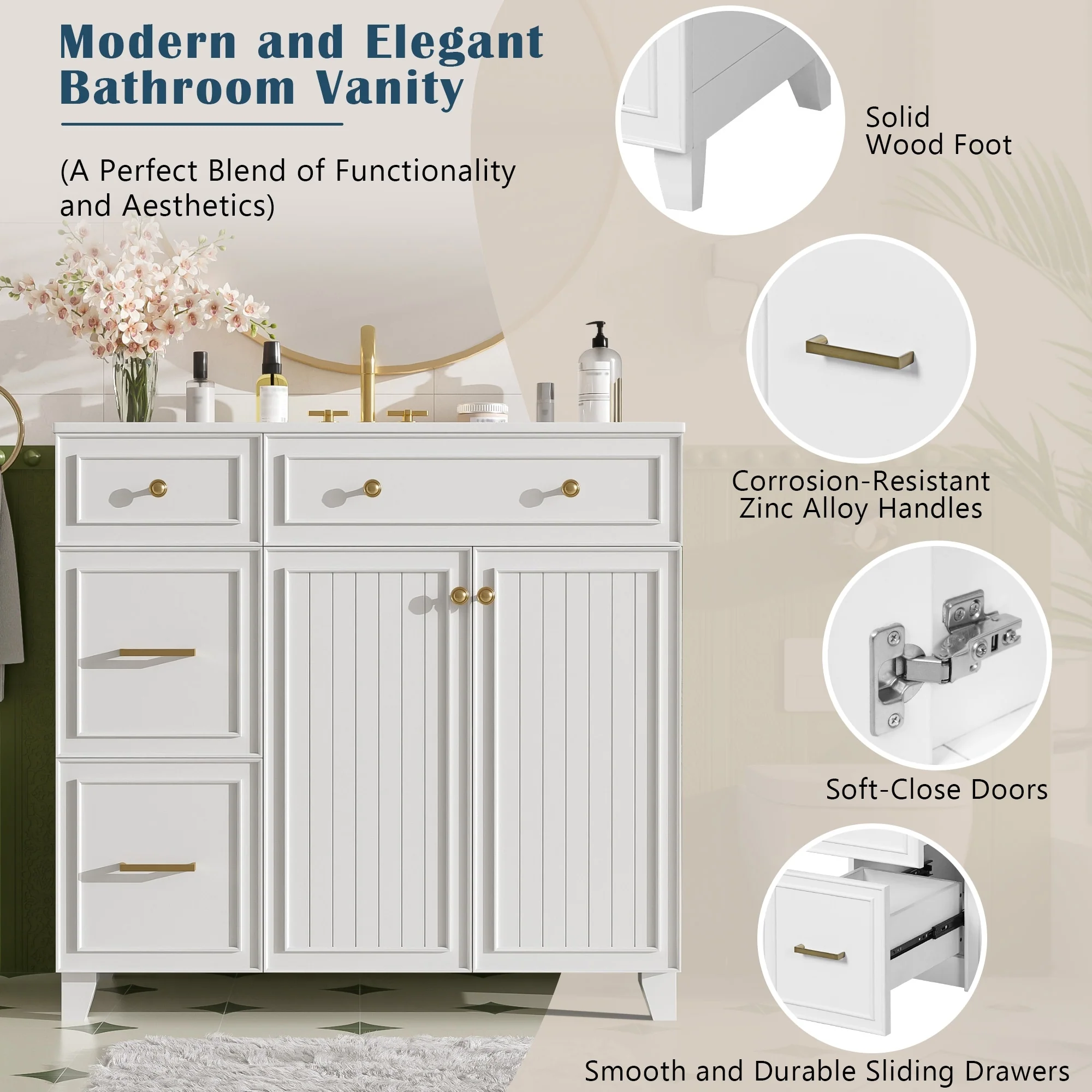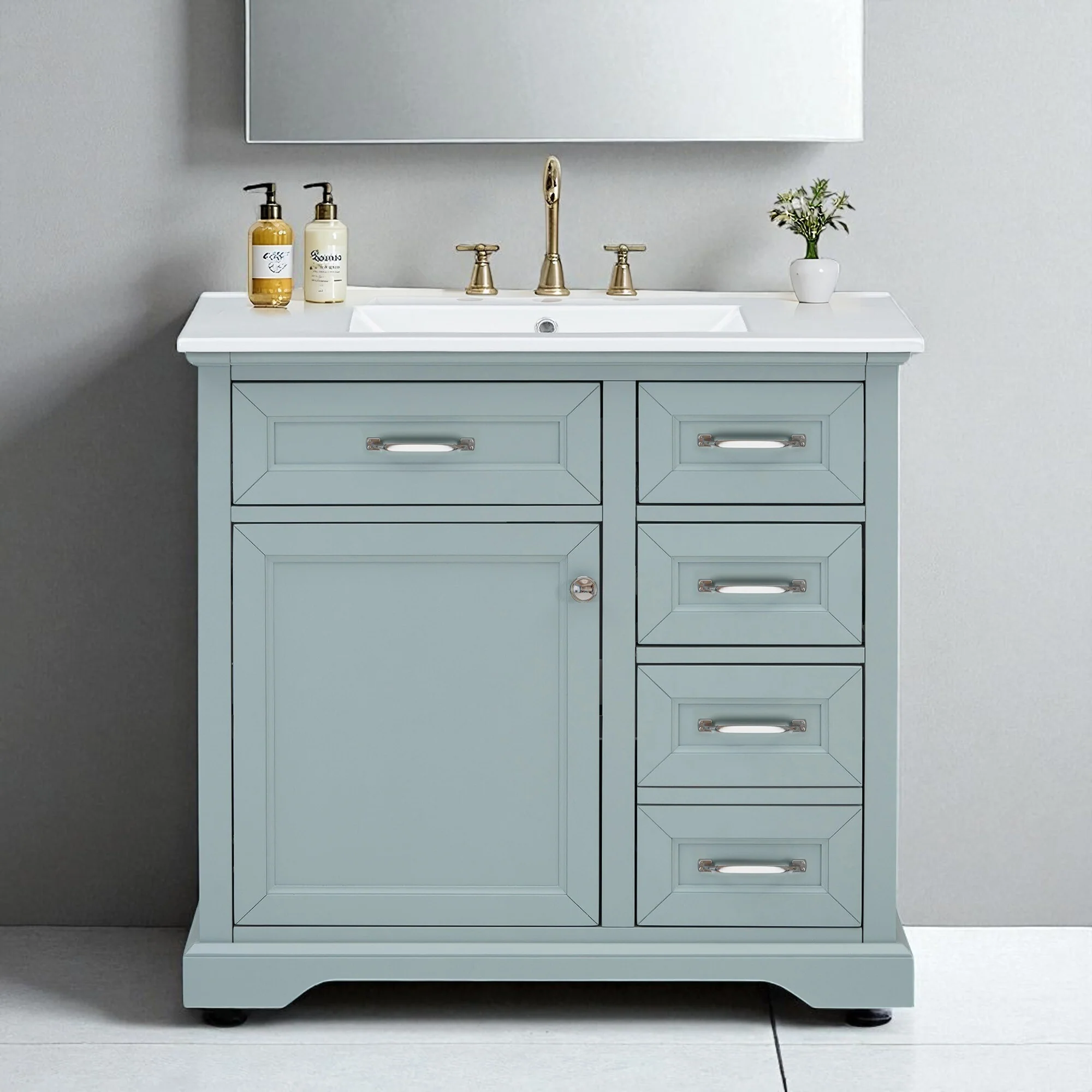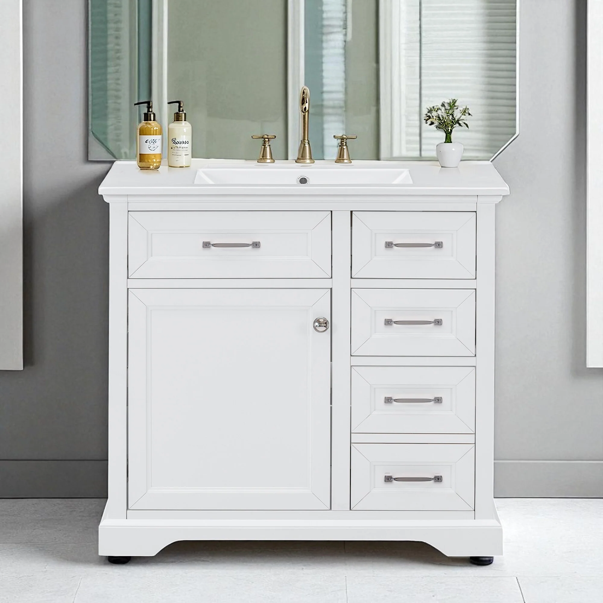 36" Bathroom Vanity with Ceramic Sink, Standard and Double-Layer Drawers, Soft Close Doors, Adjustable Shelves
