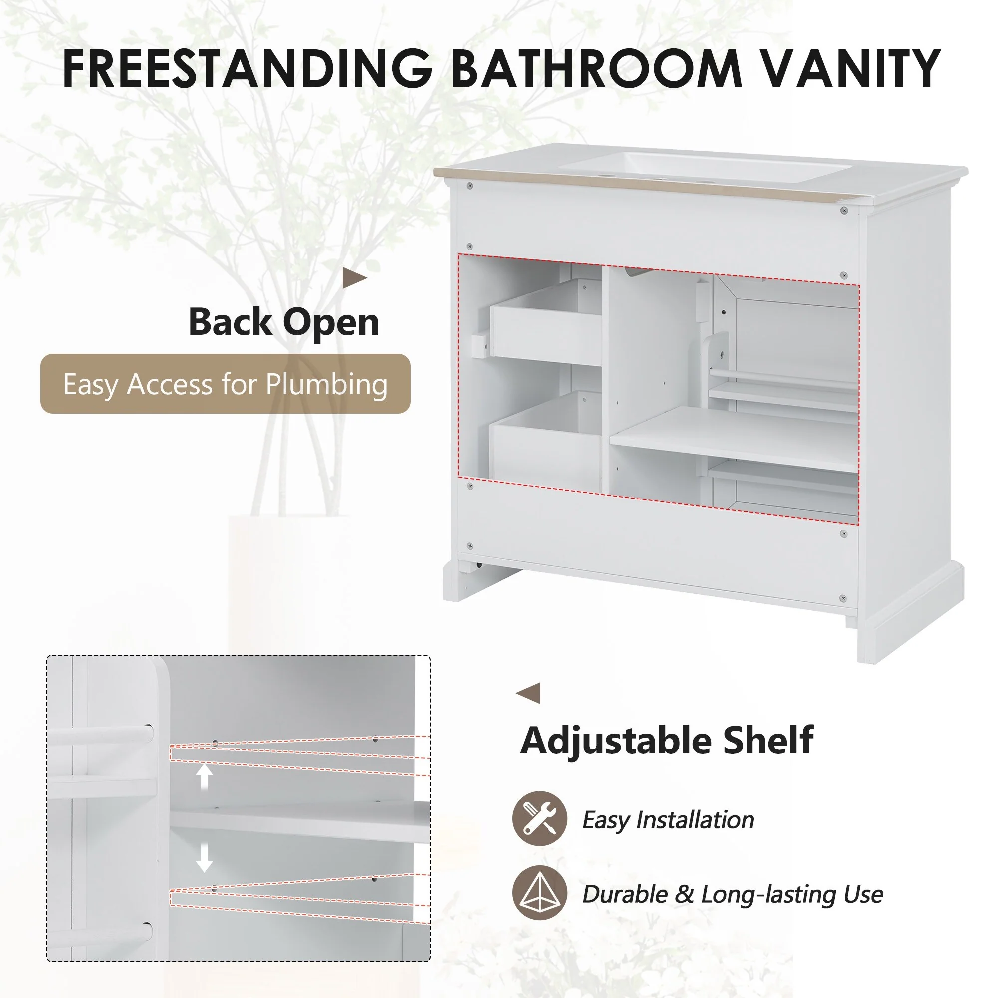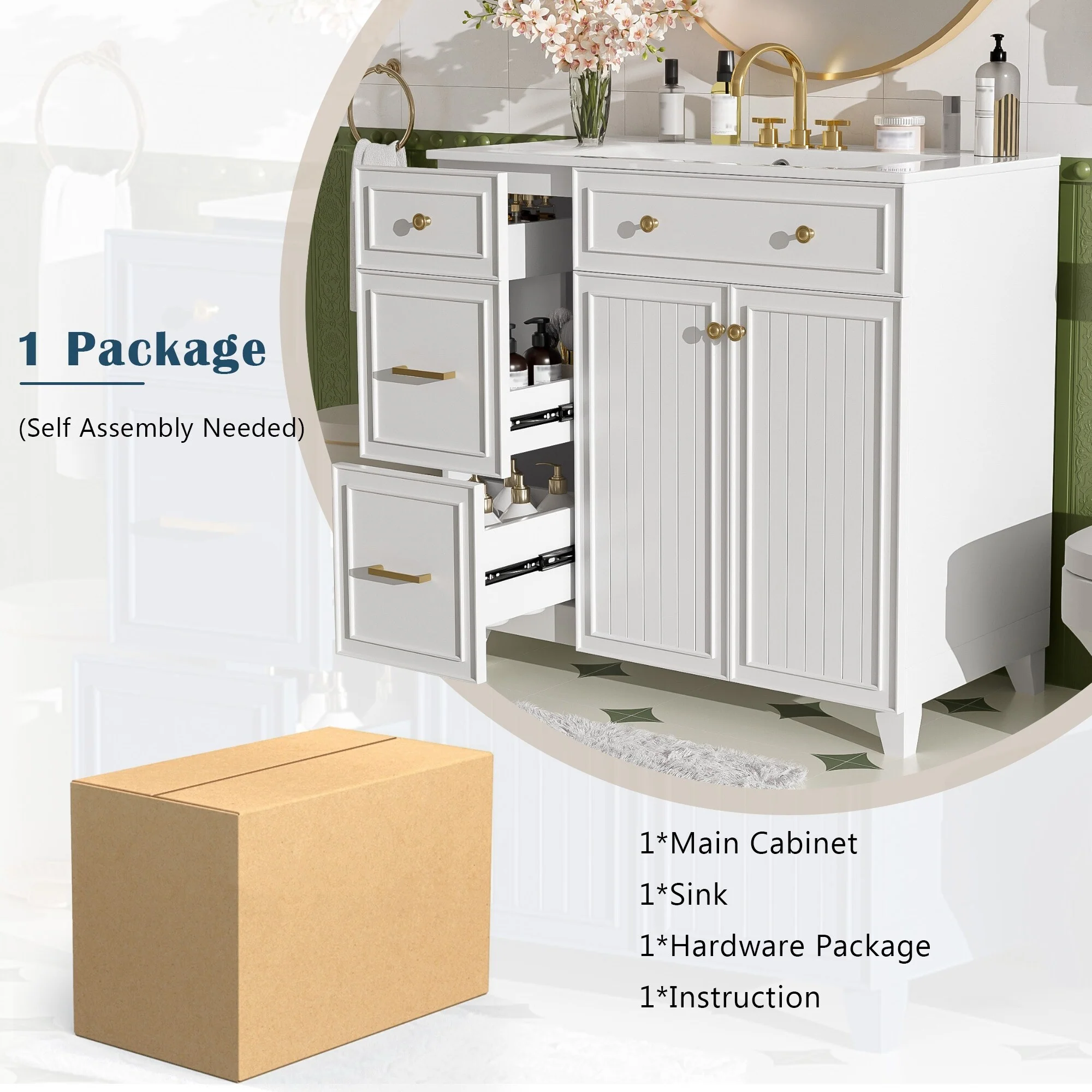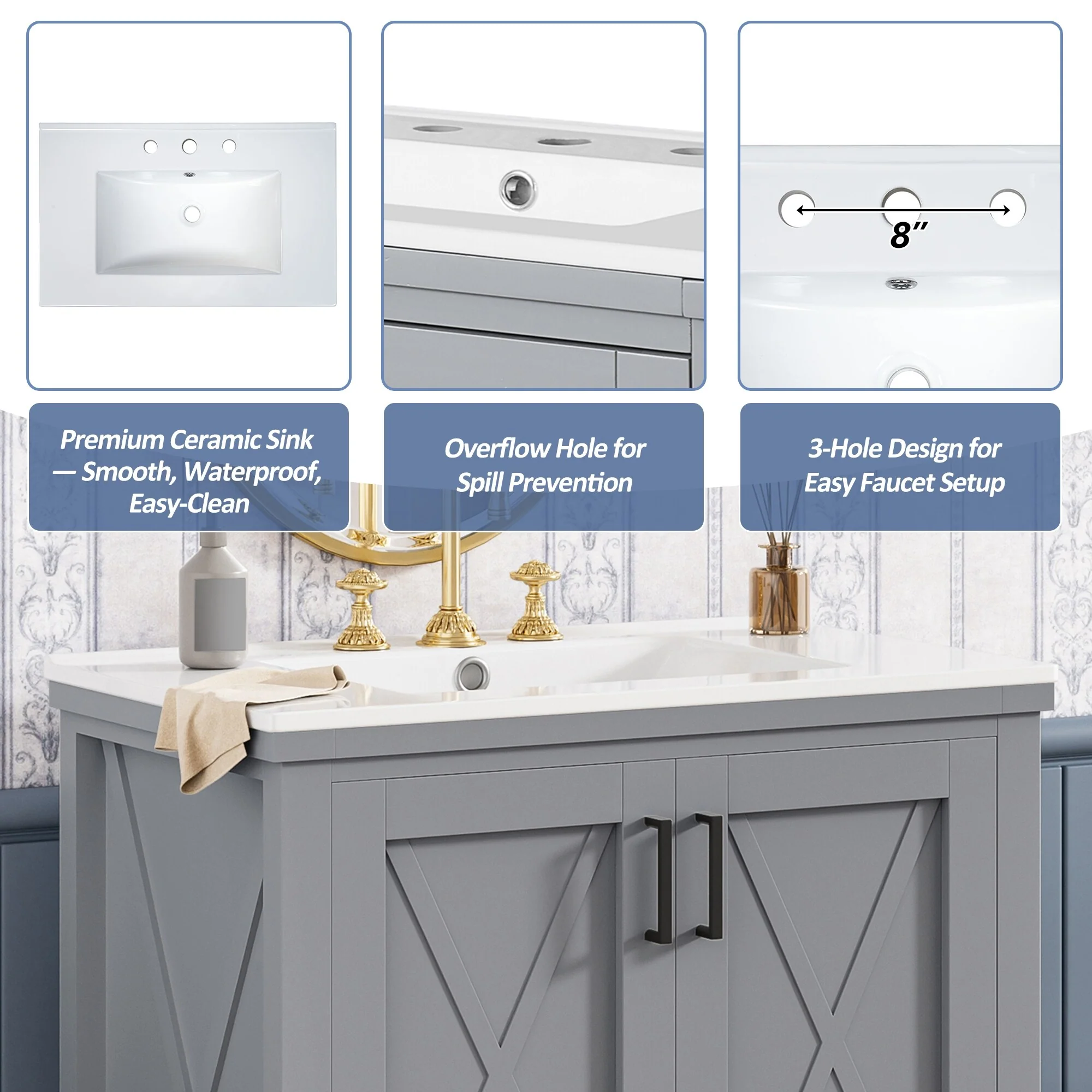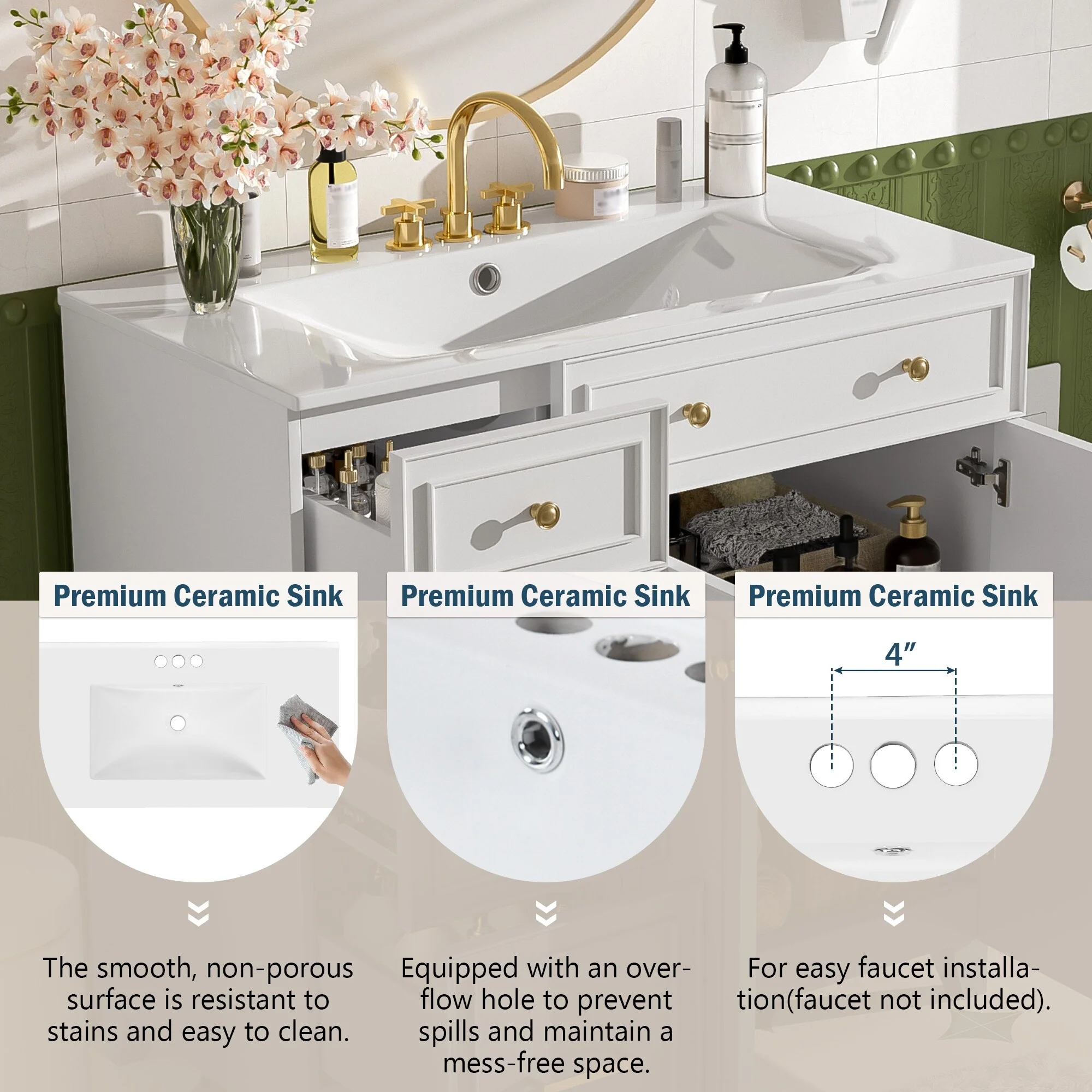 36" Bathroom Vanity with Ceramic Sink, Standard and Double-Layer Drawers, Soft Close Doors, Adjustable Shelves