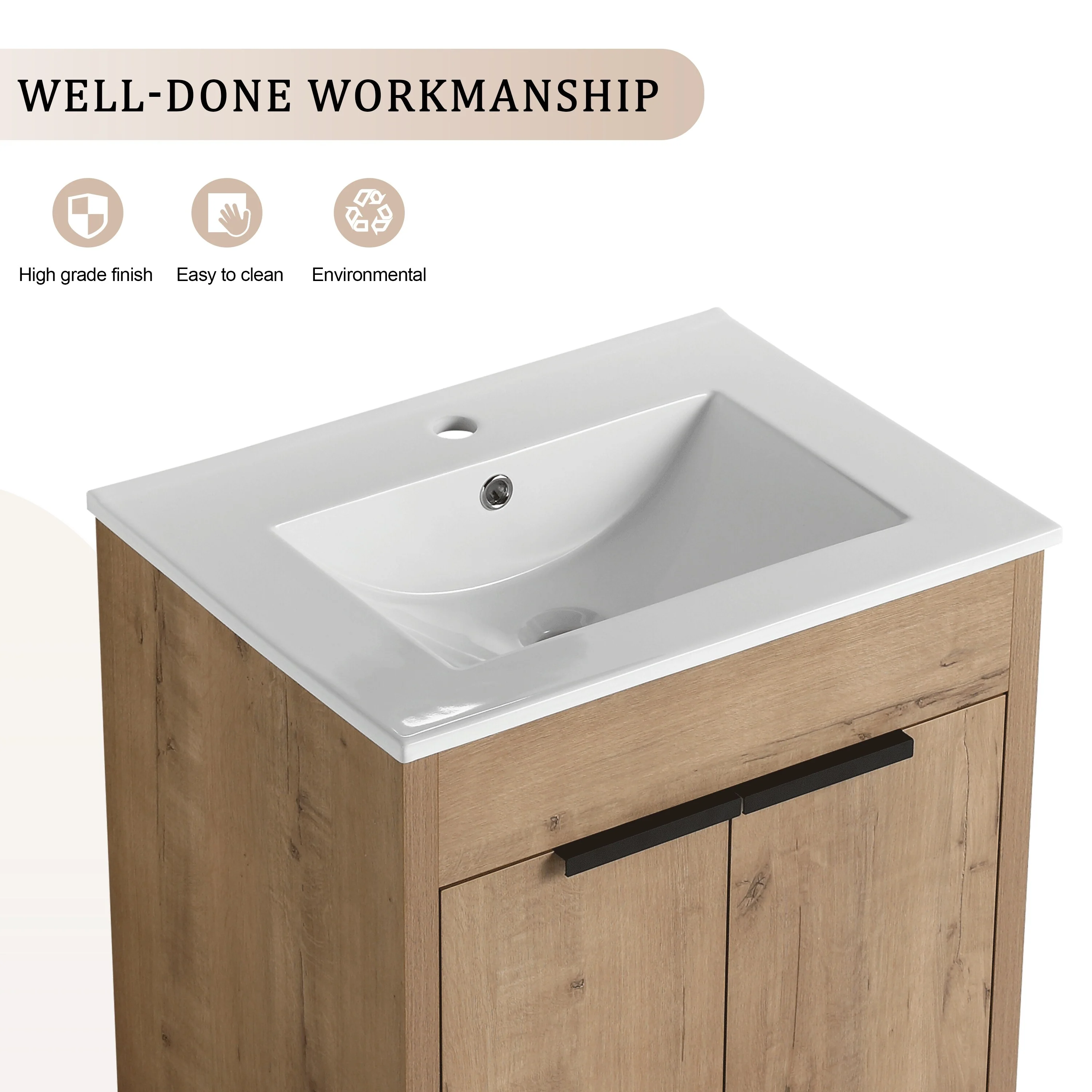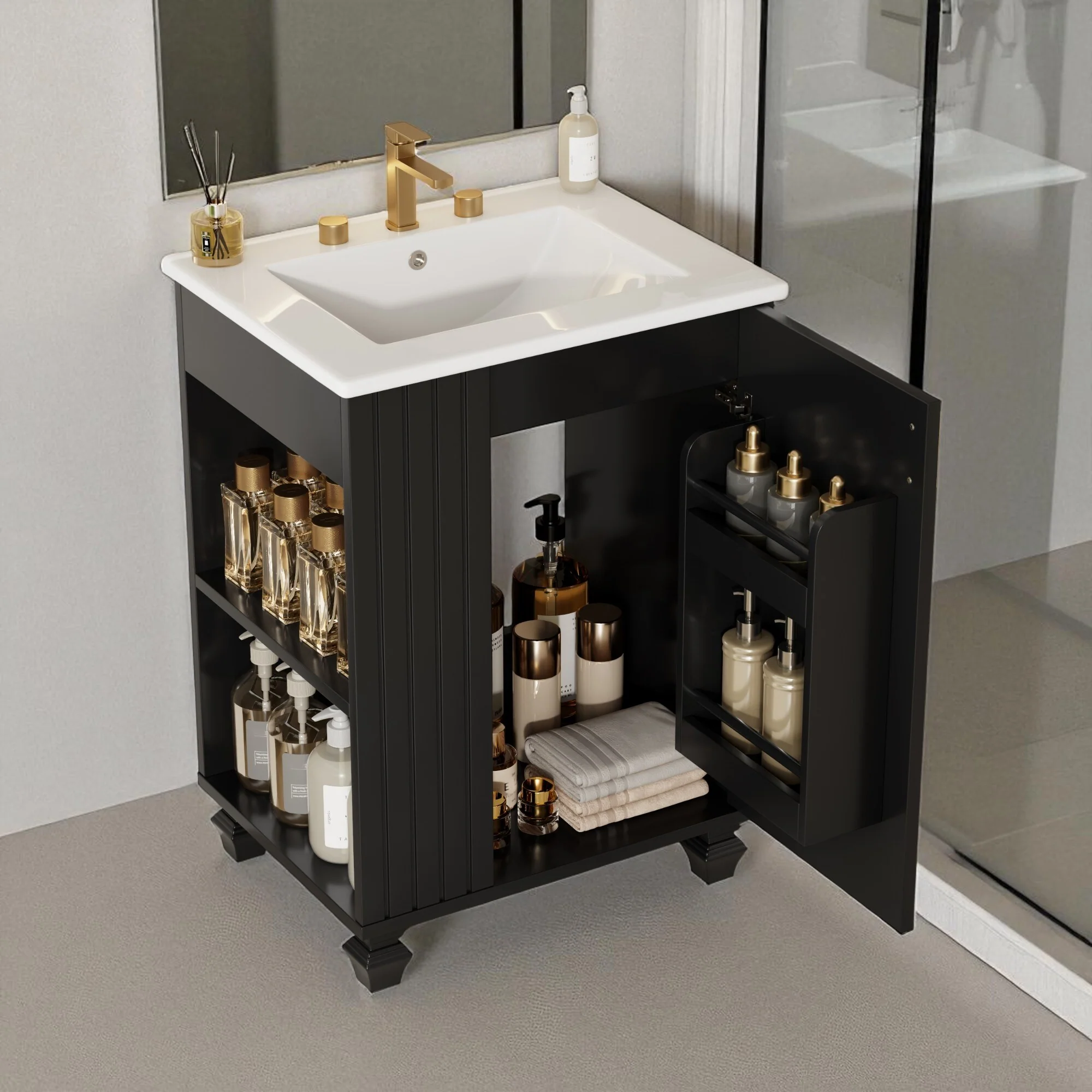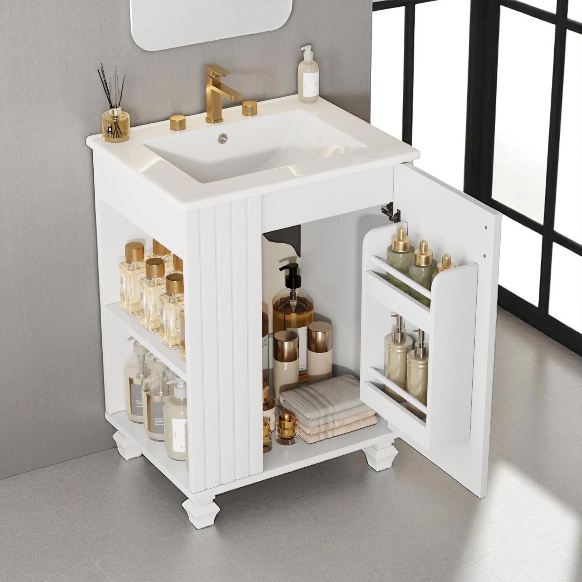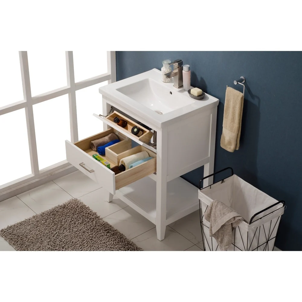 24" Bathroom Vanity with Ceramic Sink, Pine Wood Frame, Soft-Close Door & Side Open Storage