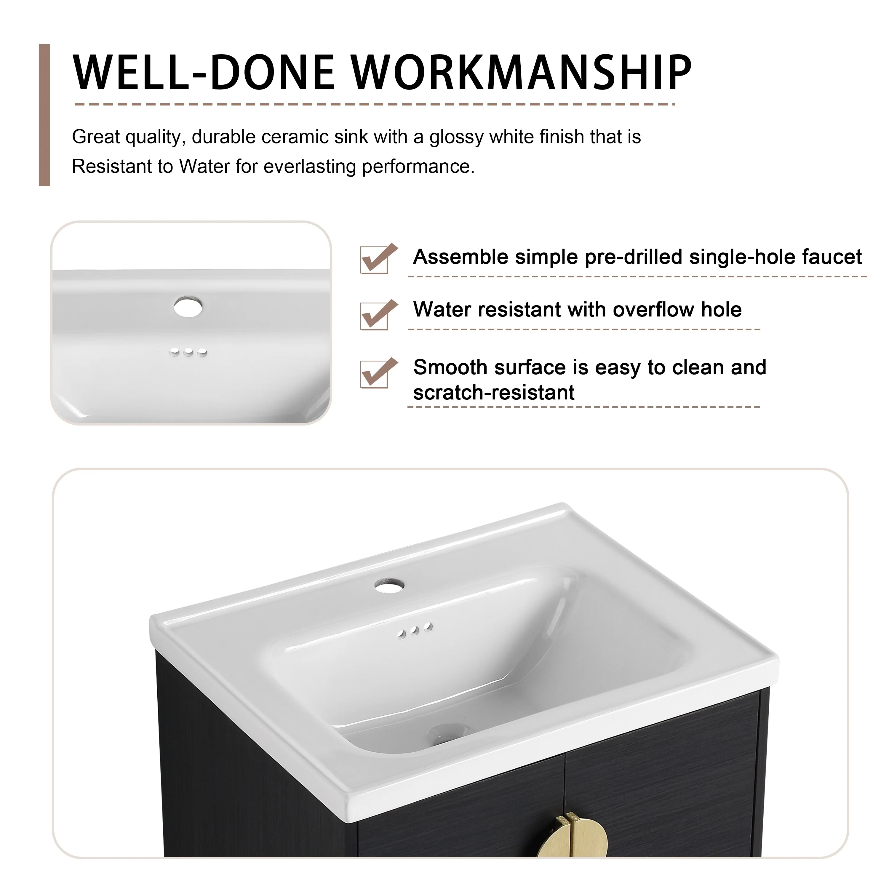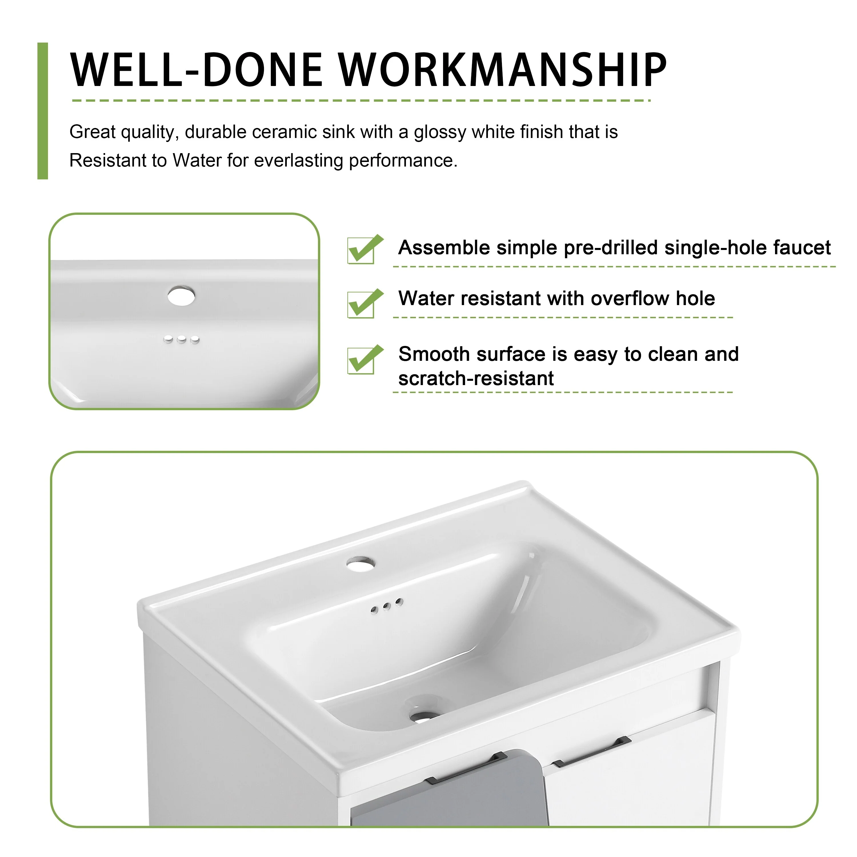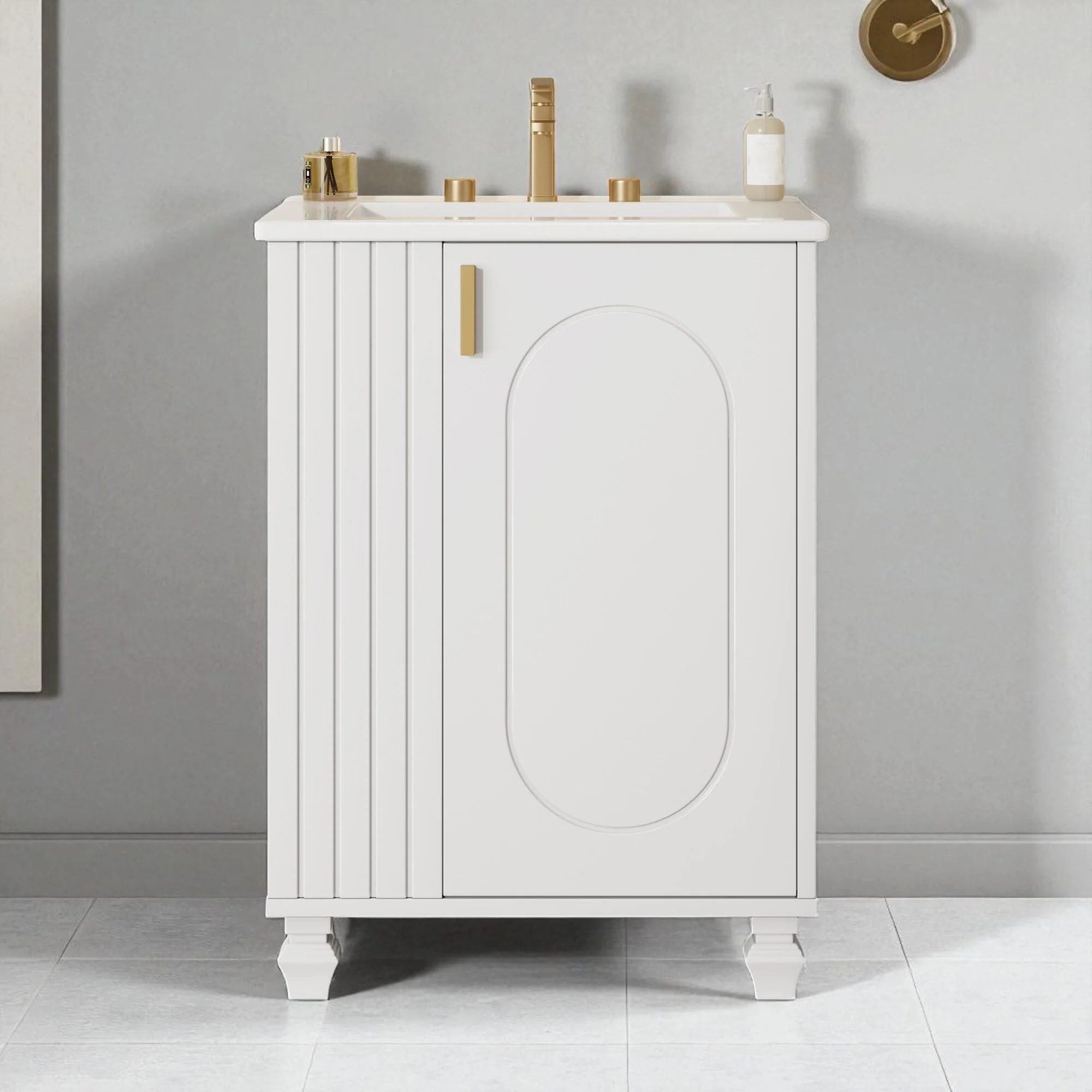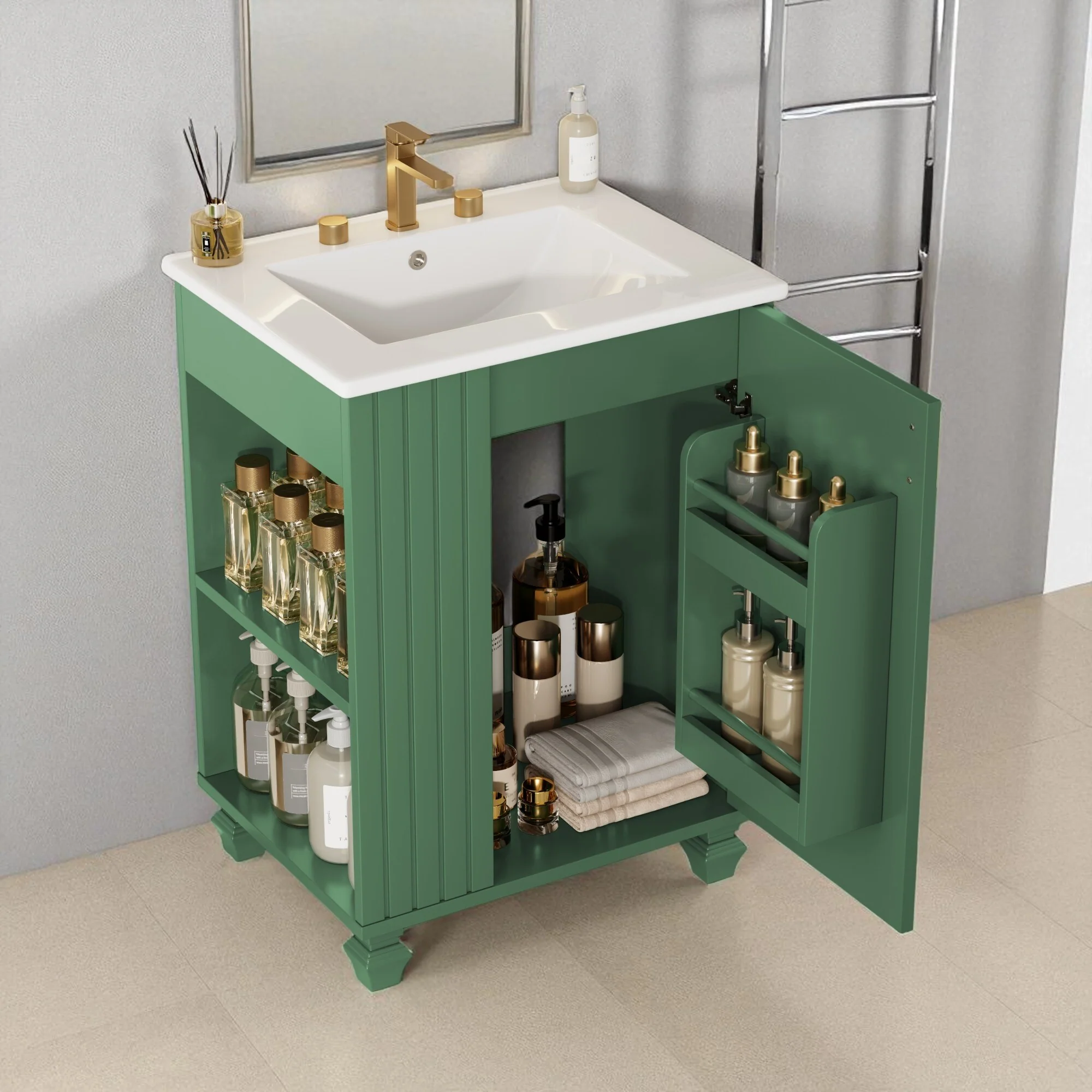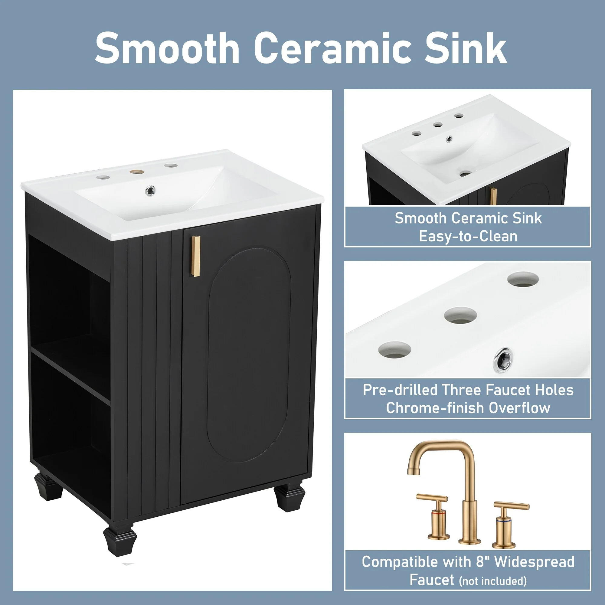 24" Bathroom Vanity with Ceramic Sink, Pine Wood Frame, Soft-Close Door & Side Open Storage