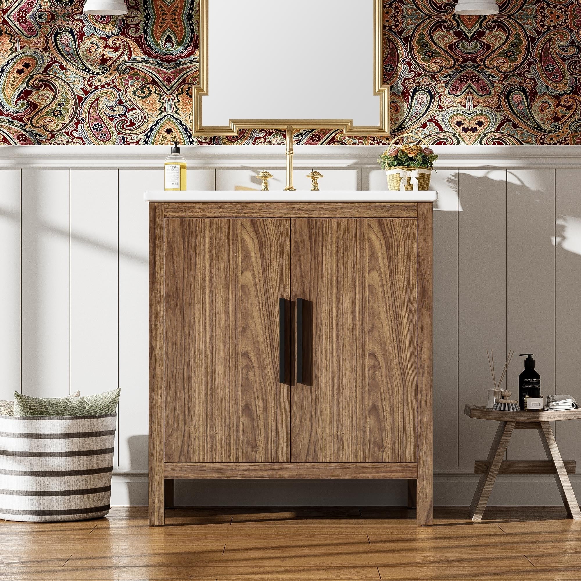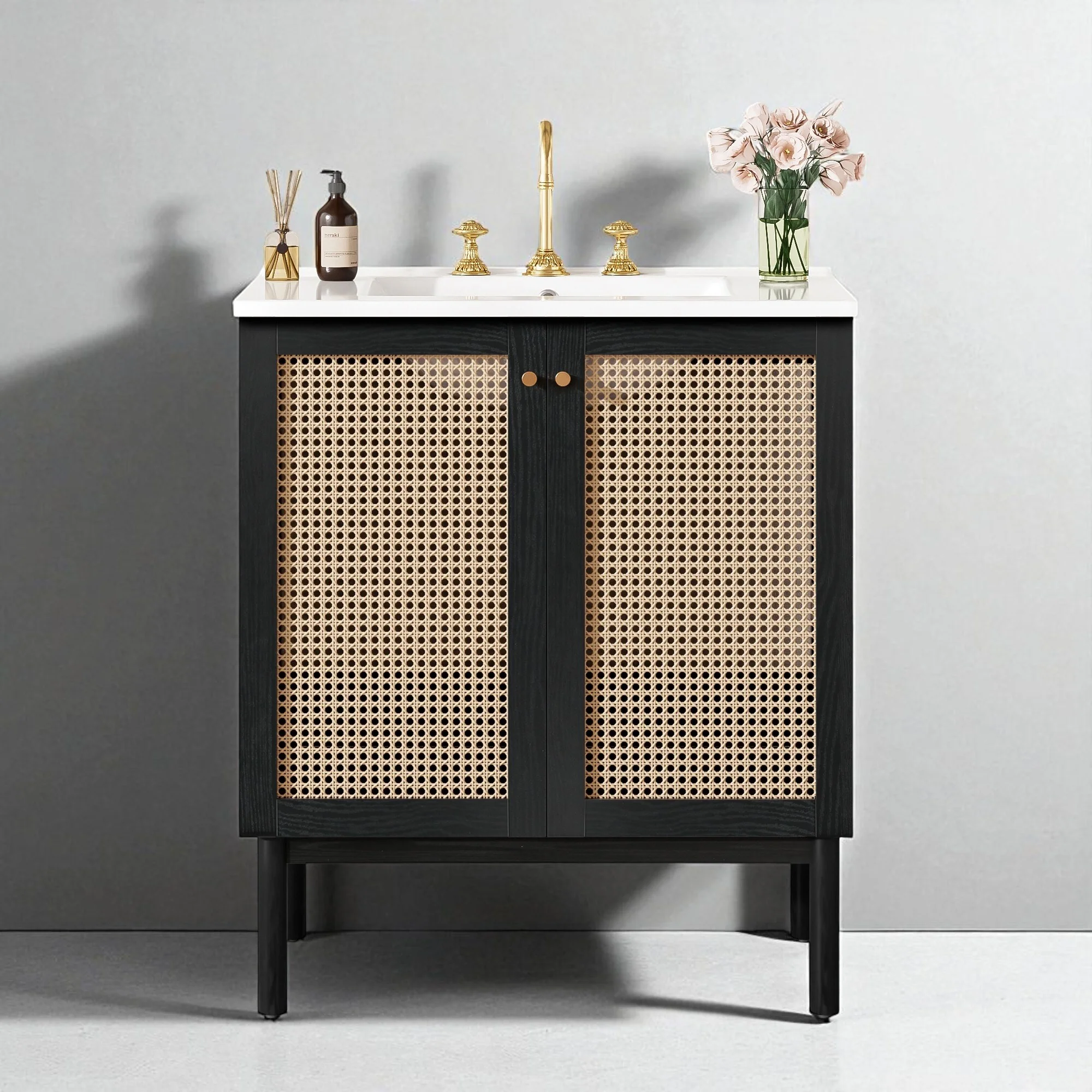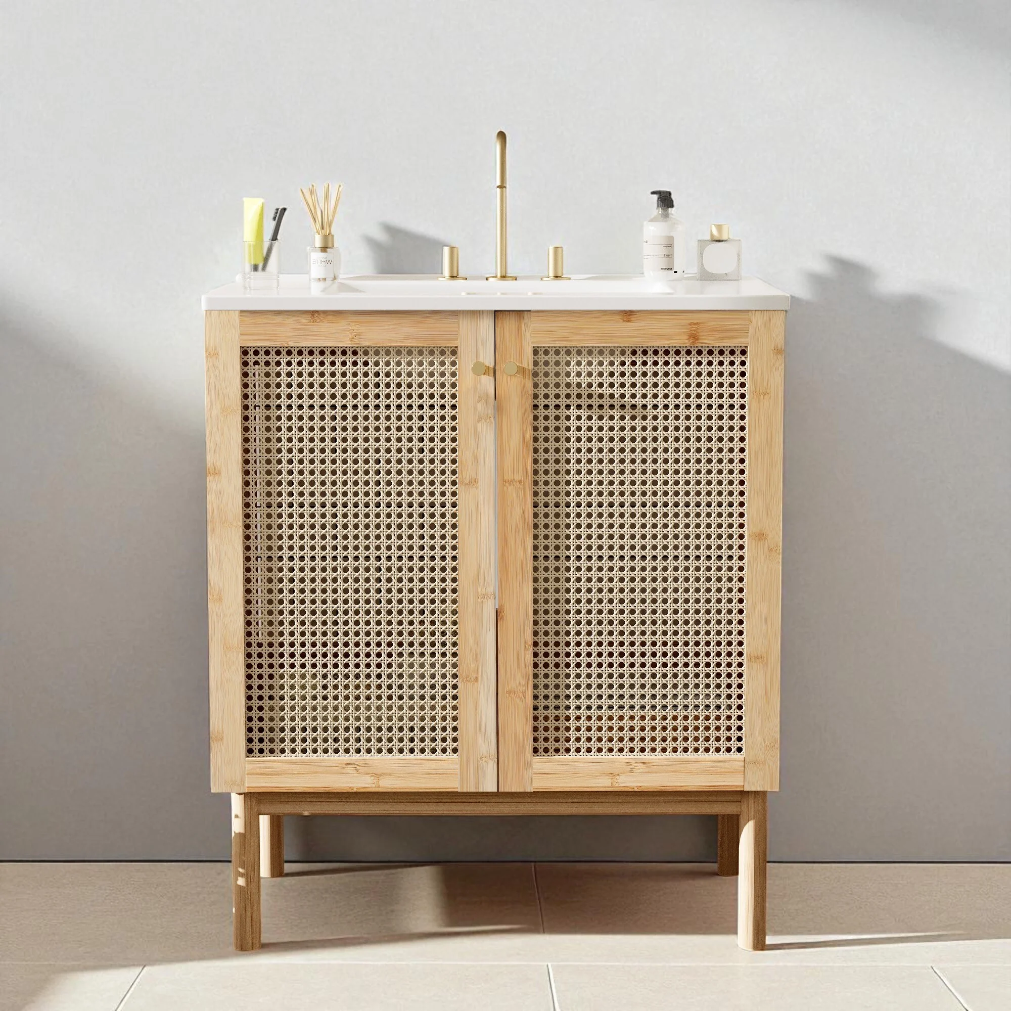 30" Bathroom Vanity with Handmade Rattan Doors, Ceramic Basin, Soft-Close Mechanism & Natural Bamboo Frame