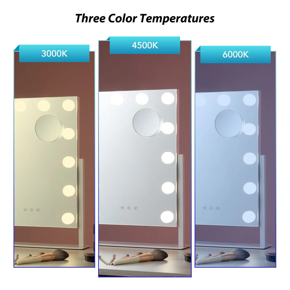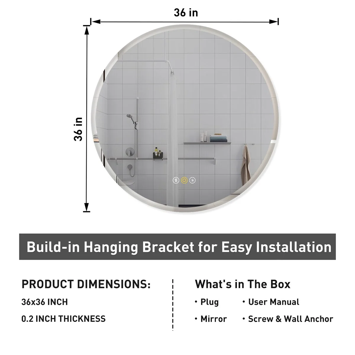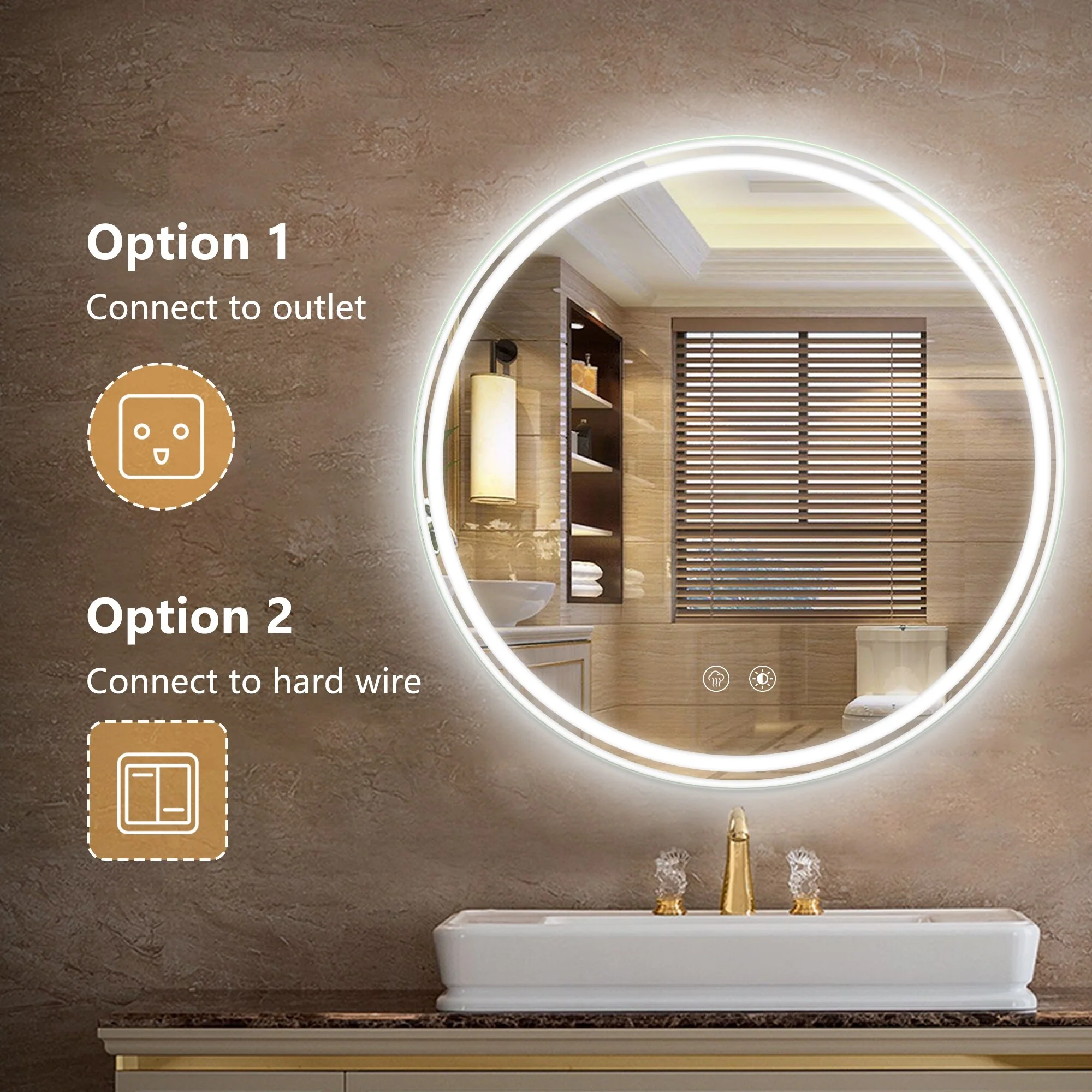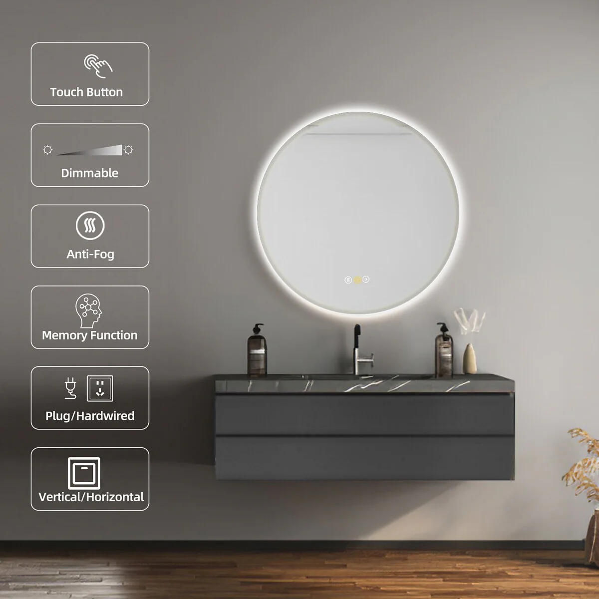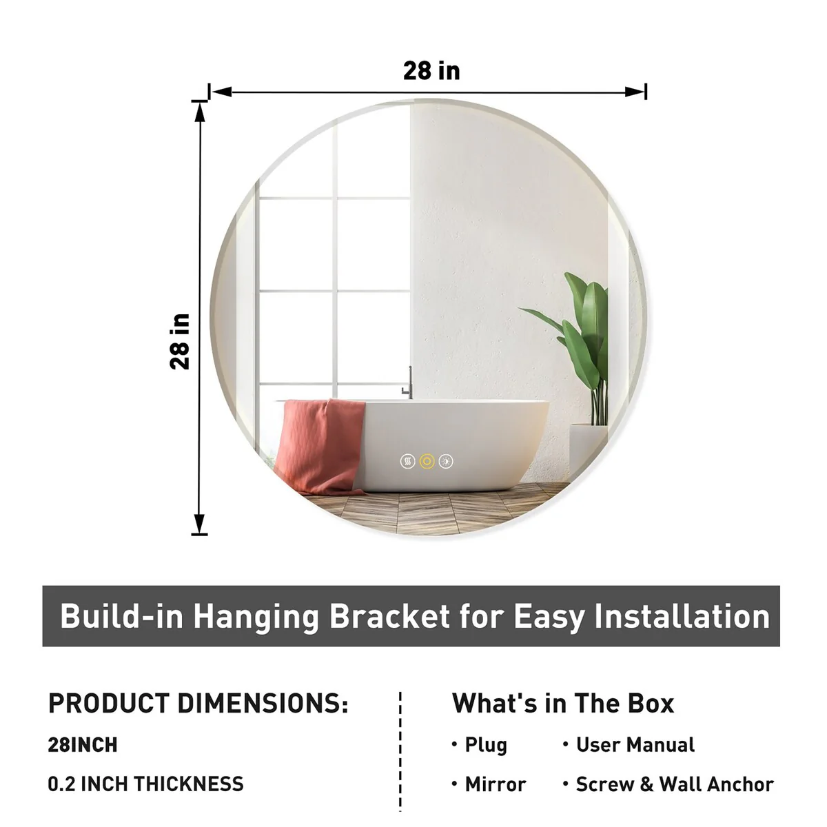 Round Beveled Edge Wall Mount Bathroom Vanity Mirror with Lights, Dimmable, Anti-Fog, 3 Color Temperature