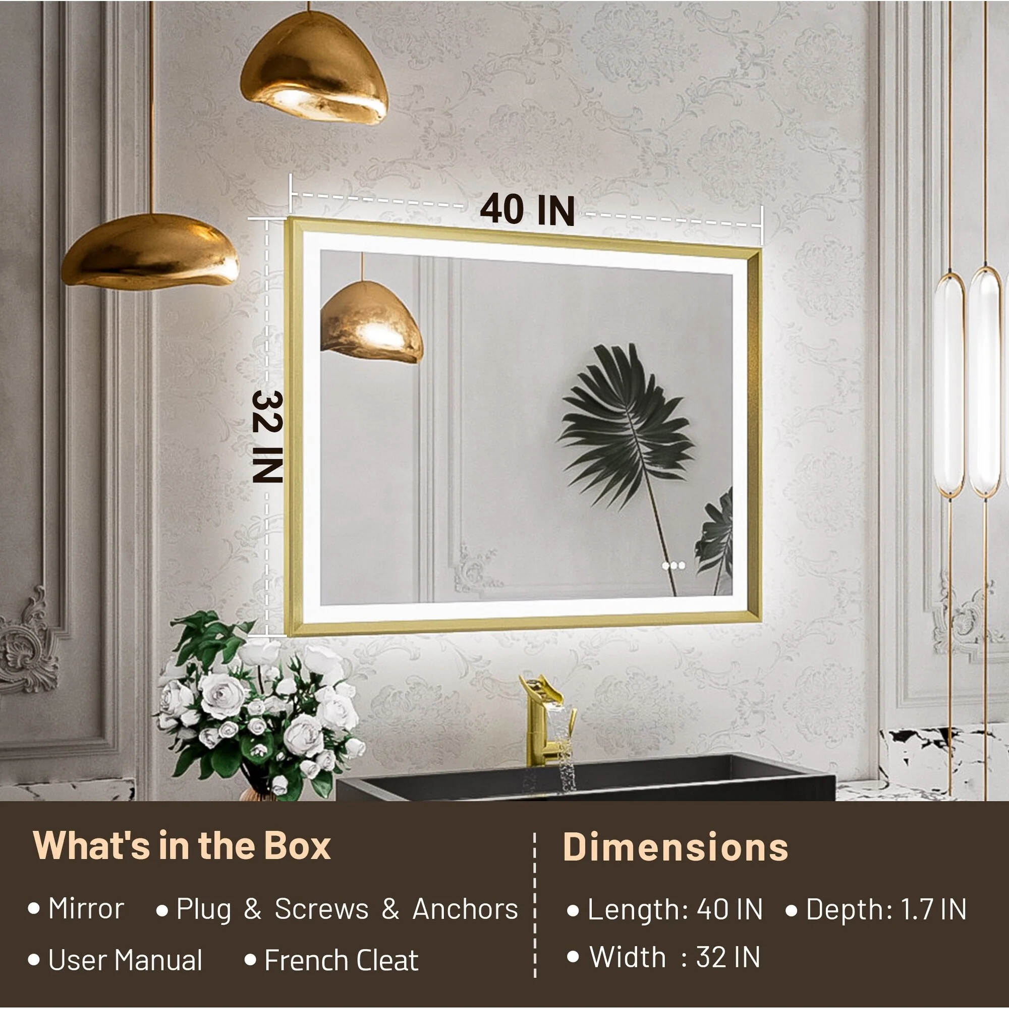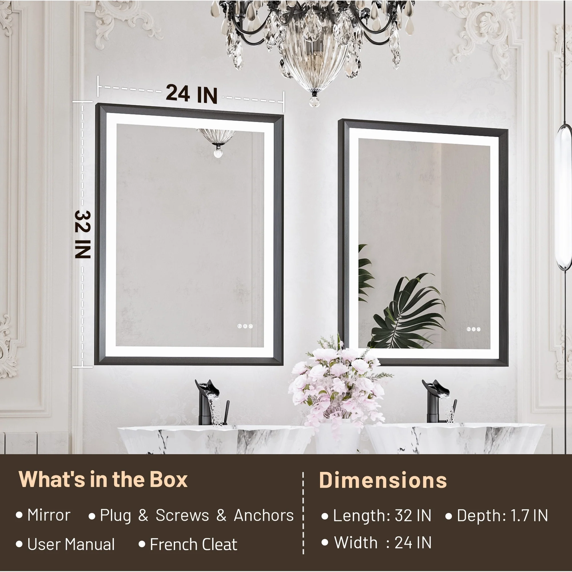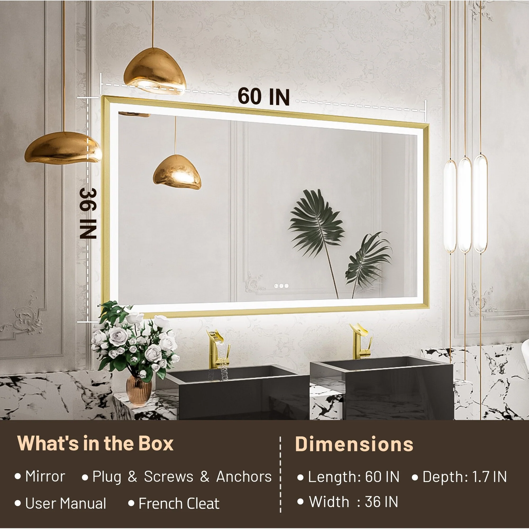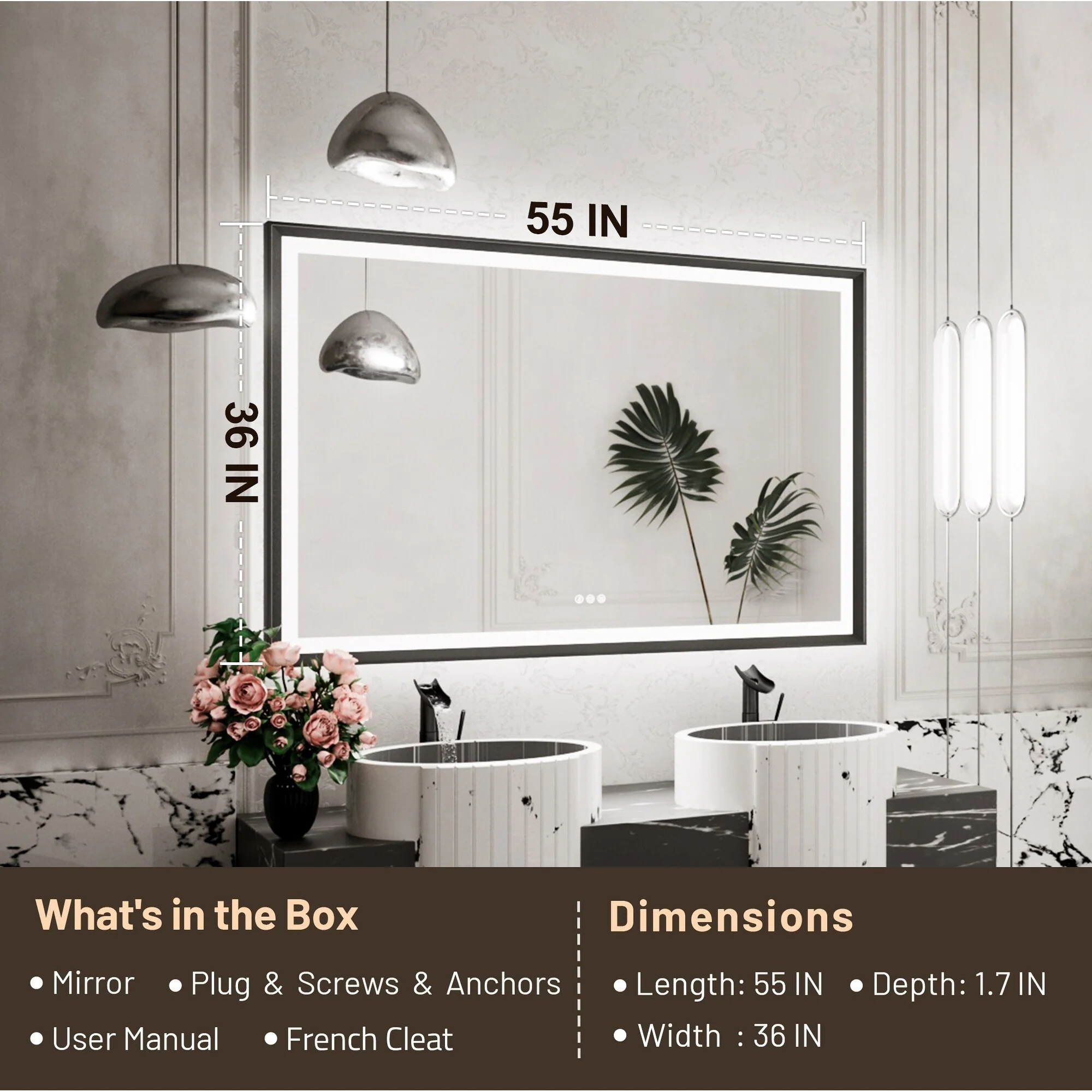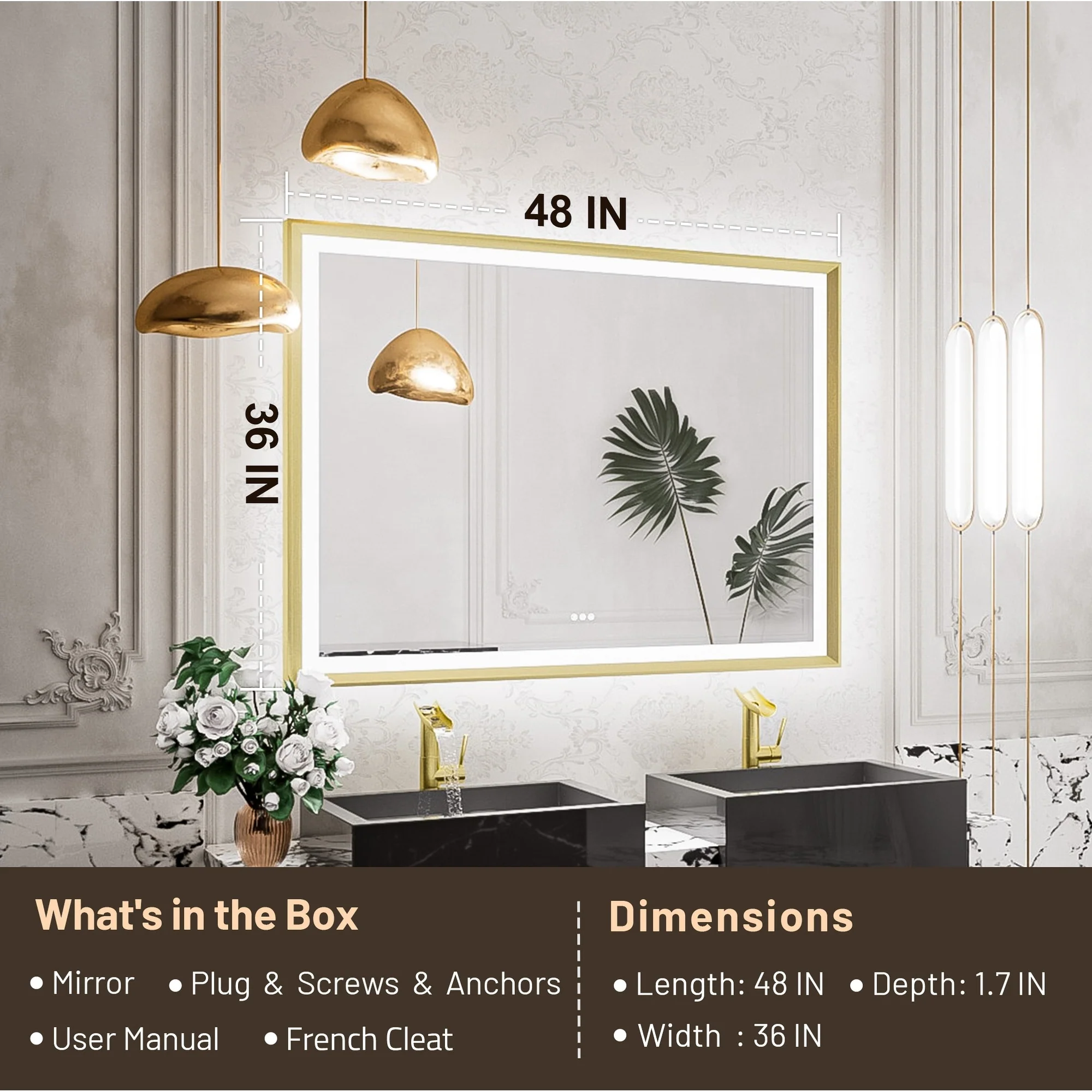 LED Bathroom Vanity Mirror, 36 in. Height, Polished Crystal Glass with Anti-Fog and Horizontal or Vertical Mounting