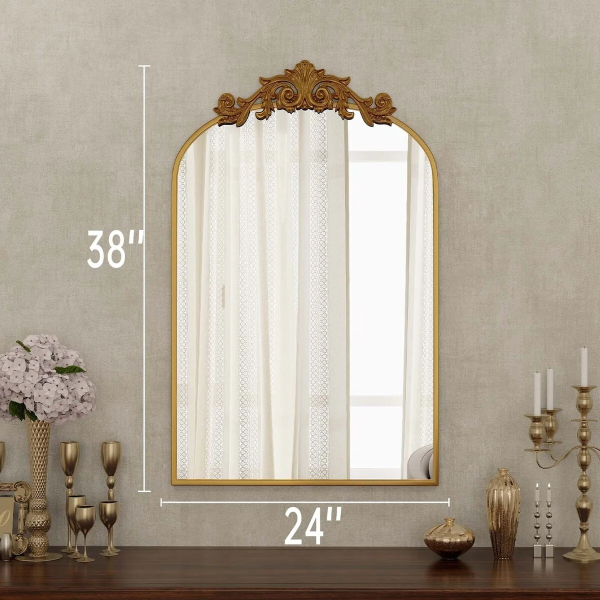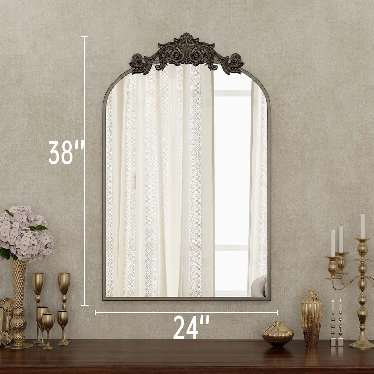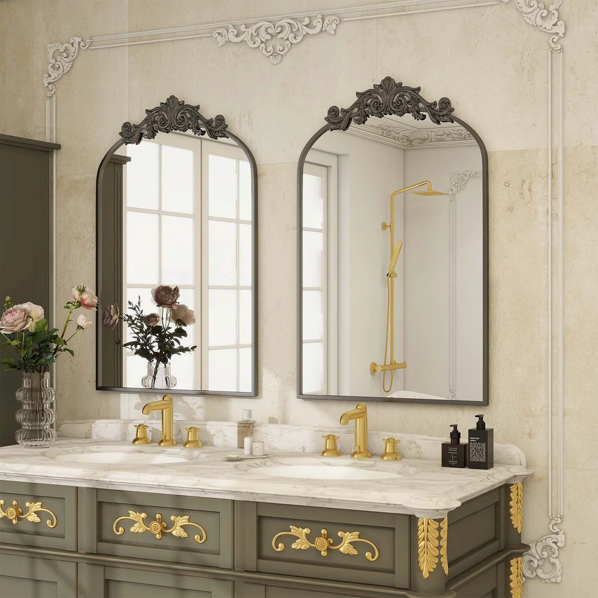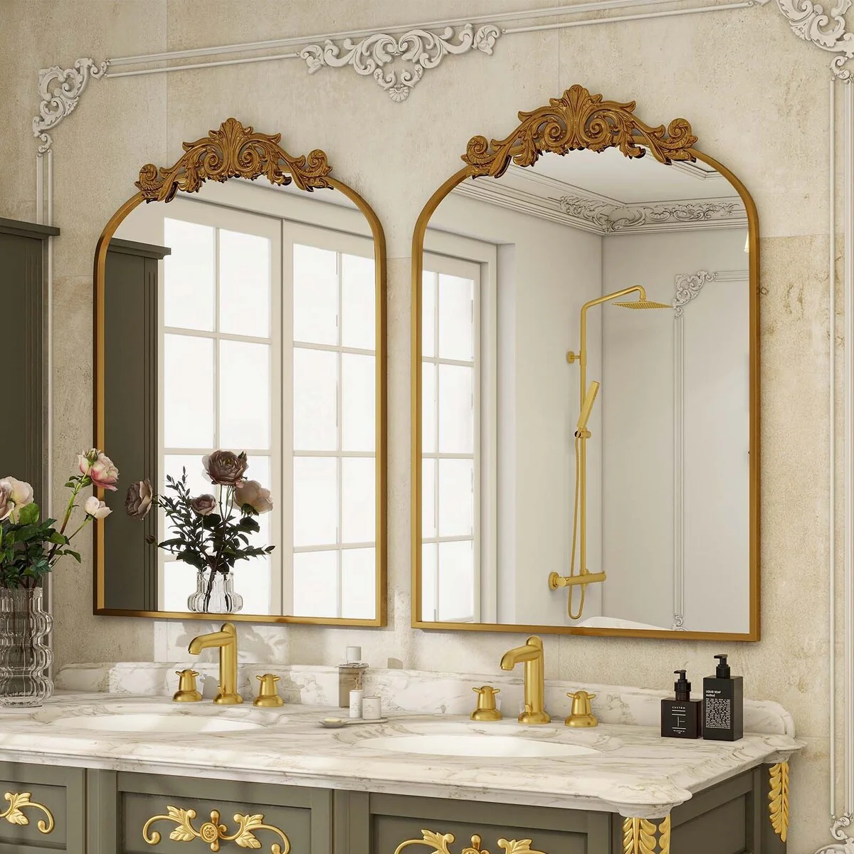 Arched Baroque Bathroom Mirror with Bottom Floral Decor