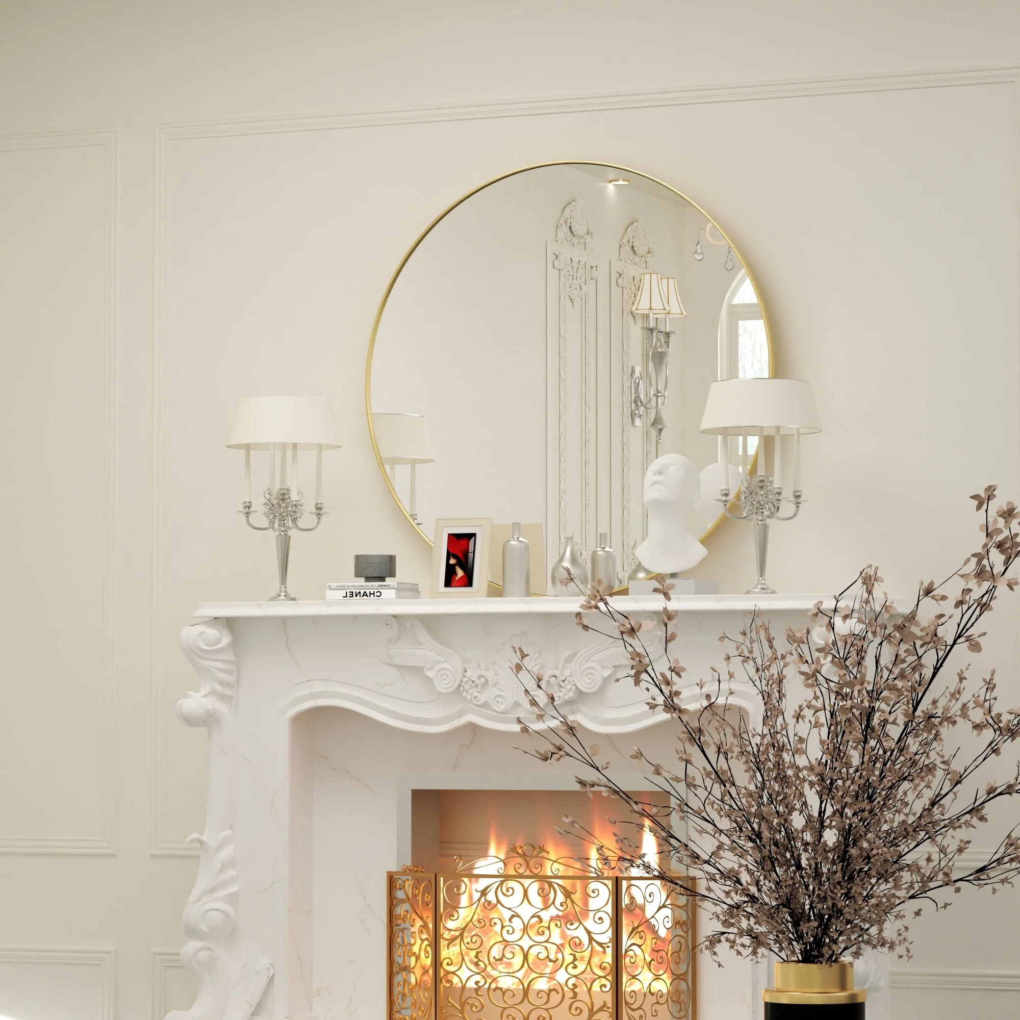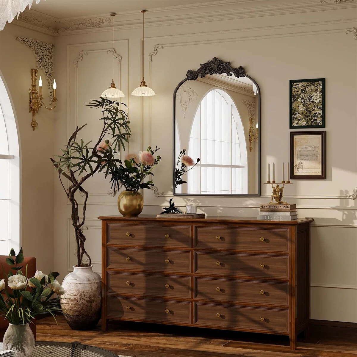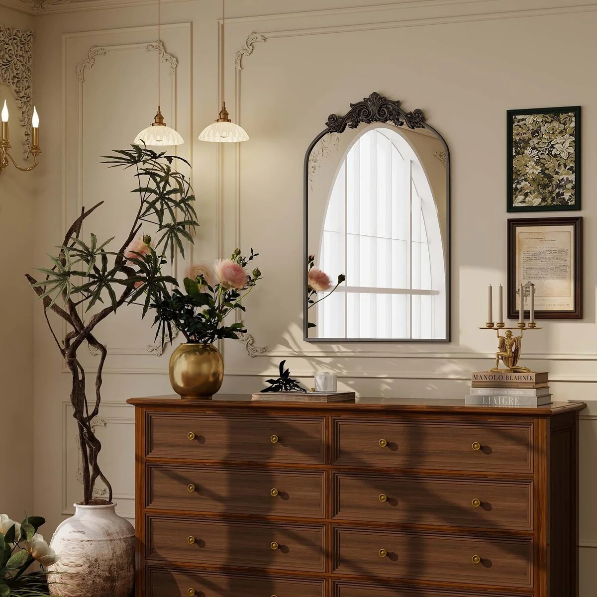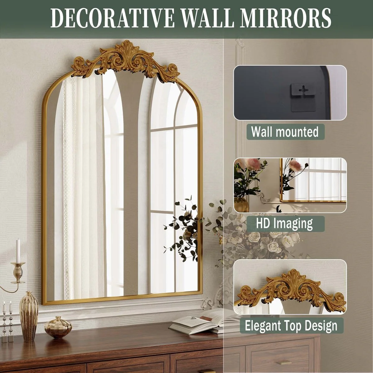 Arched Baroque Bathroom Mirror with Bottom Floral Decor
