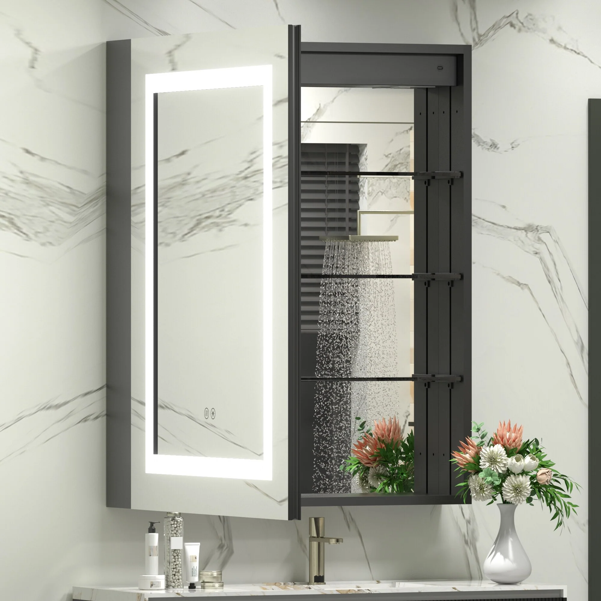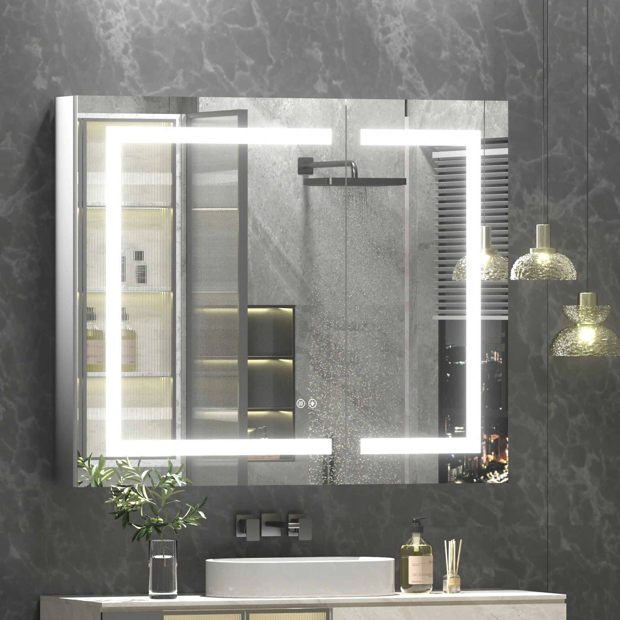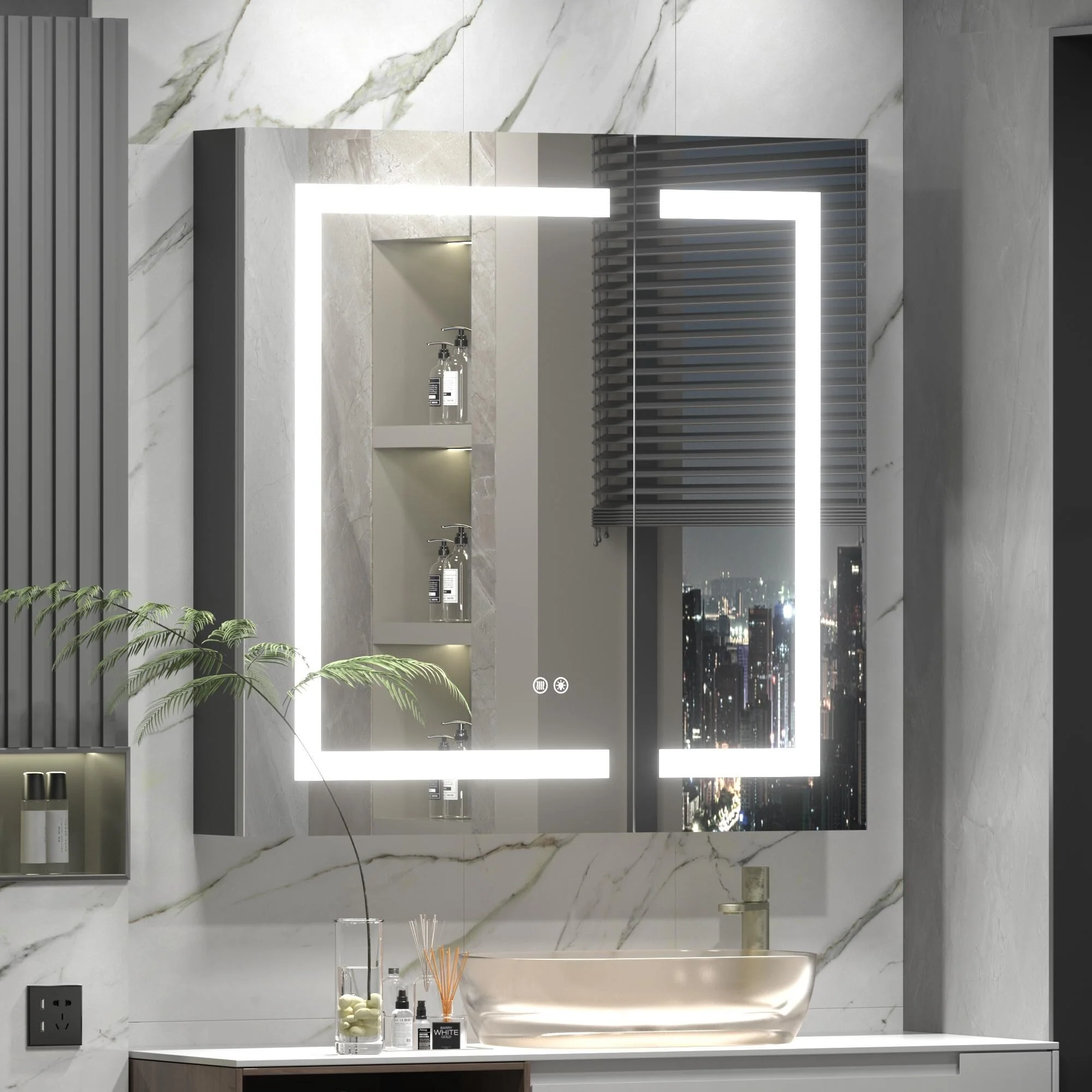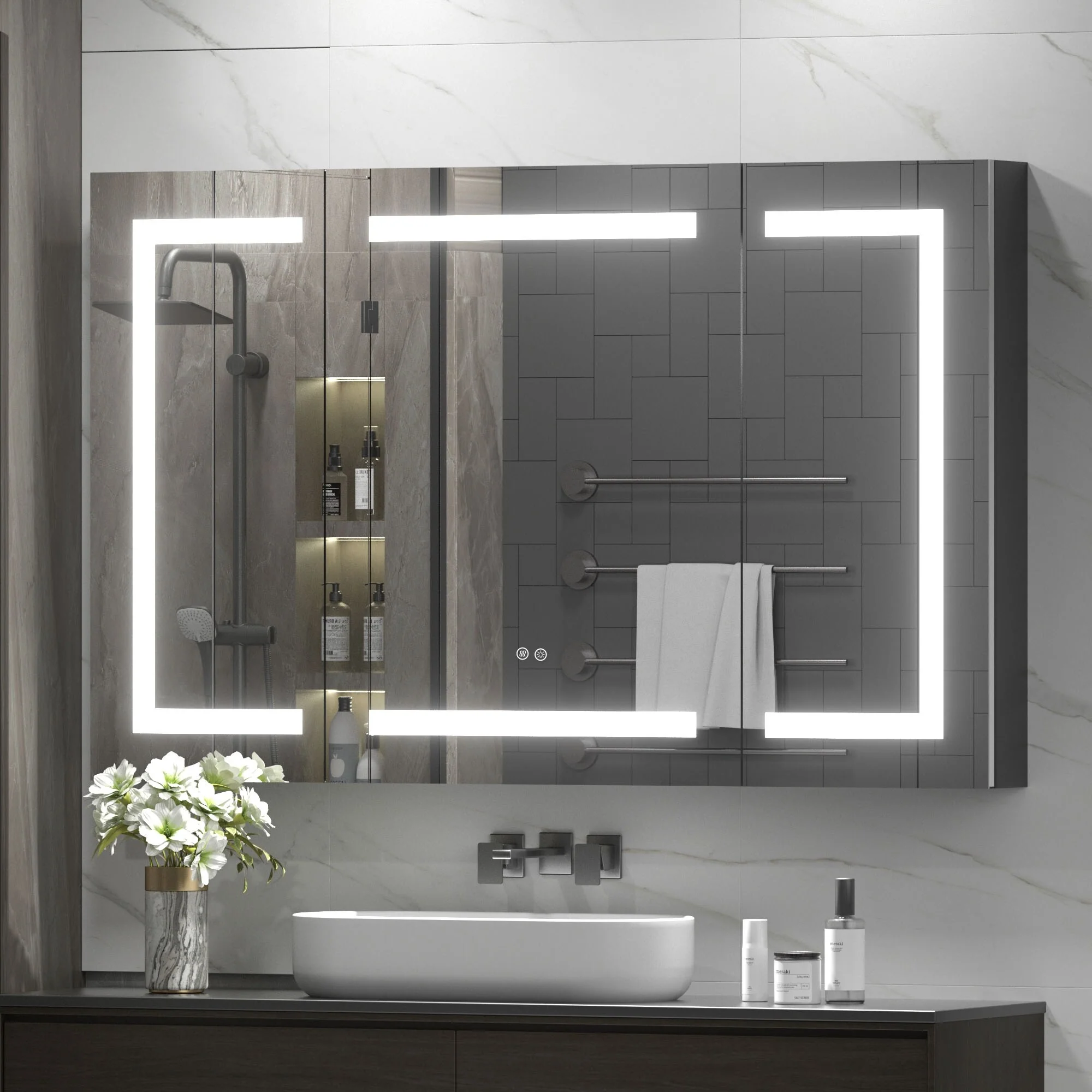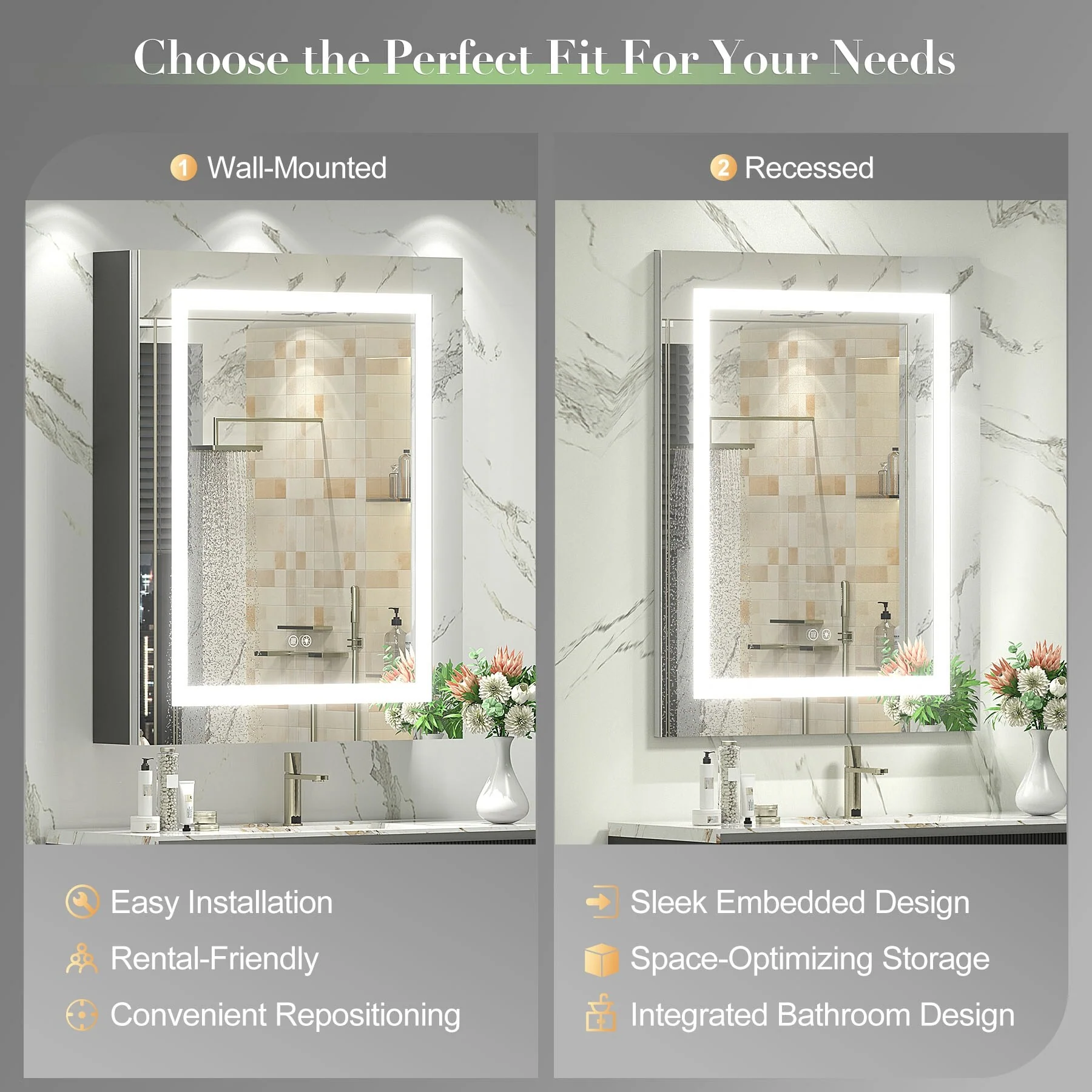 KIOTEE LED Lighted Recessed or Surface Mount Medicine Cabinet Mirror with Dimmable Light and Socket