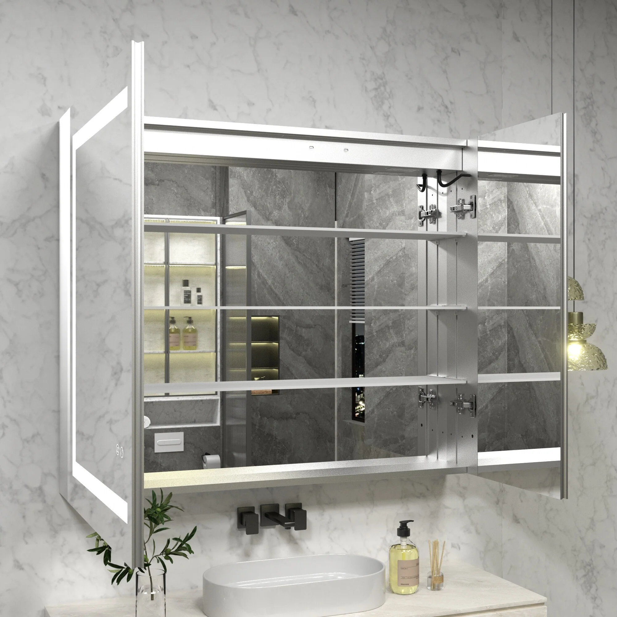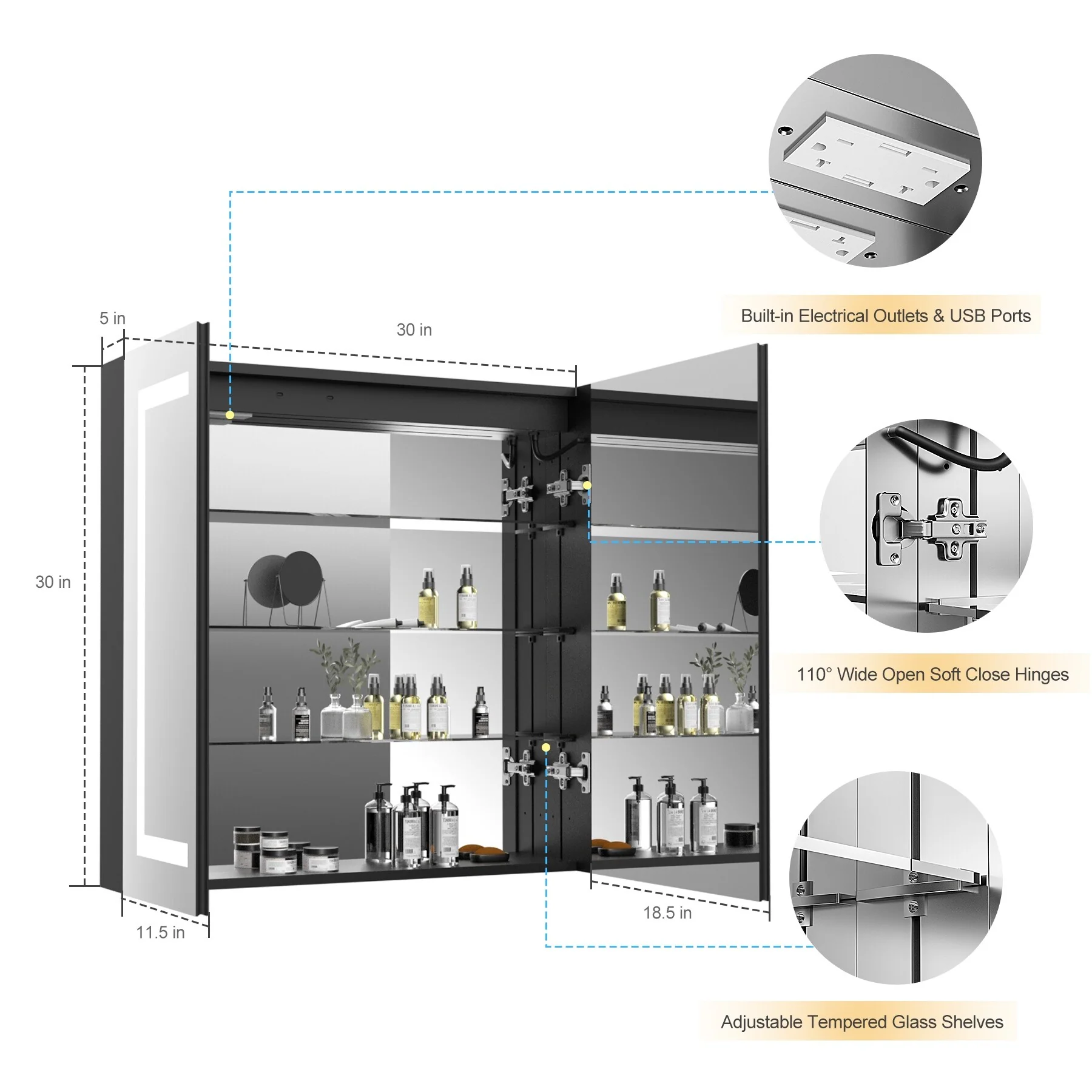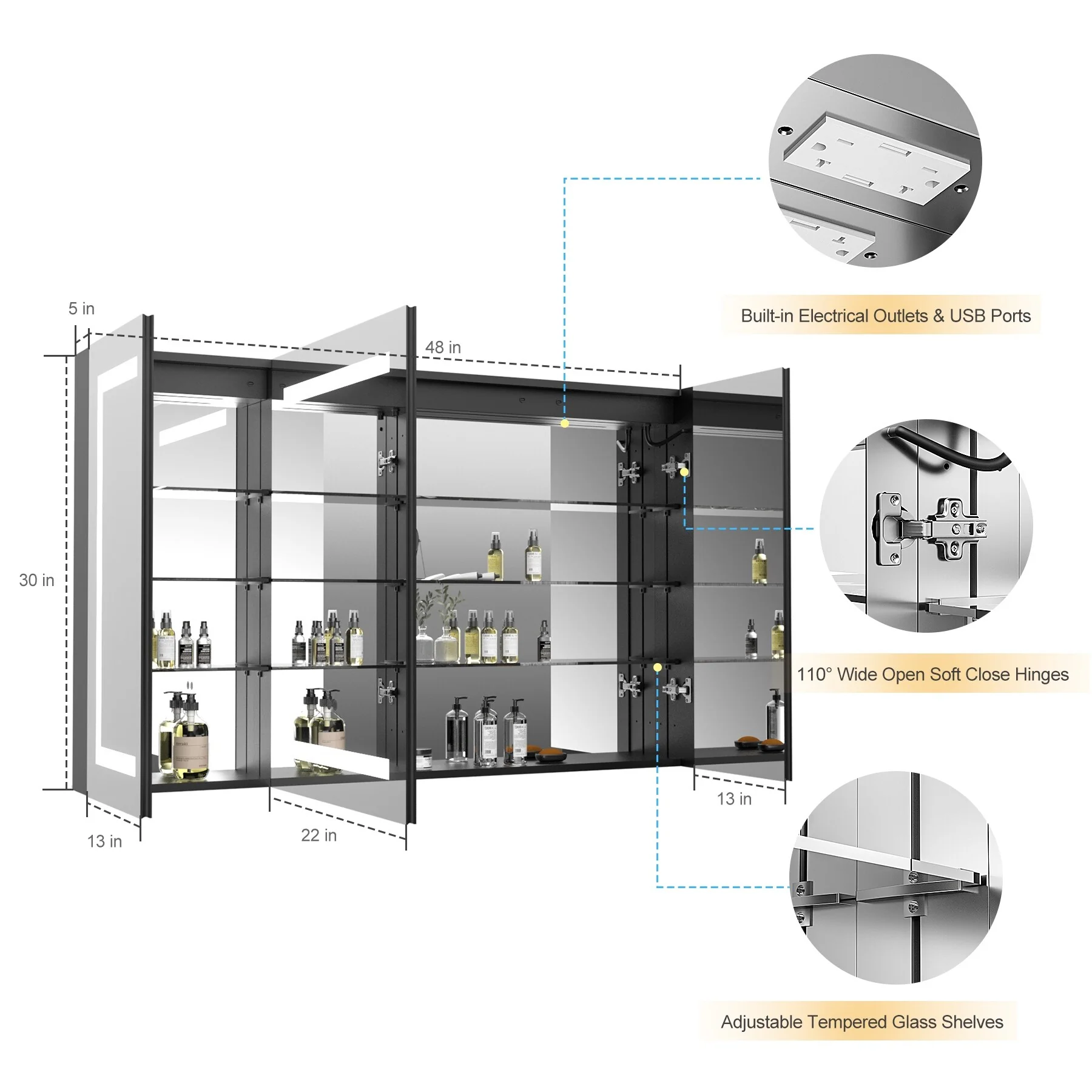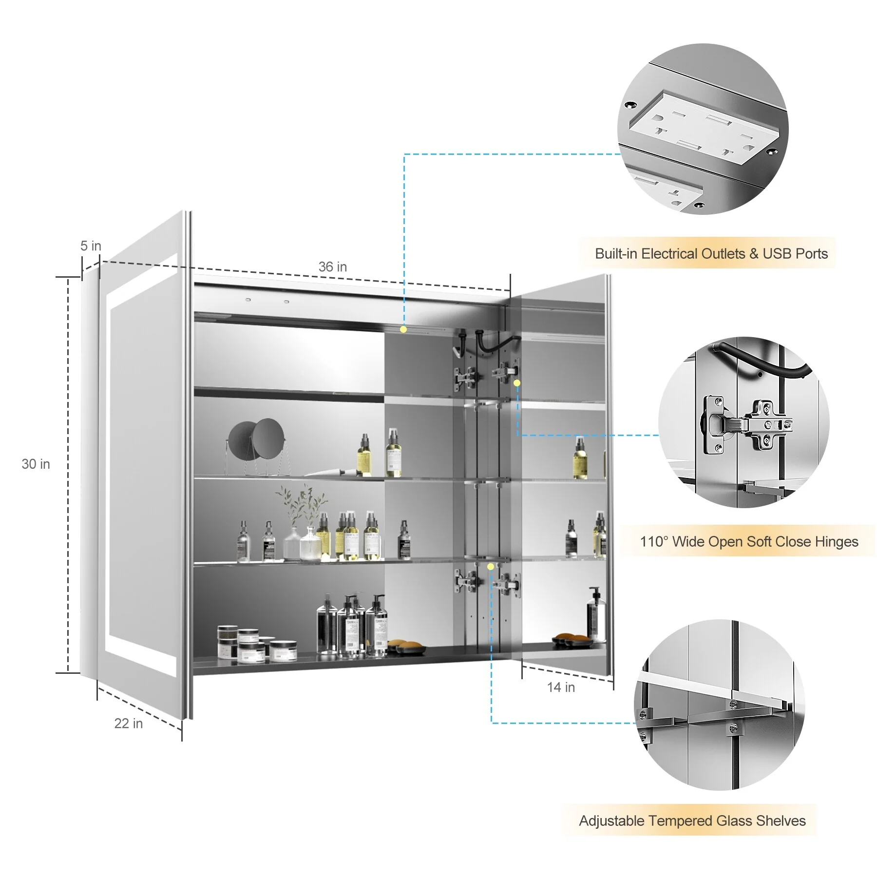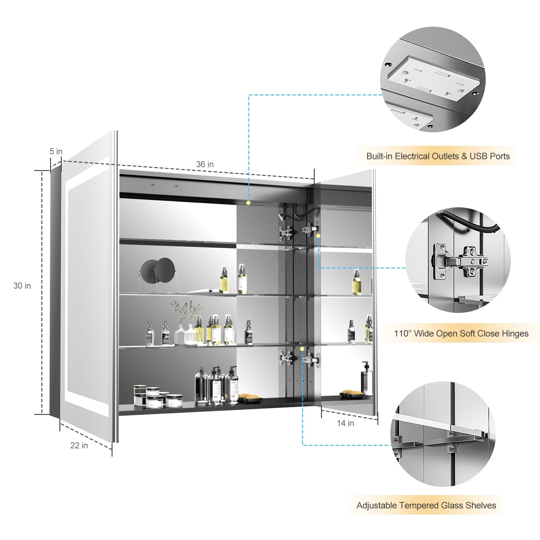 KIOTEE LED Lighted Recessed or Surface Mount Medicine Cabinet Mirror with Dimmable Light and Socket