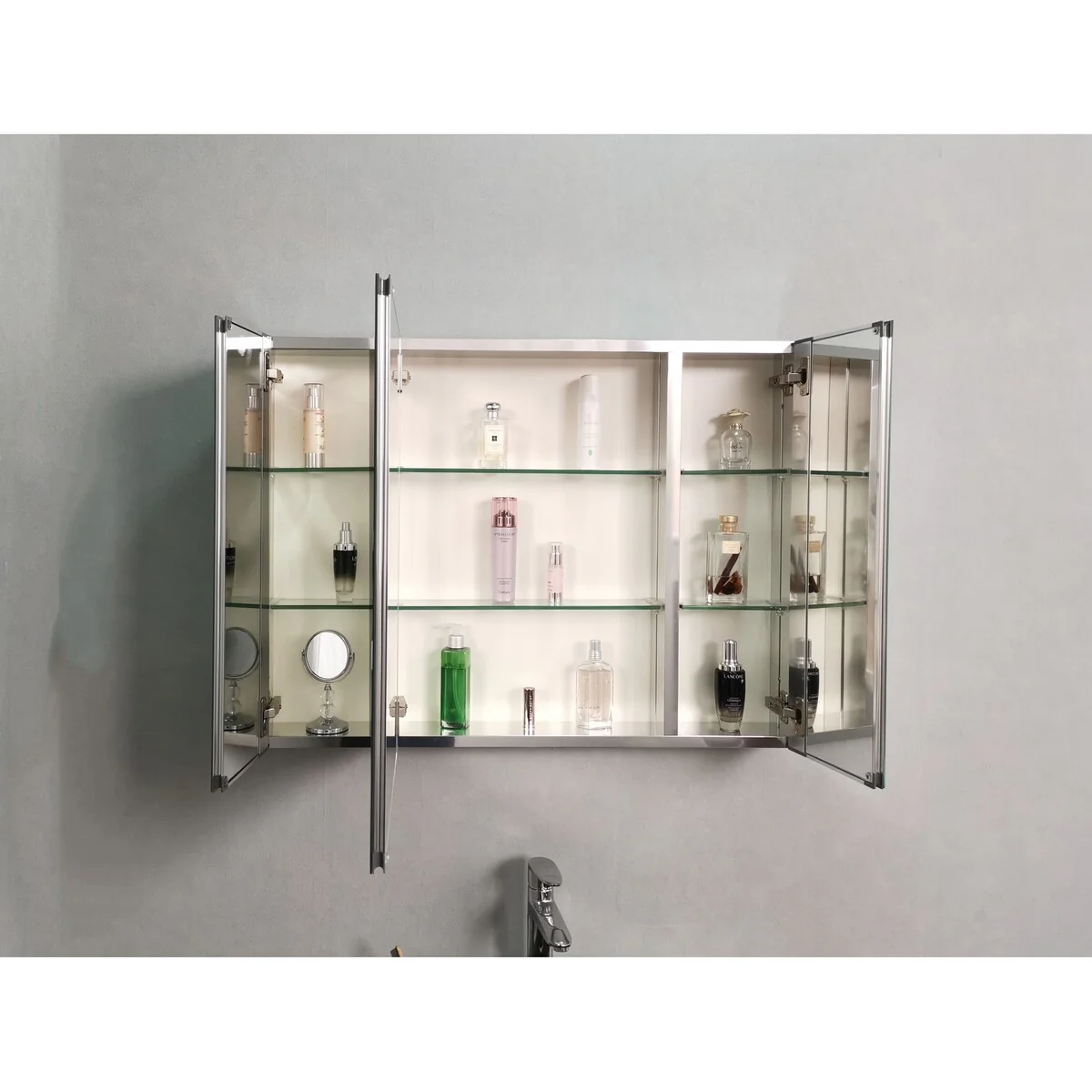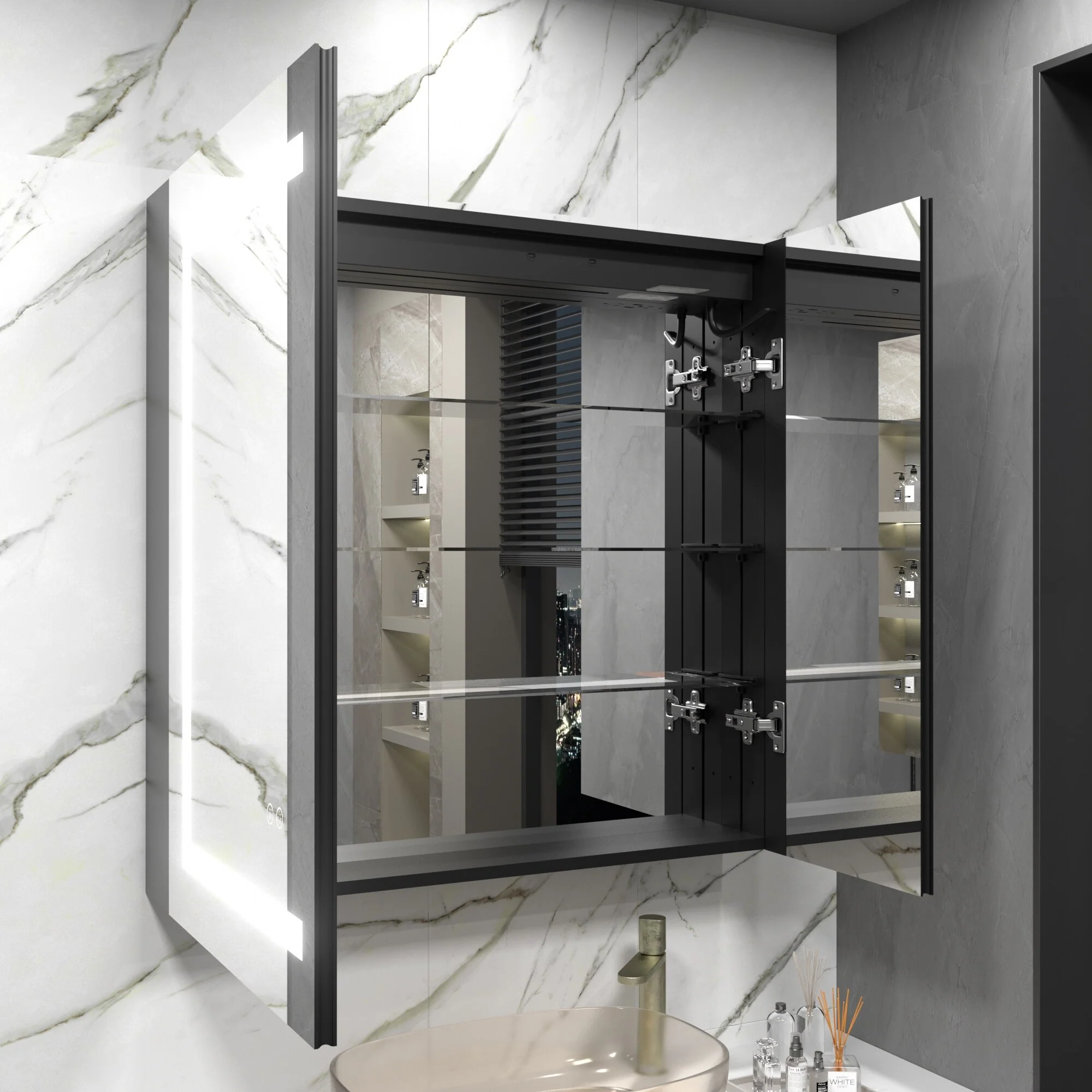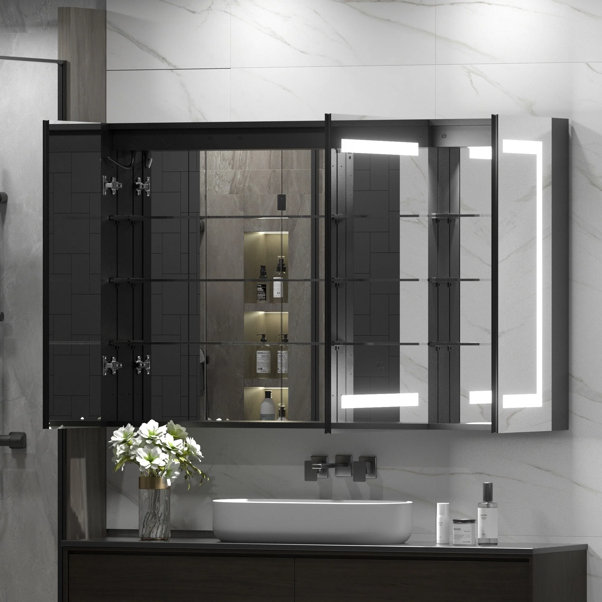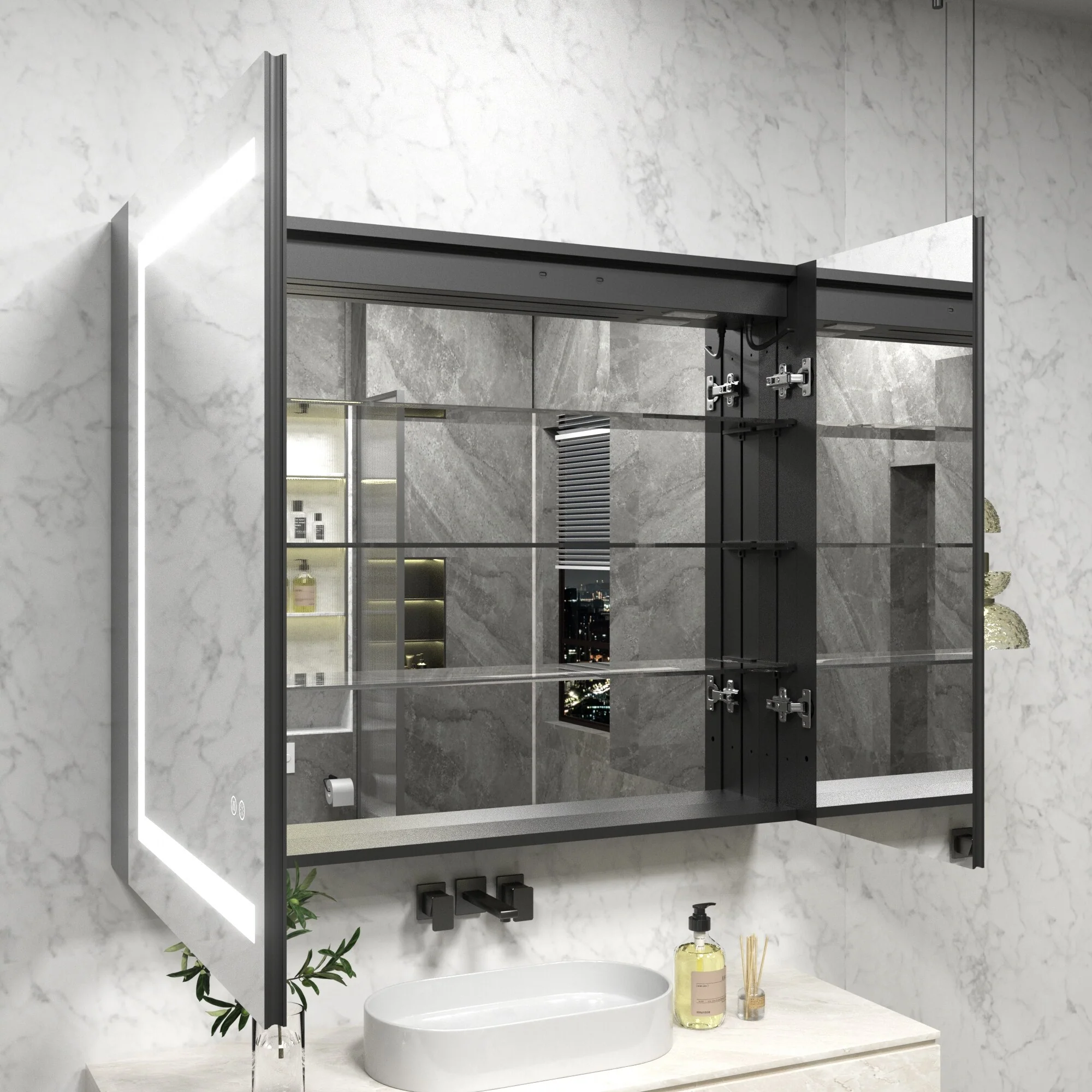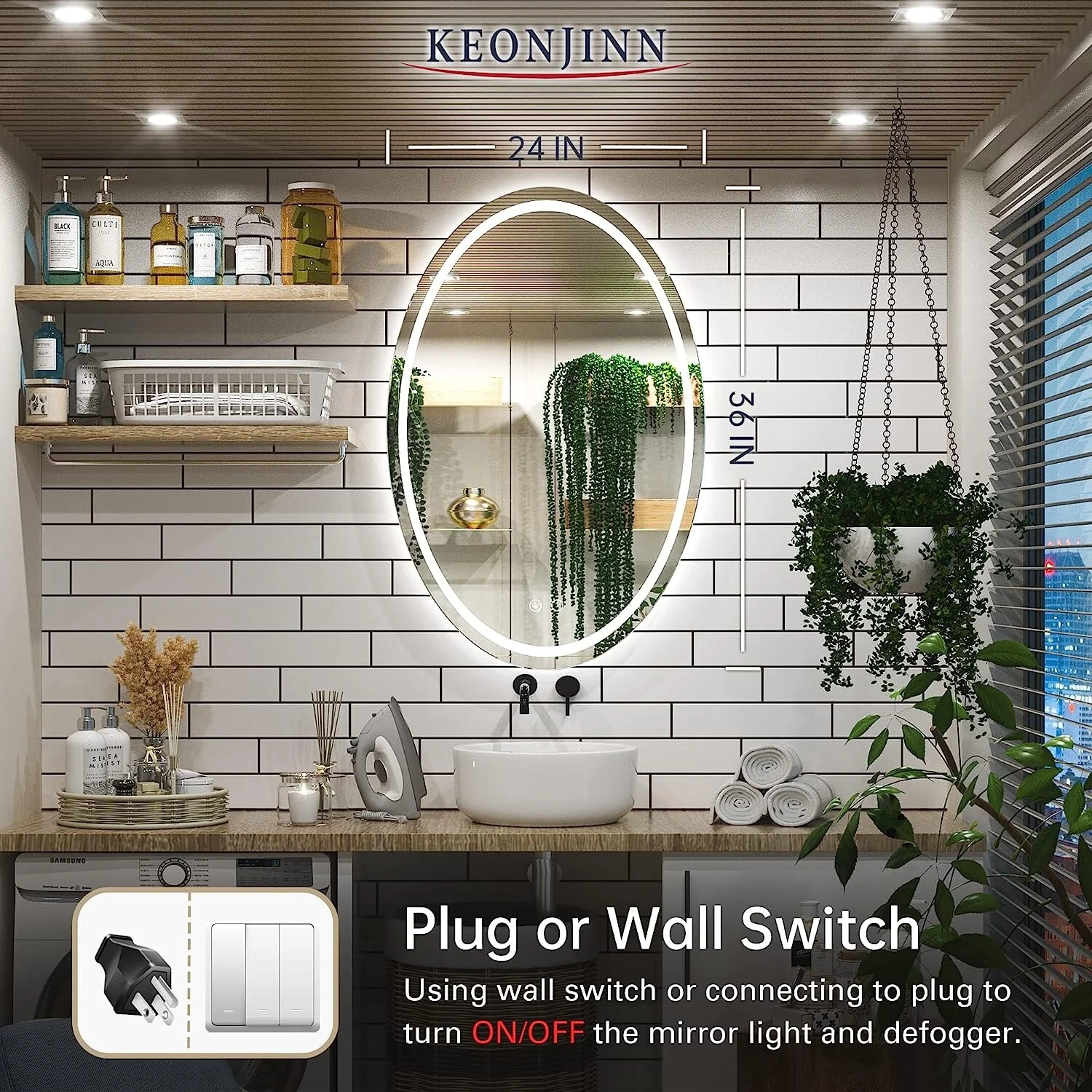 KIOTEE LED Lighted Recessed or Surface Mount Medicine Cabinet Mirror with Dimmable Light and Socket