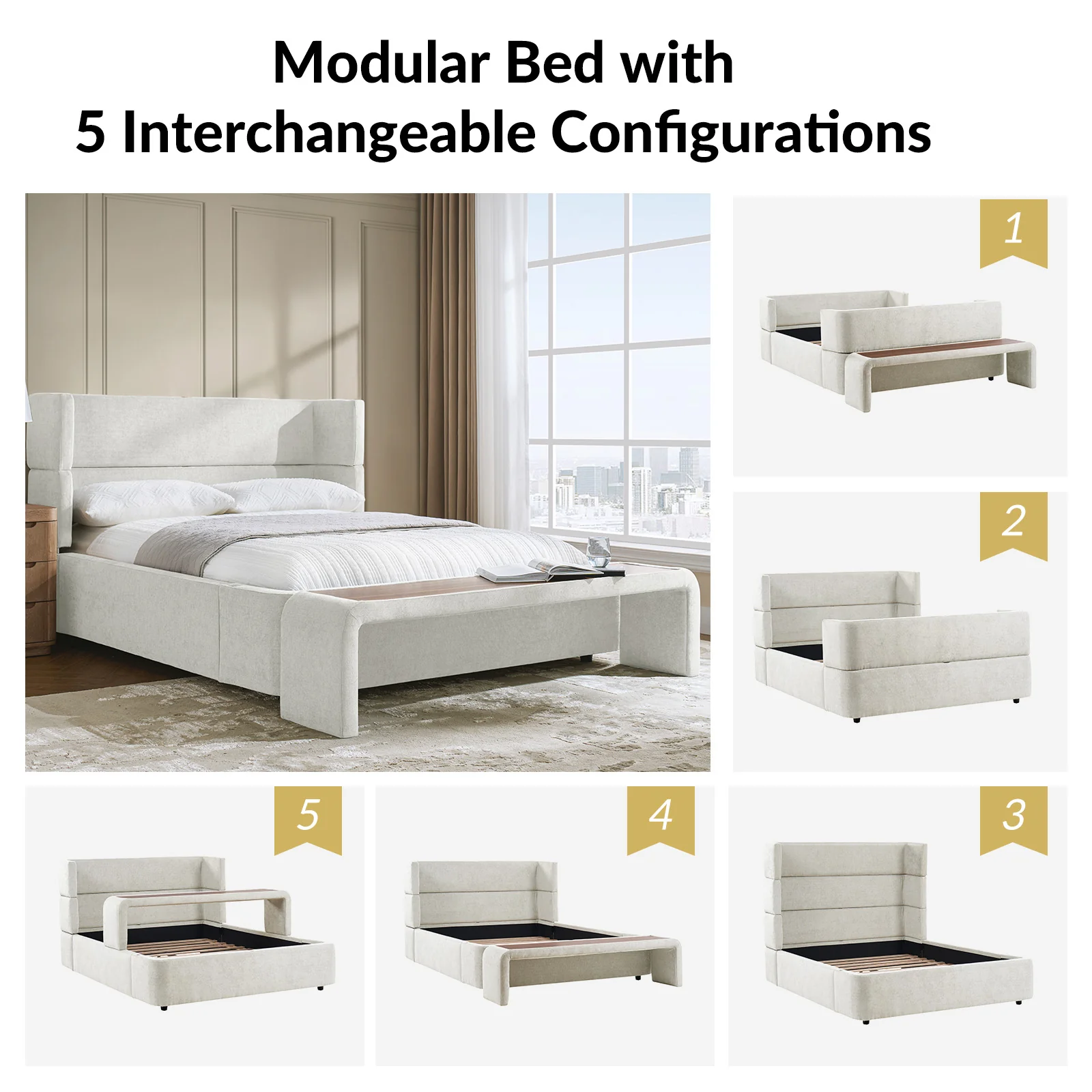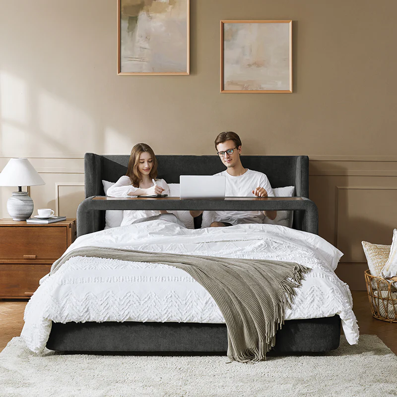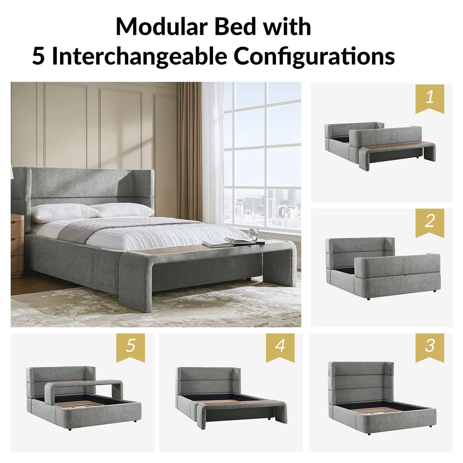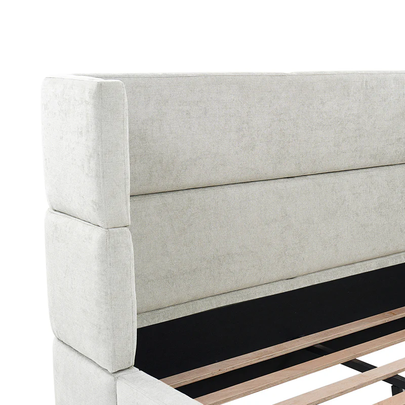 Presenting this modern upholstered bed, designed for versatility and style. This modular bed offers different possibilities with four interchangeable configurations. Firstly, it serves as a convenient overbed table, suitable for meals, movie nights, or work sessions from the comfort of your bed. Secondly, it transforms into a sleek bed bench, adding extra seating or storage at the foot of your bed. For those seeking elevated comfort, the high headboard option provides ample support for lounging or reading. Finally, the sled bed configuration with an attached footboard brings a classic touch. Crafted with comfortable upholstery, this contemporary wingback bed offers the flexibility to adapt to your lifestyle and space requirements. Upgrade your bedroom with the versatile and stylish upholstered bed today.