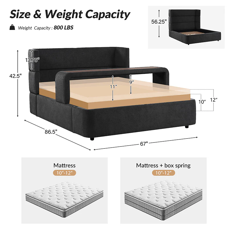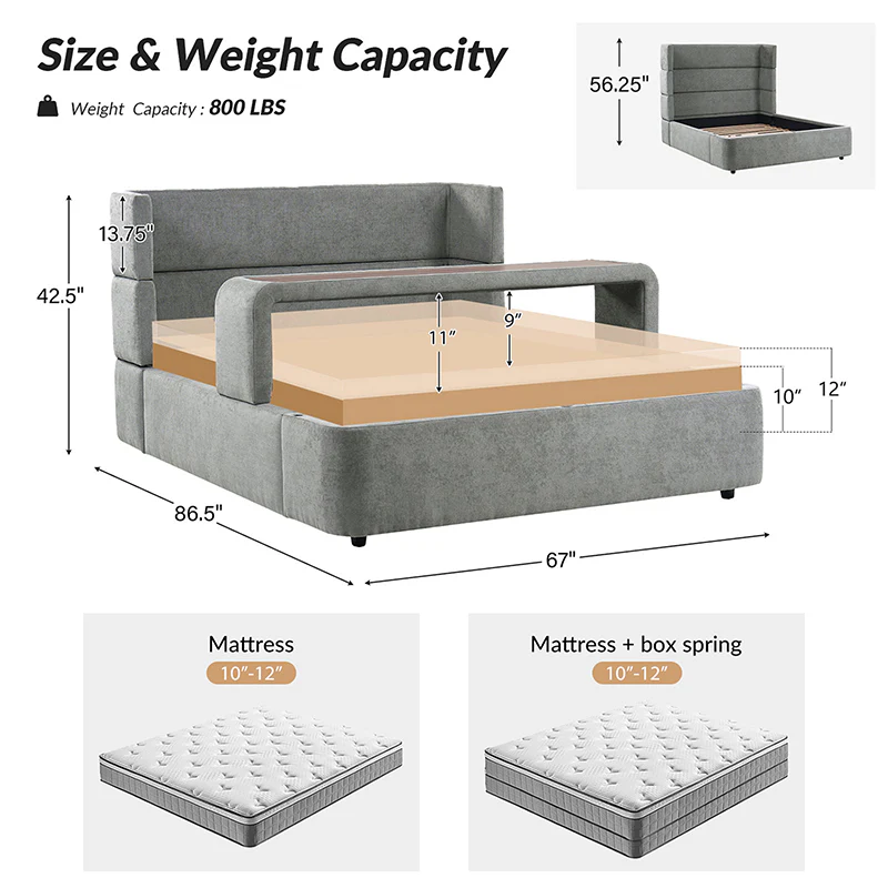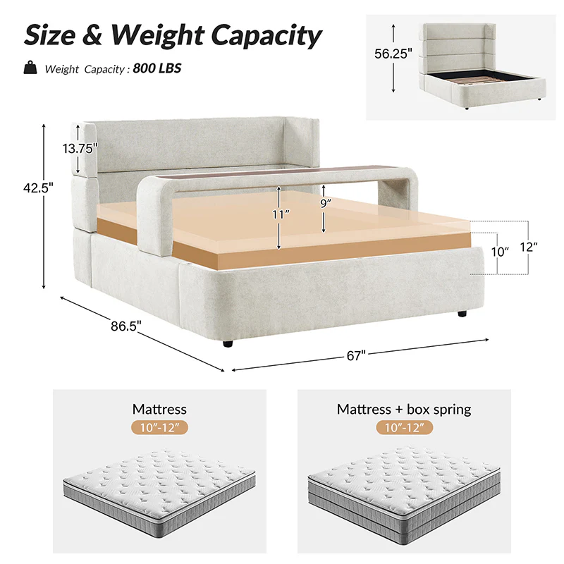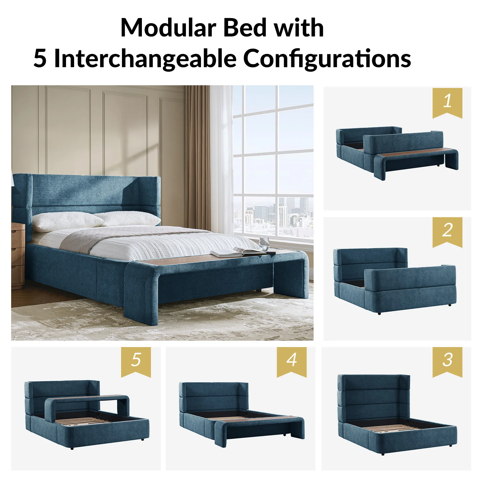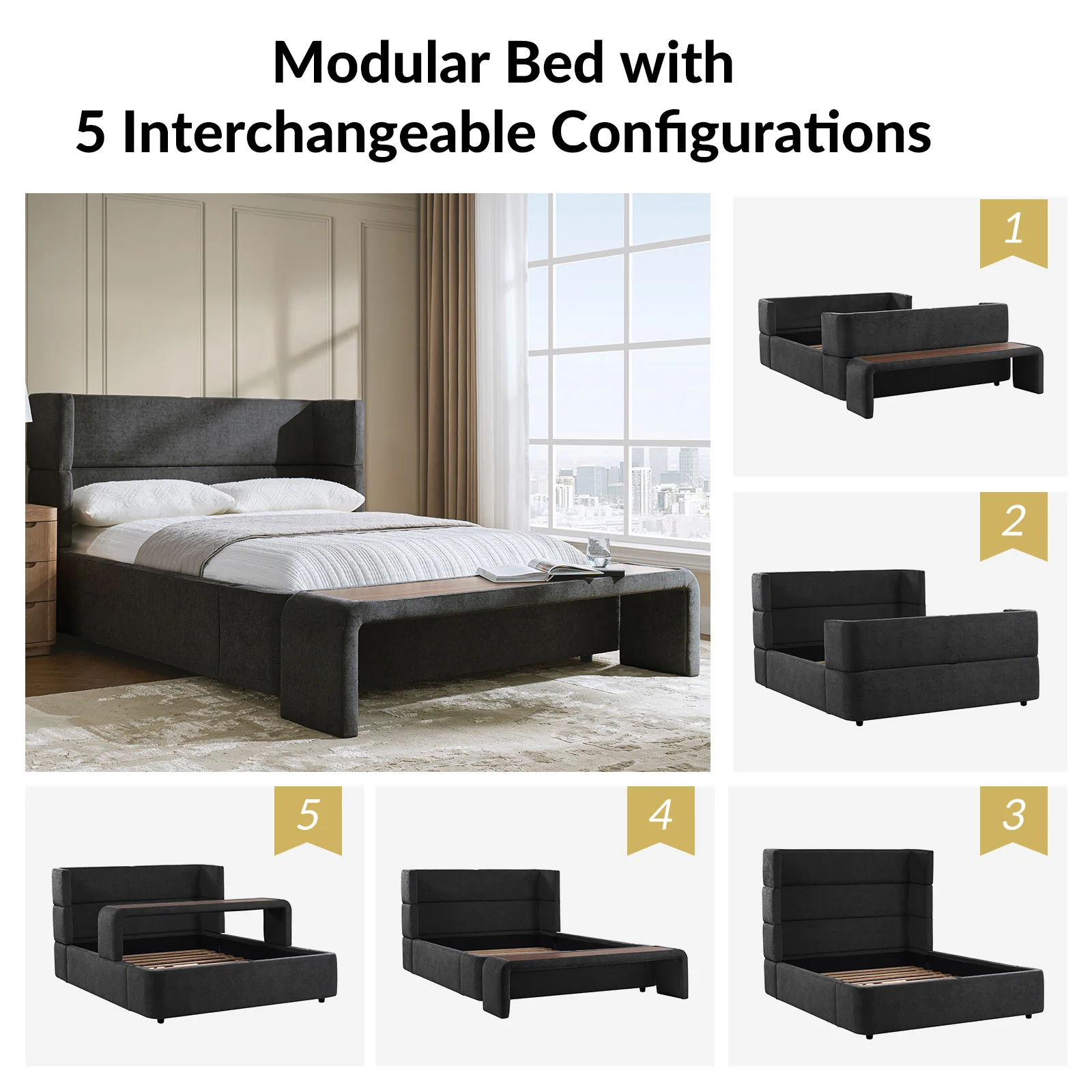 Presenting this modern upholstered bed, designed for versatility and style. This modular bed offers different possibilities with four interchangeable configurations. Firstly, it serves as a convenient overbed table, suitable for meals, movie nights, or work sessions from the comfort of your bed. Secondly, it transforms into a sleek bed bench, adding extra seating or storage at the foot of your bed. For those seeking elevated comfort, the high headboard option provides ample support for lounging or reading. Finally, the sled bed configuration with an attached footboard brings a classic touch. Crafted with comfortable upholstery, this contemporary wingback bed offers the flexibility to adapt to your lifestyle and space requirements. Upgrade your bedroom with the versatile and stylish upholstered bed today.