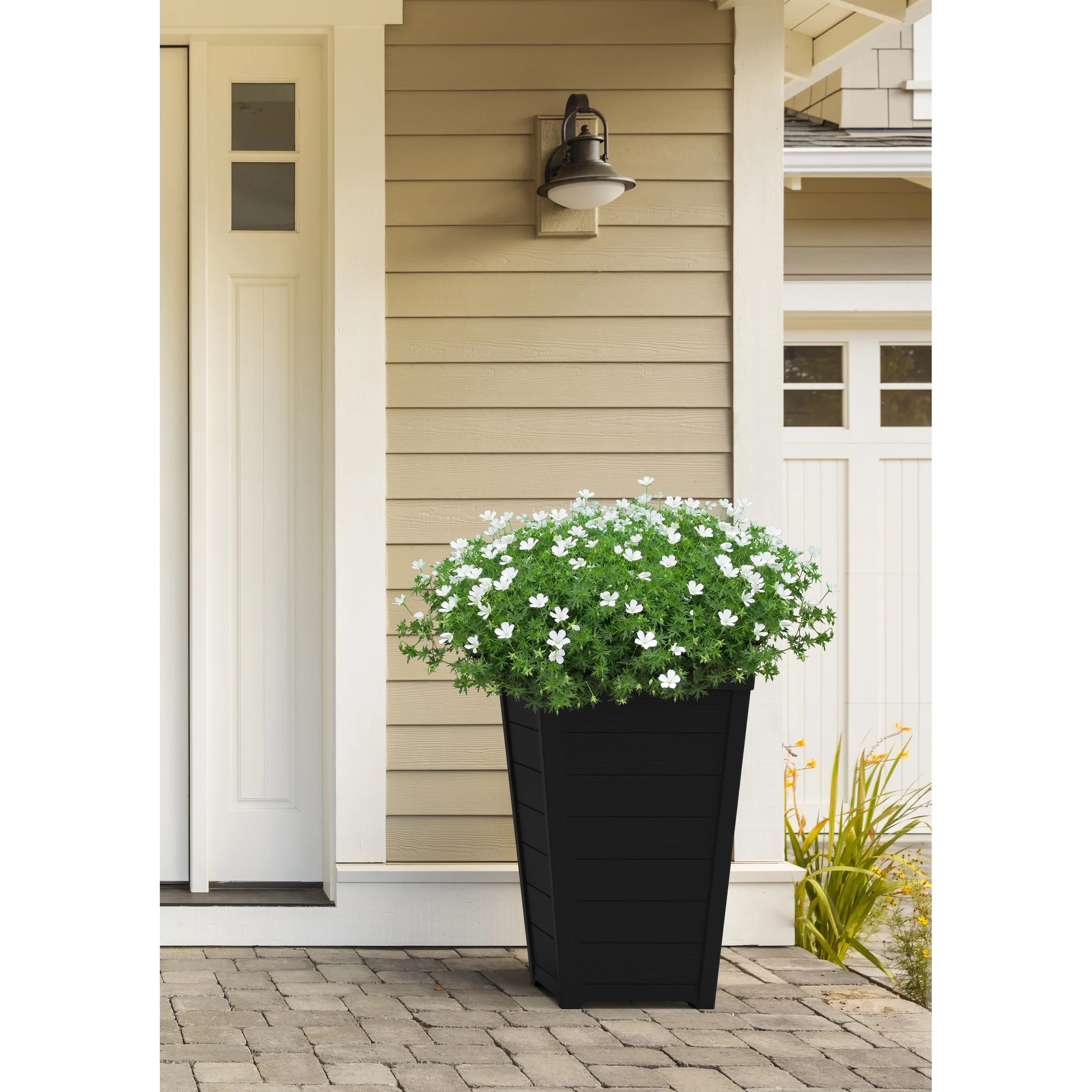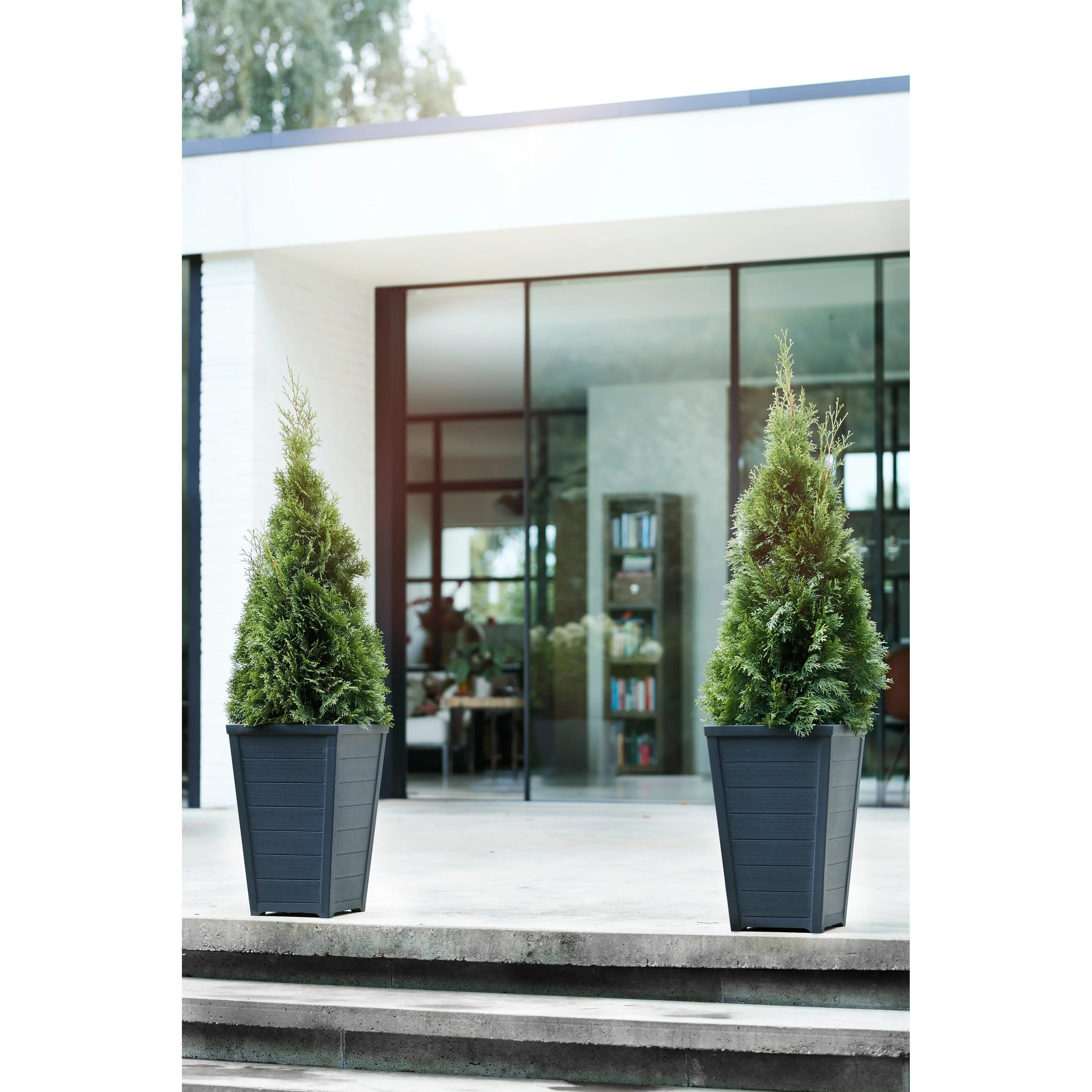 Keter Set of 2 Resin Modern Outdoor 22 Inch Tall Large Flower Pot Planters in a Stylish Tapered Wood Look Pattern