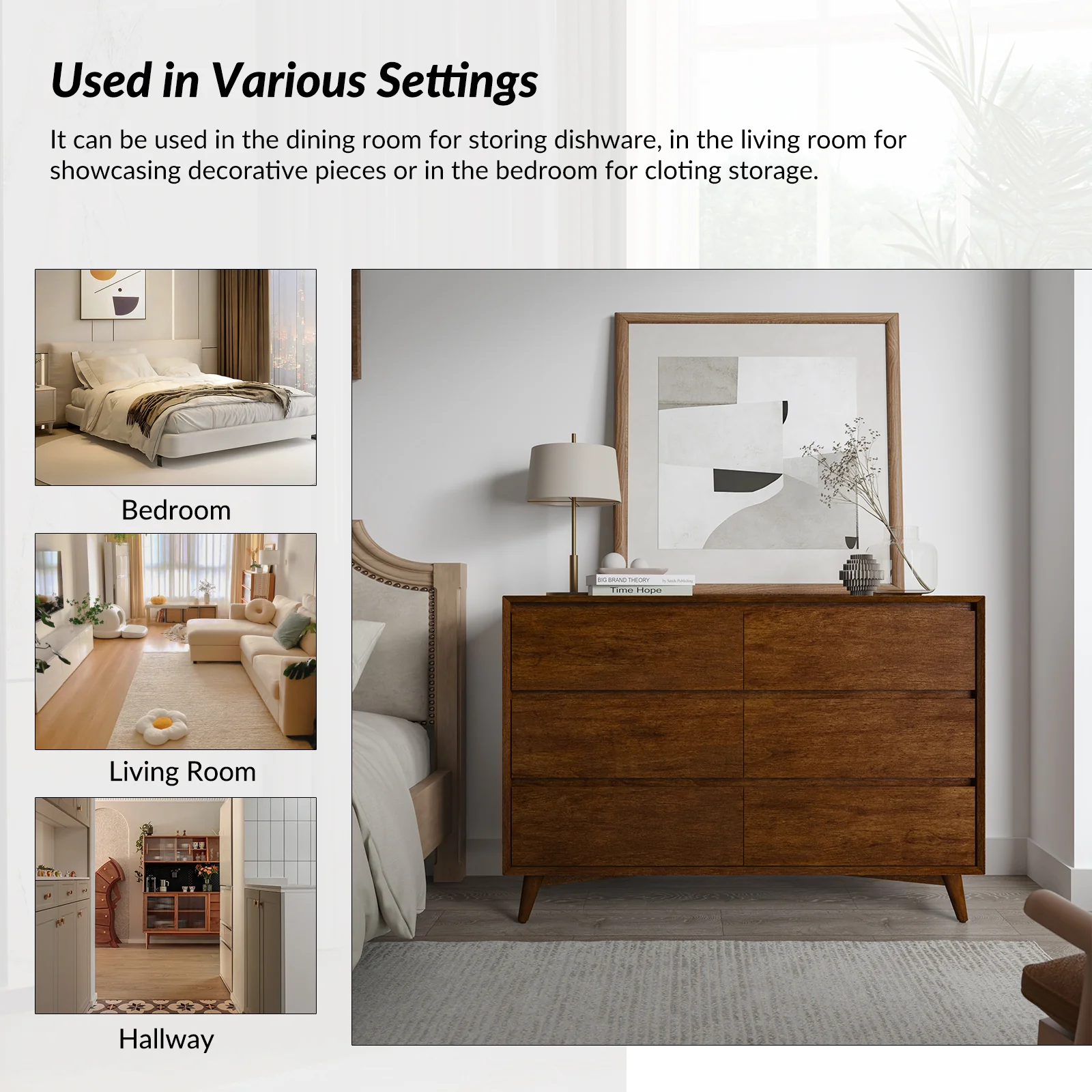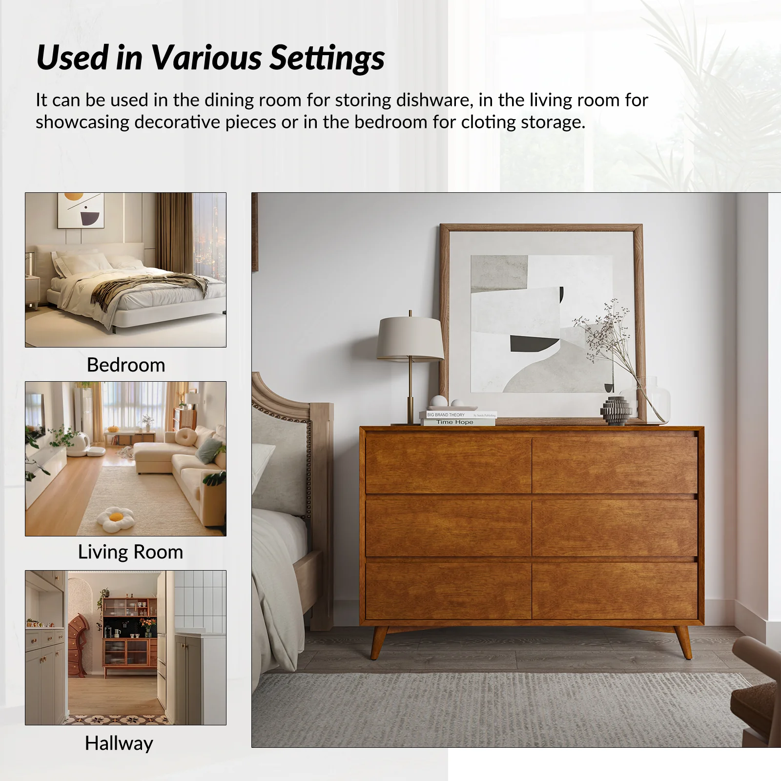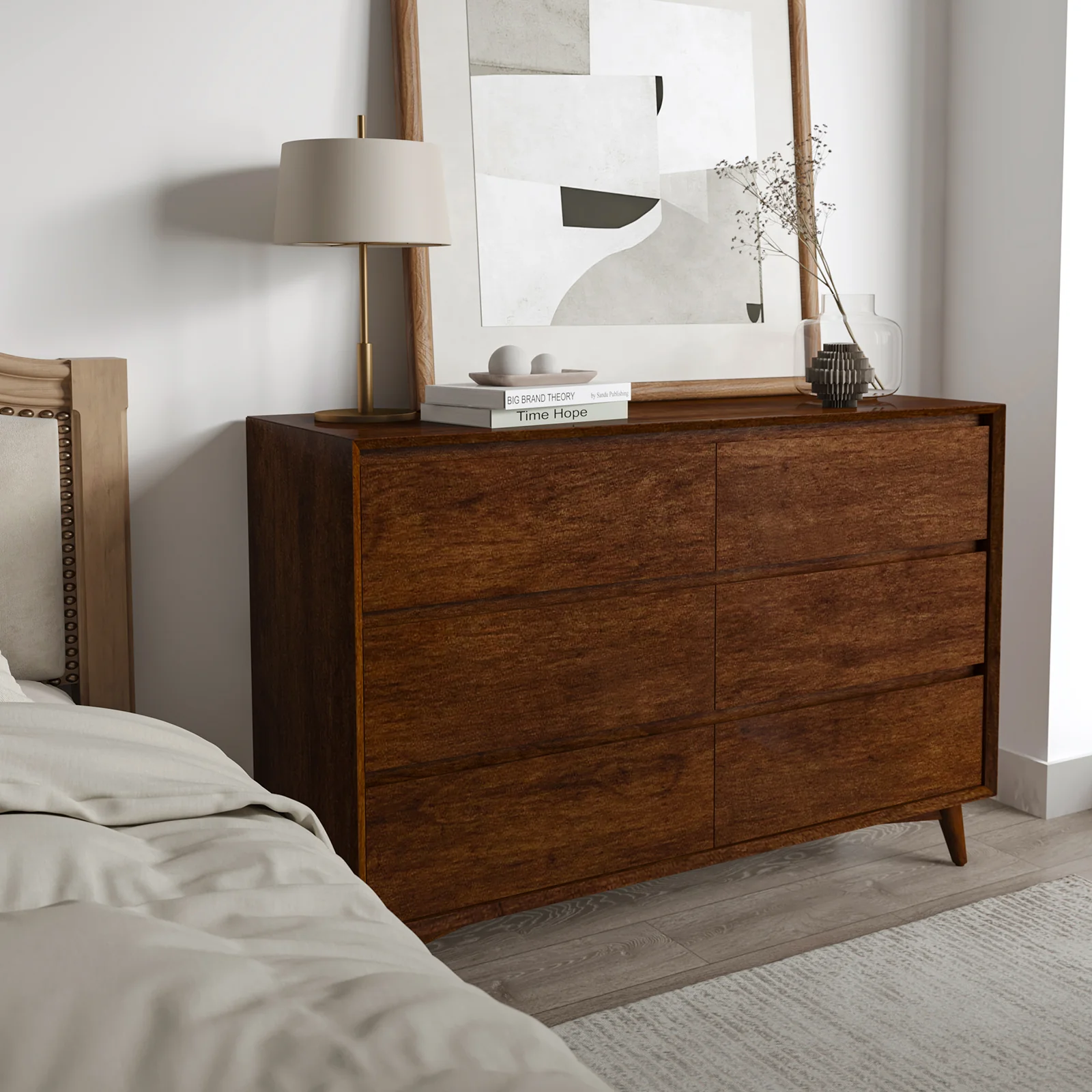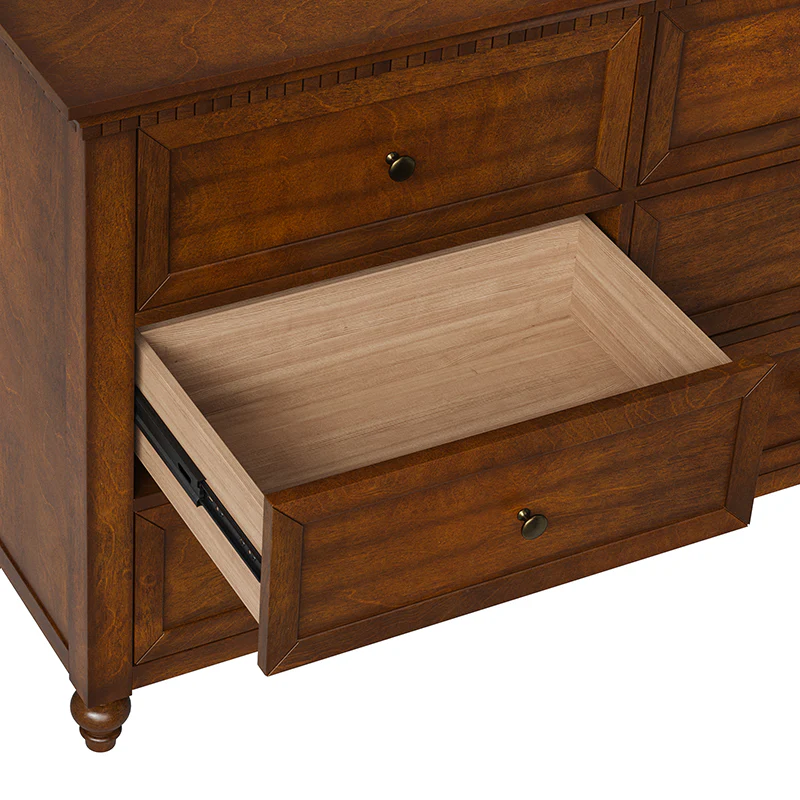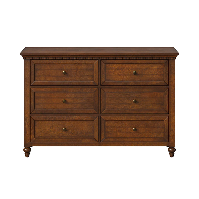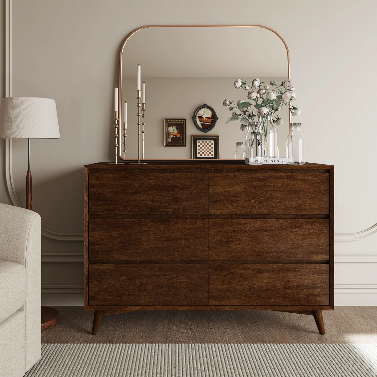 Apollone Mid-Century 6-Drawer Dresser with Solid Wood Legs and Adjustable Feet
