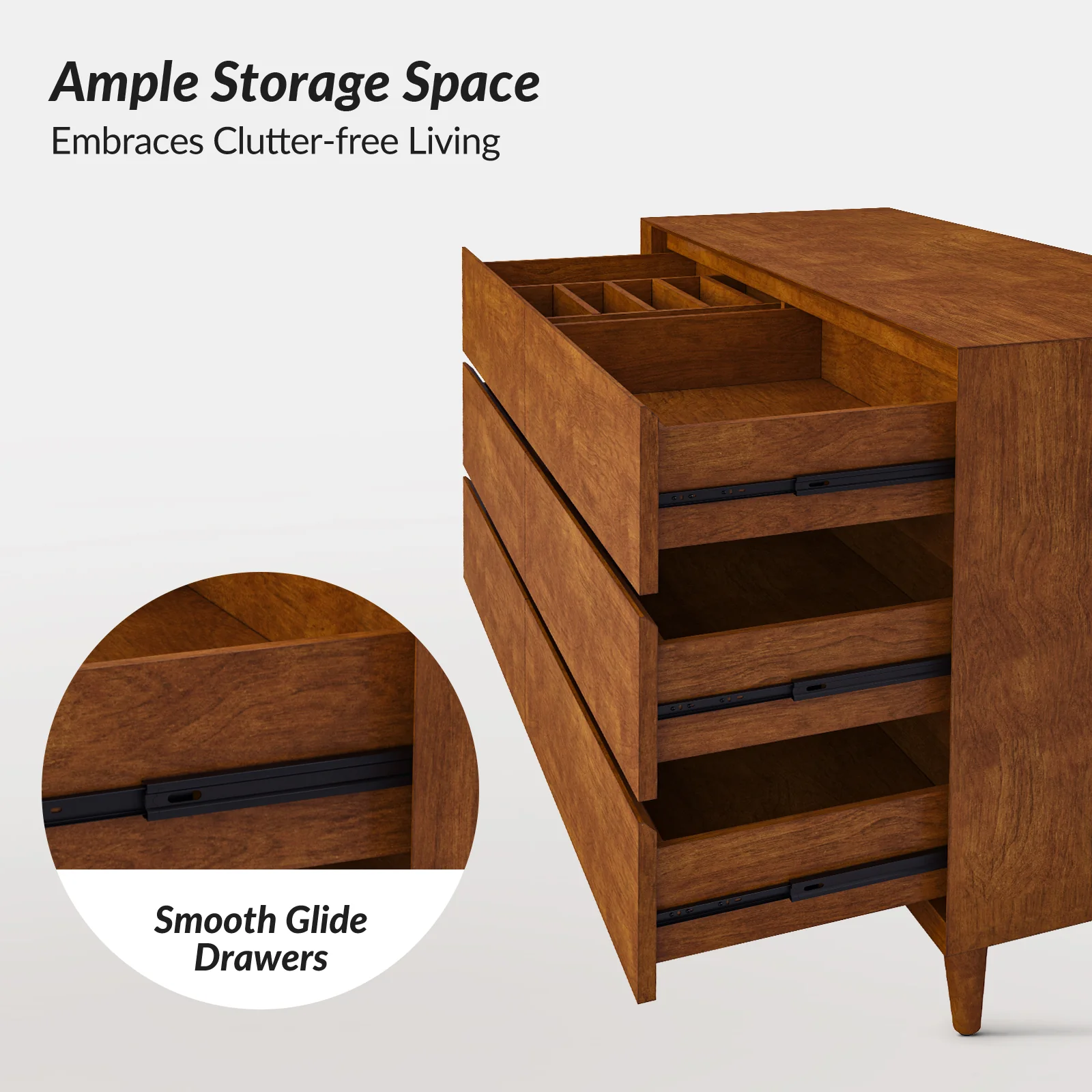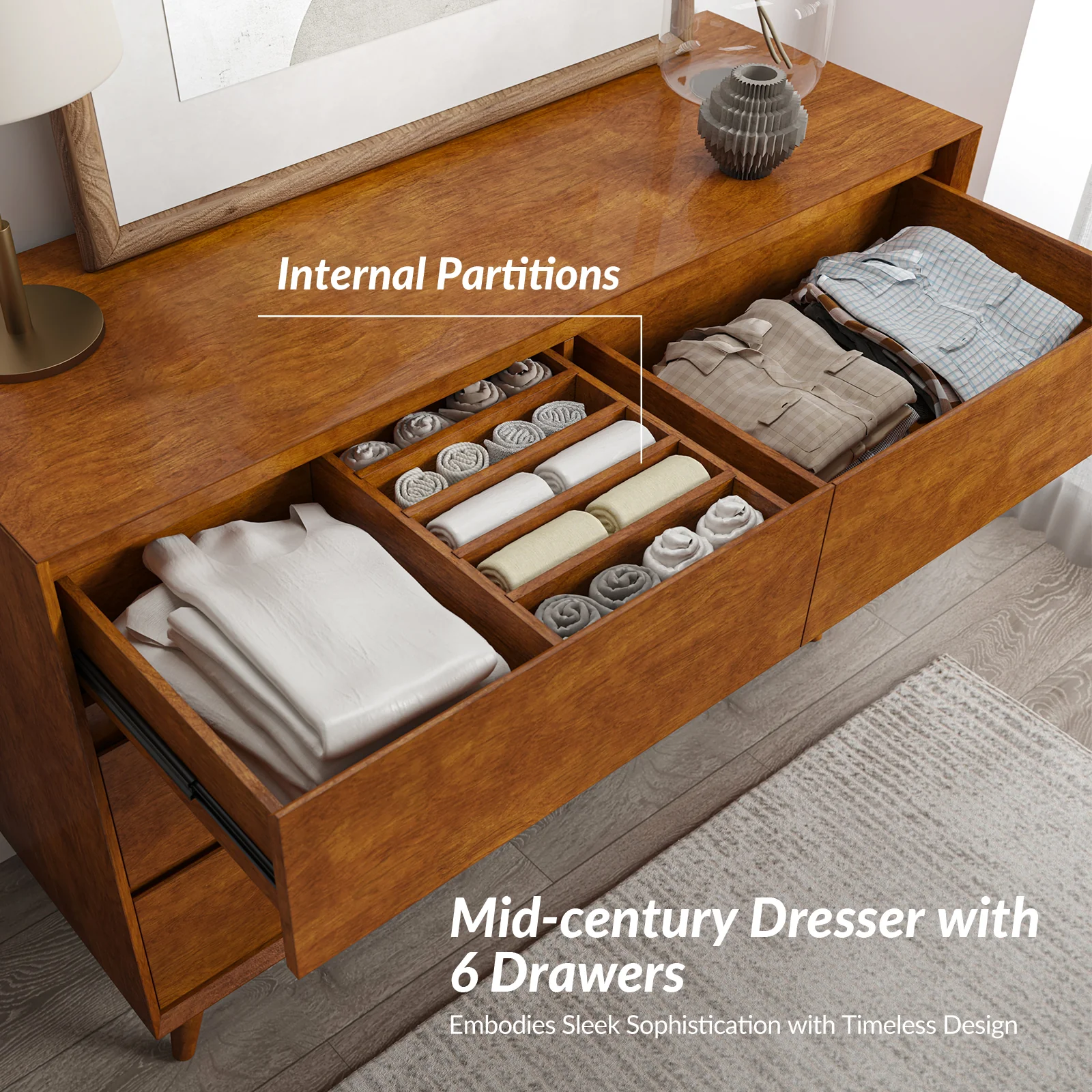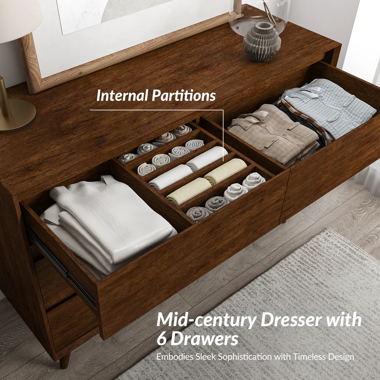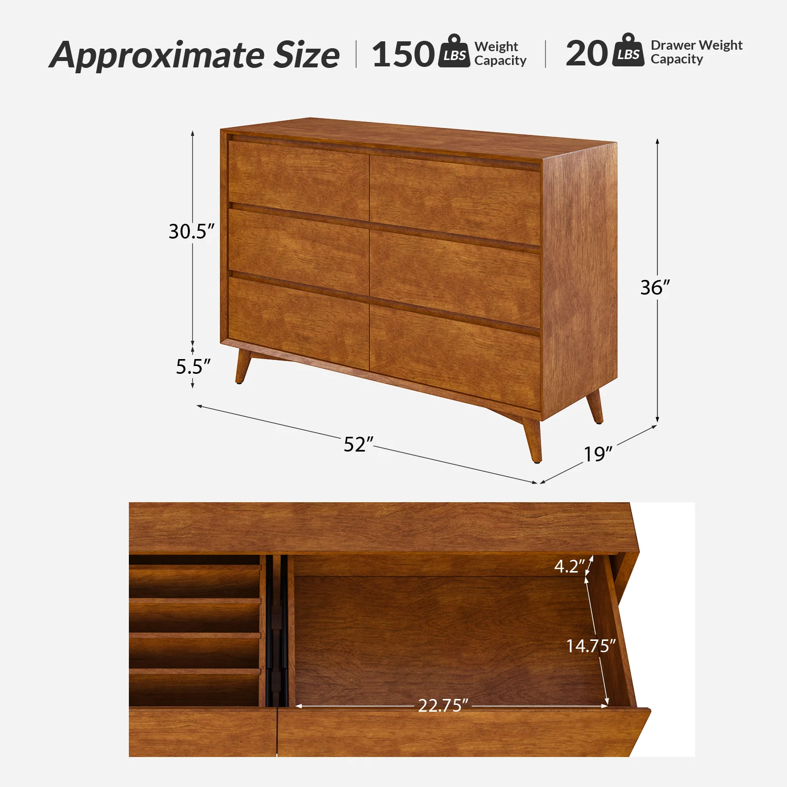 Apollone Mid-Century 6-Drawer Dresser with Solid Wood Legs and Adjustable Feet