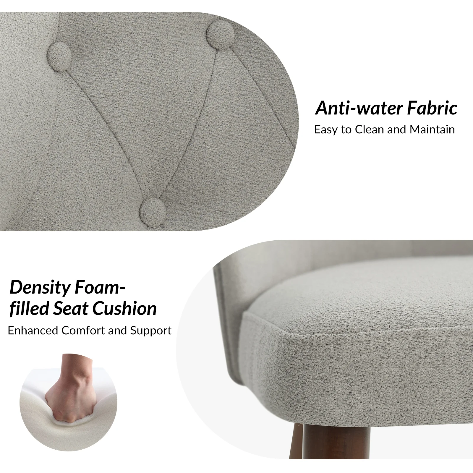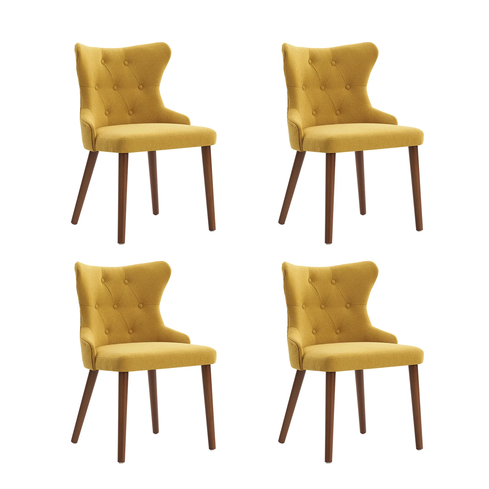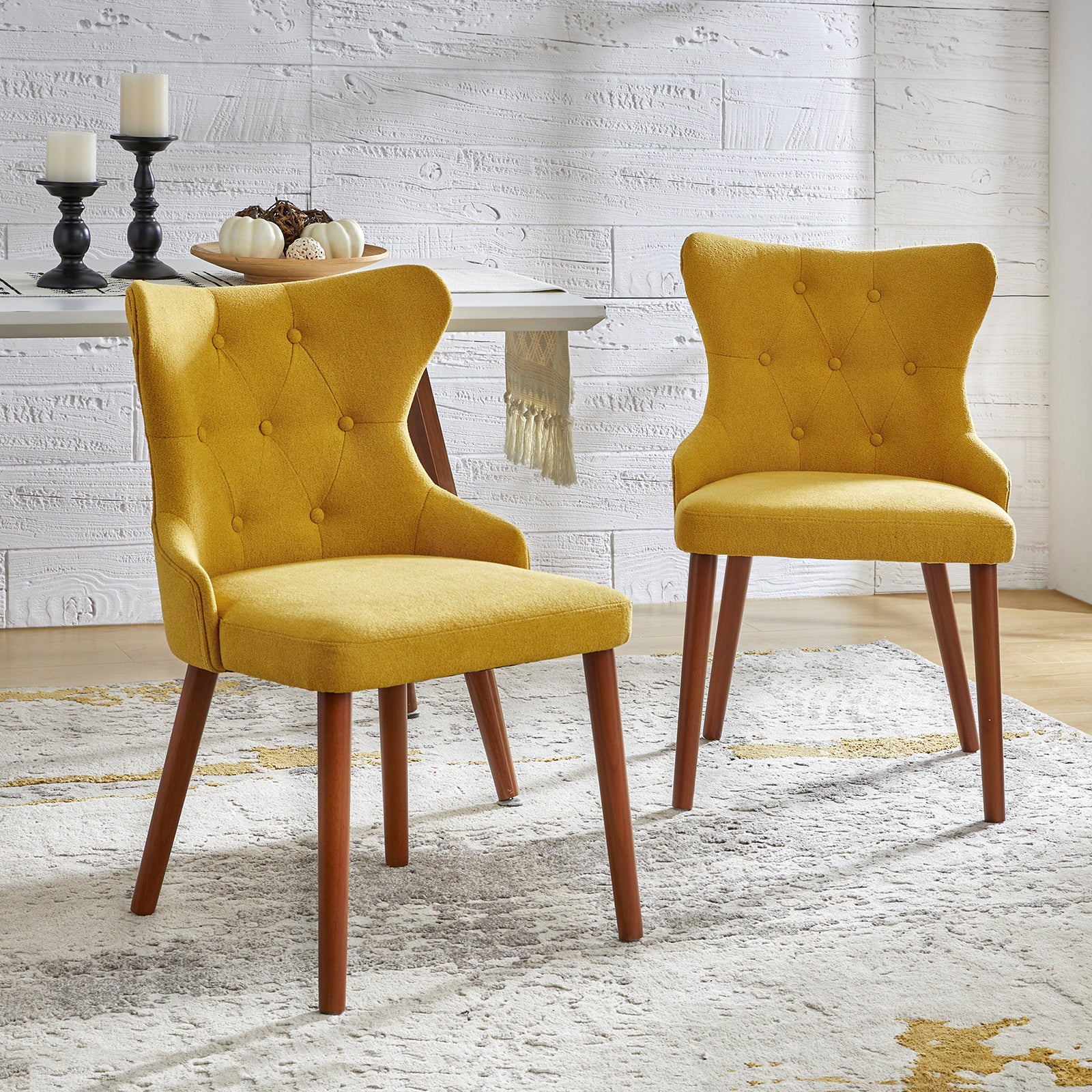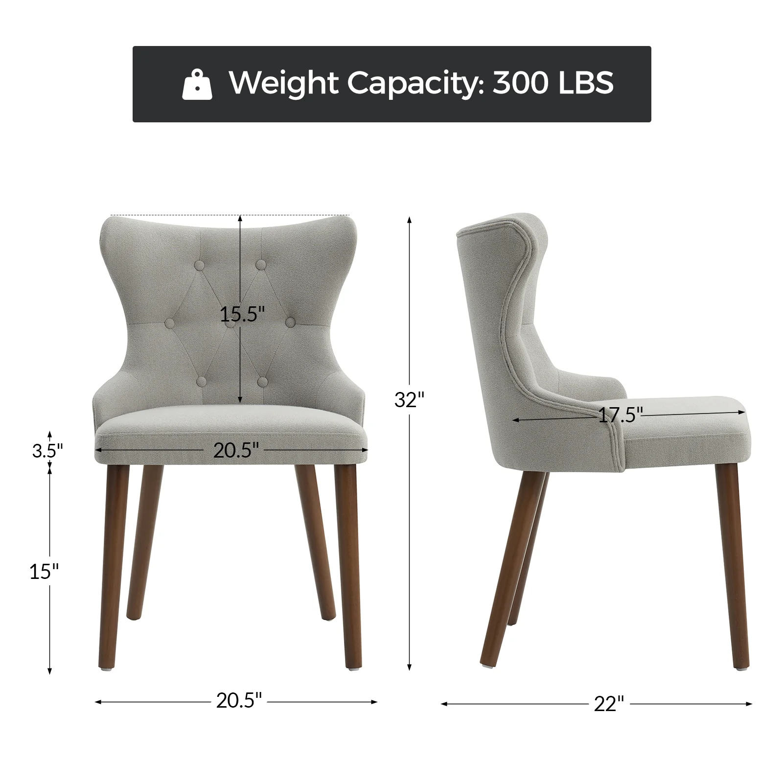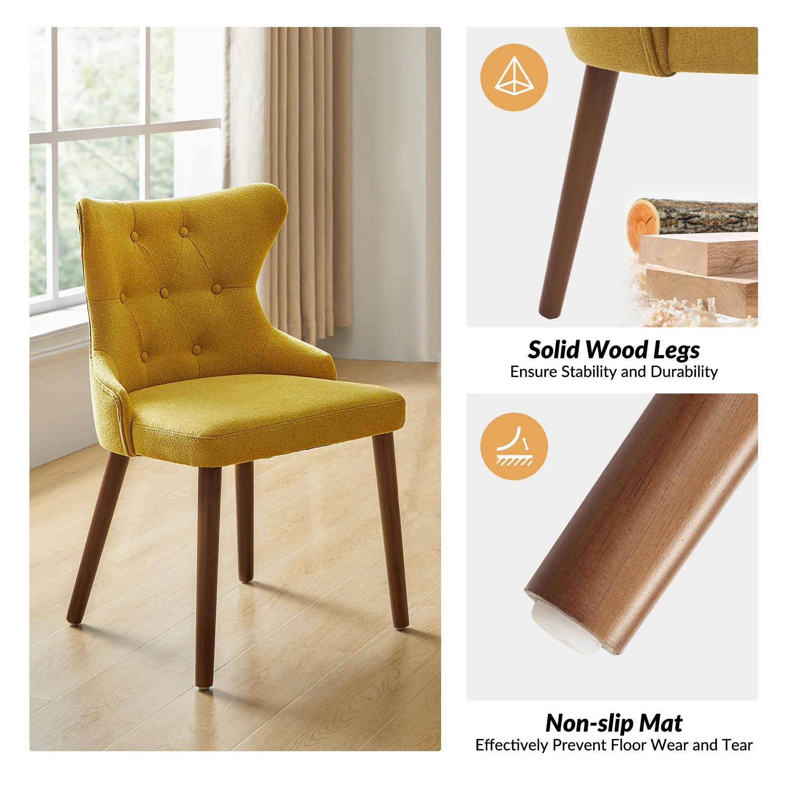 This mid-century modern dining chair set brings sophistication and comfort to your dining area. The set includes elegant wingback chairs, each designed with solid wood legs for a sturdy and classic foundation. The backrests feature a button-tufted design, adding a touch of vintage charm and visual interest to the chairs. Upholstered in waterproof fabric, these chairs are easy to maintain and keep clean, making them suitable for households with children or frequent guests. Crafted from high-density foam-filled seats that offer support, you can sit comfortably for extended periods. This dining chair is easy to install with threaded legs, and no tools are required. The ergonomic design ensures you and your guests can enjoy dinners or social gatherings without discomfort. Whether placed in a dining room, kitchen, or even as accent chairs in other living spaces, this dining chair set enhances any decor with its stylish mid-century modern design.