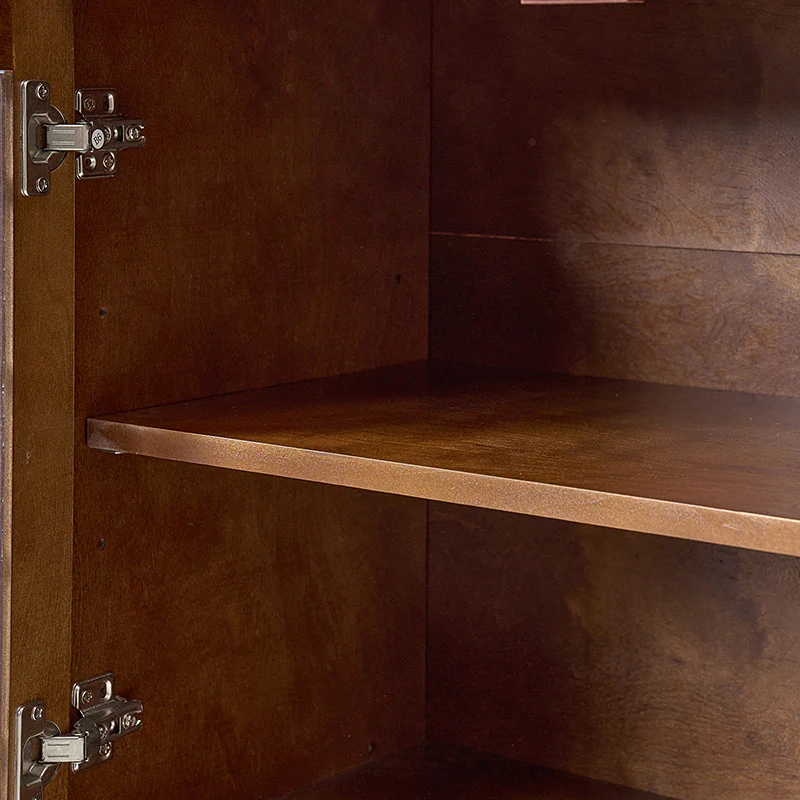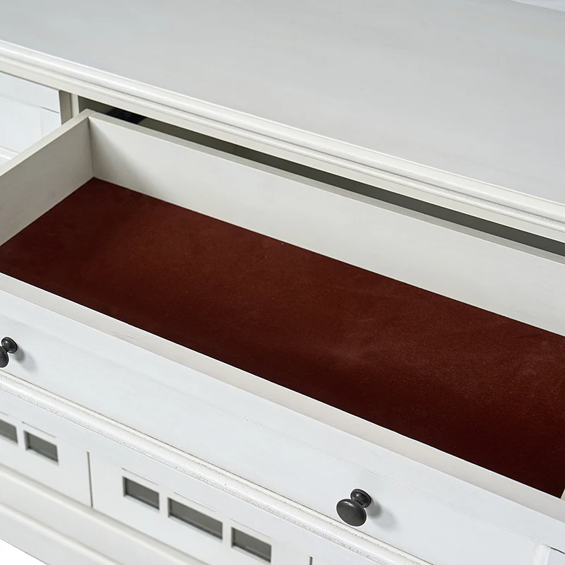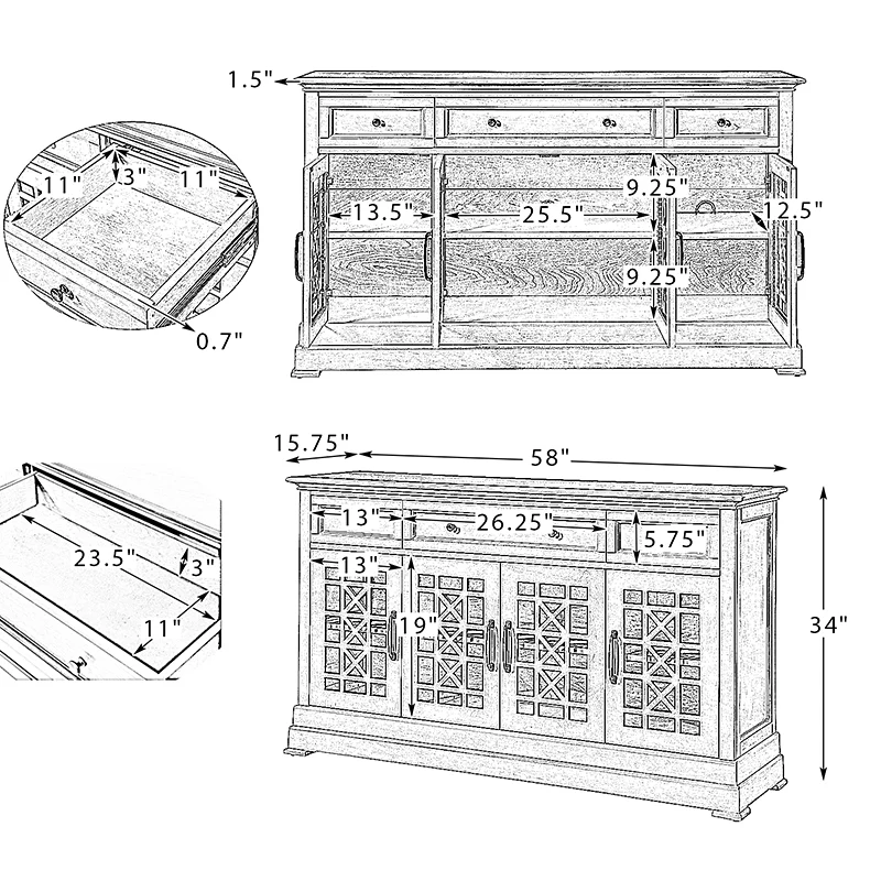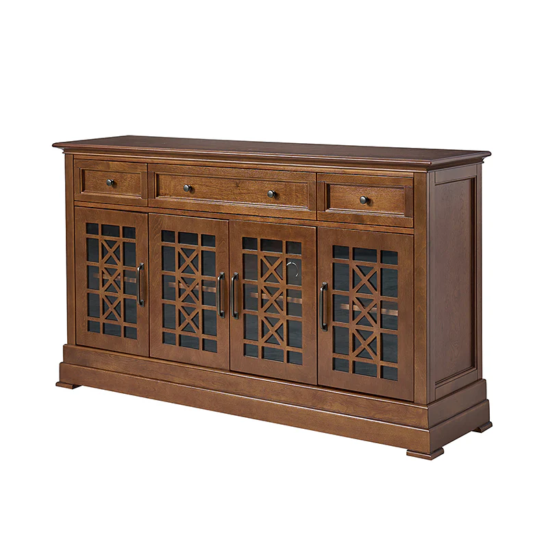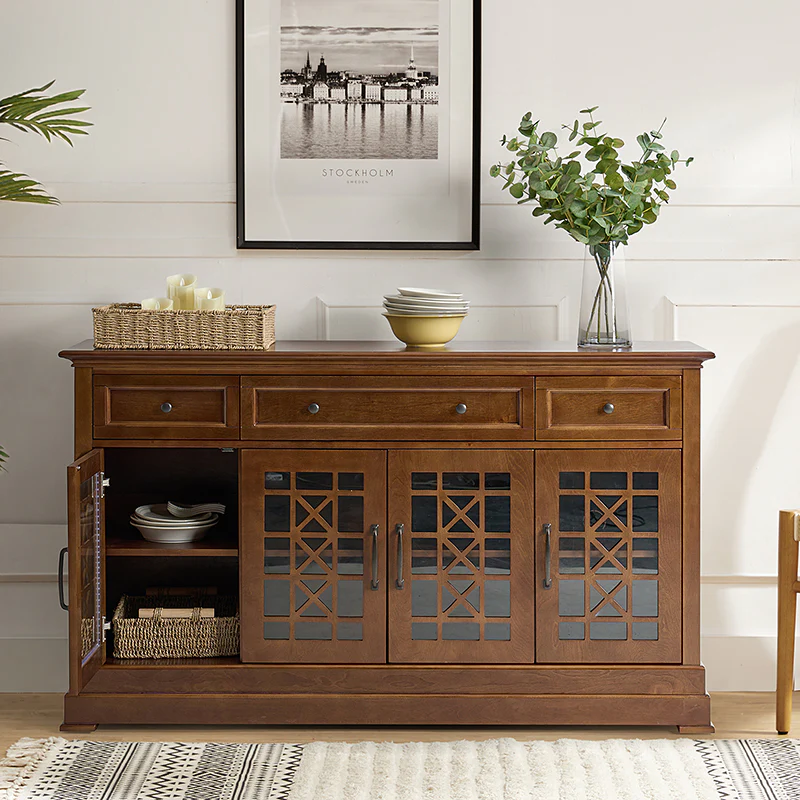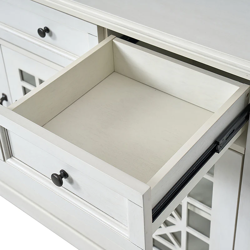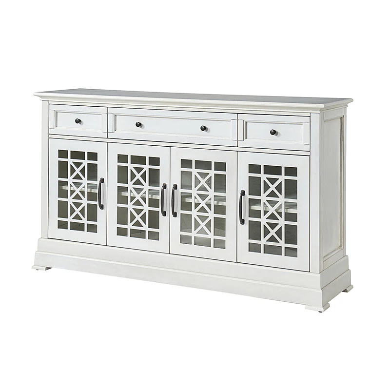 This elegant sideboard is a versatile addition to any dining or living space, designed with both form and function in mind. It features three drawers, with a felt-lined bottom drawer in the center, ensuring daily items are protected from scratches, making it an ideal storage solution for your tableware. The cable management system discreetly organizes wires, maintaining a clutter-free space. Its versatility shines through with an adjustable shelf, catering to varying storage needs. The sideboard's glass fronts are adorned with a chic crisscross pattern, adding a touch of sophistication while showcasing your cherished items. Plus, it rests on adjustable feet, providing stability on different surfaces, making it a practical and stylish choice for your home.