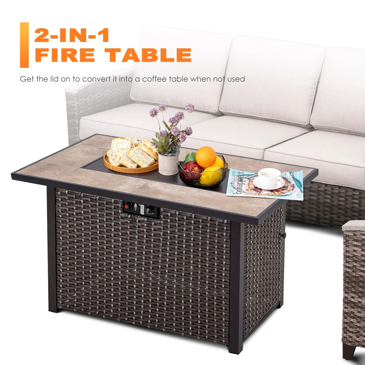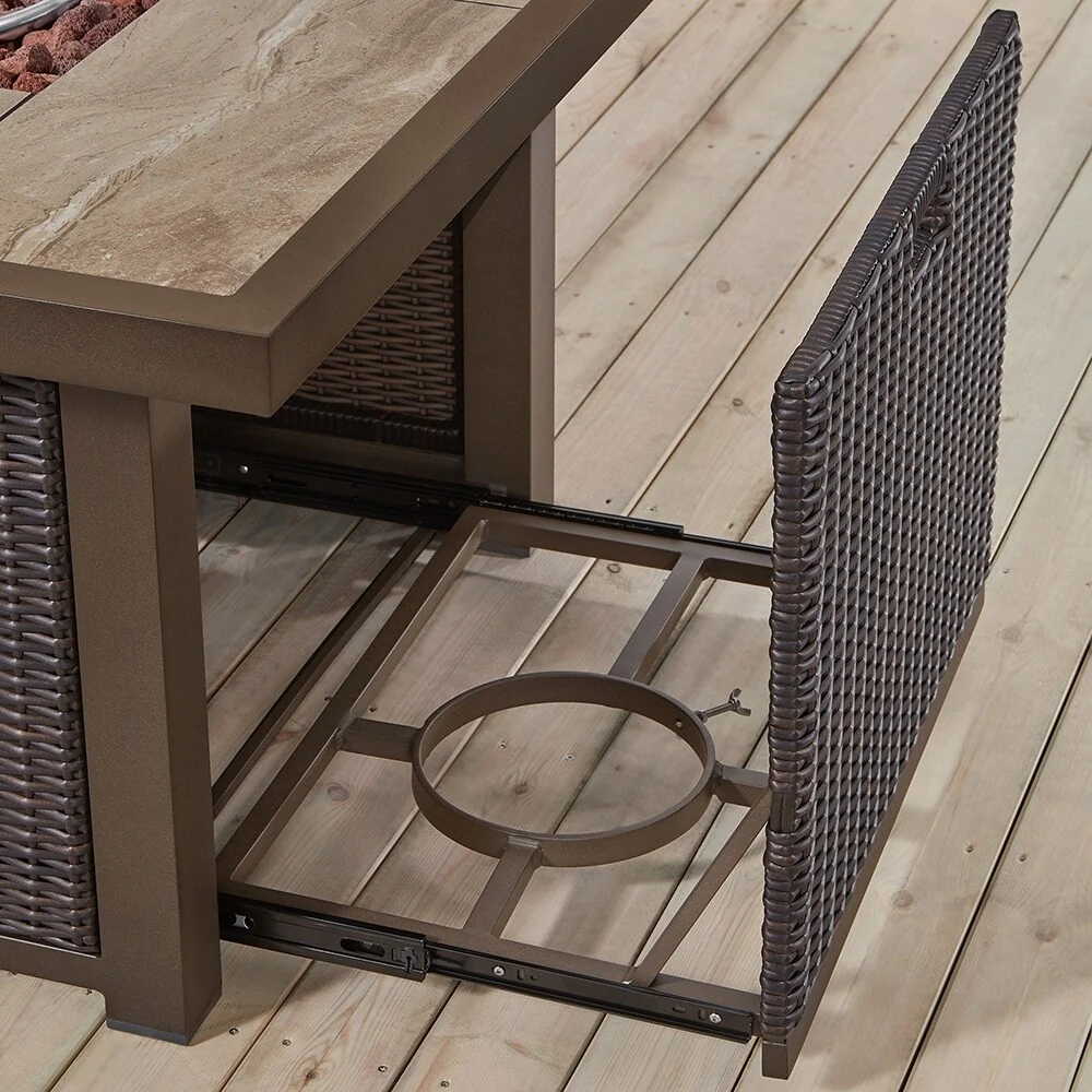 GDFStudio - Terra 32" Wicker Gas Fire Pit Table with Propane Tank Cover and Ceramic Tile Top