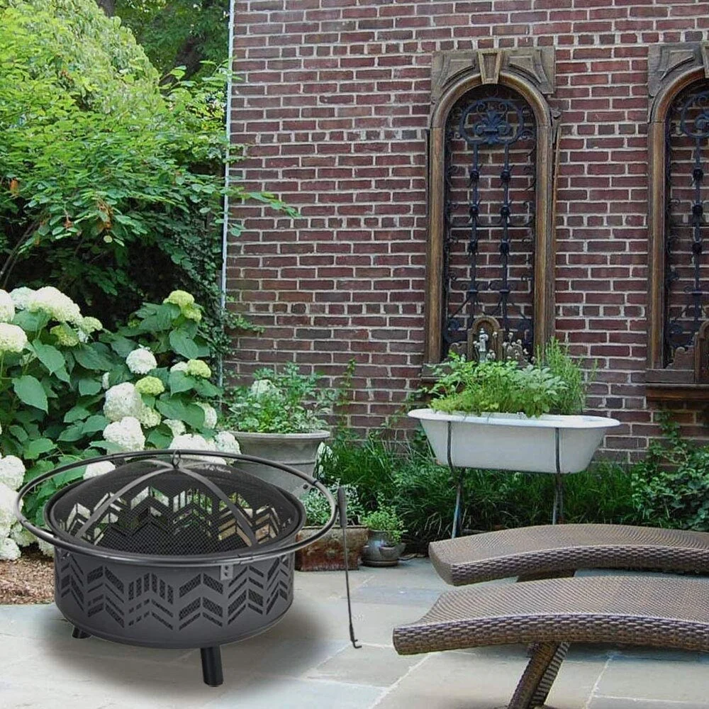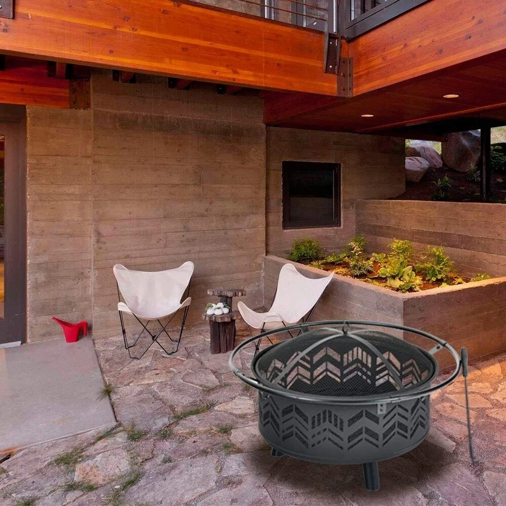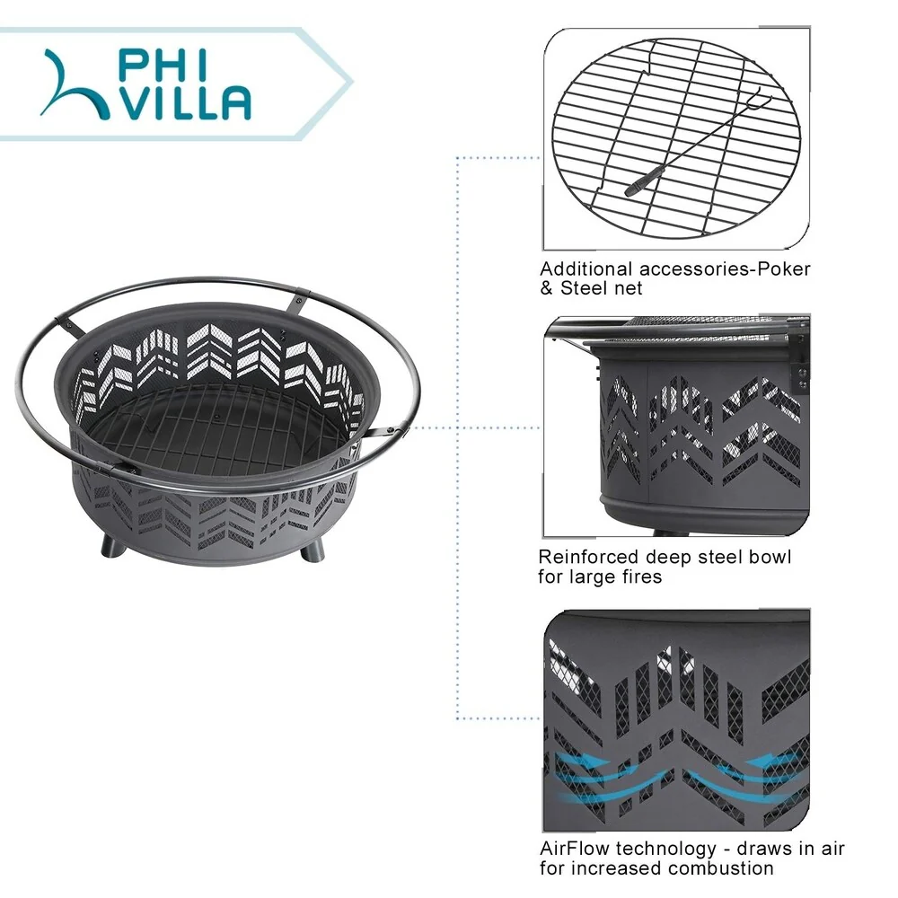 PHI VILLA 29" Large Steel Fire Pit, Poker & Spark Screen Included