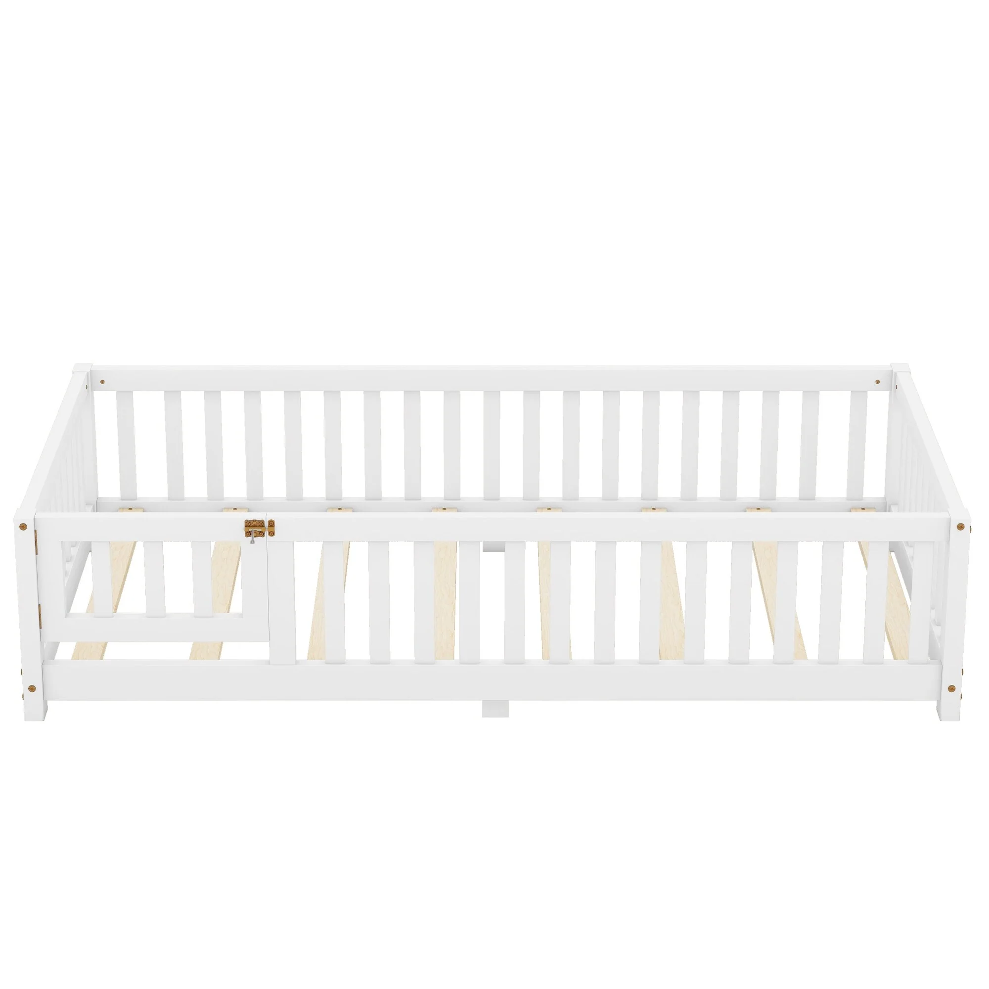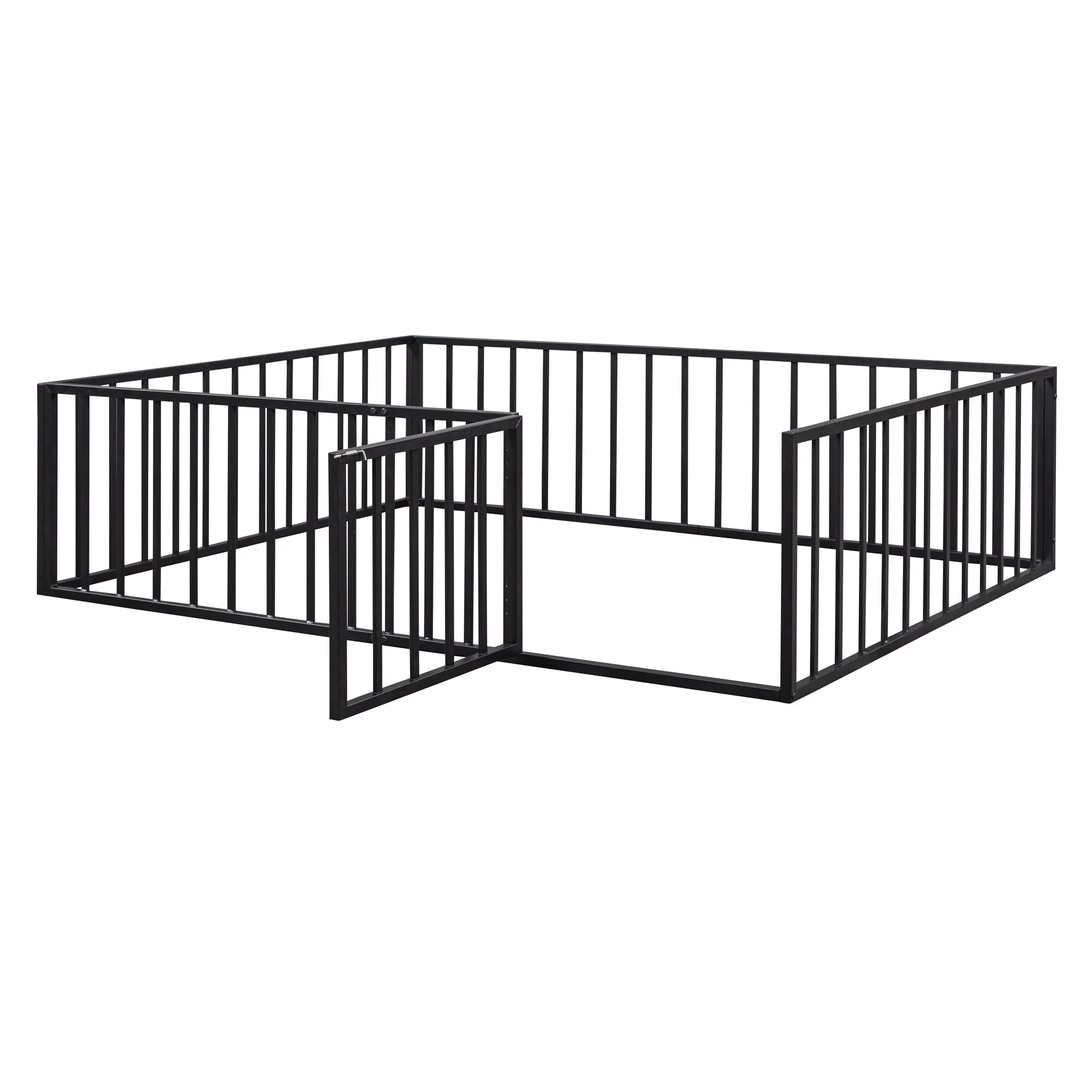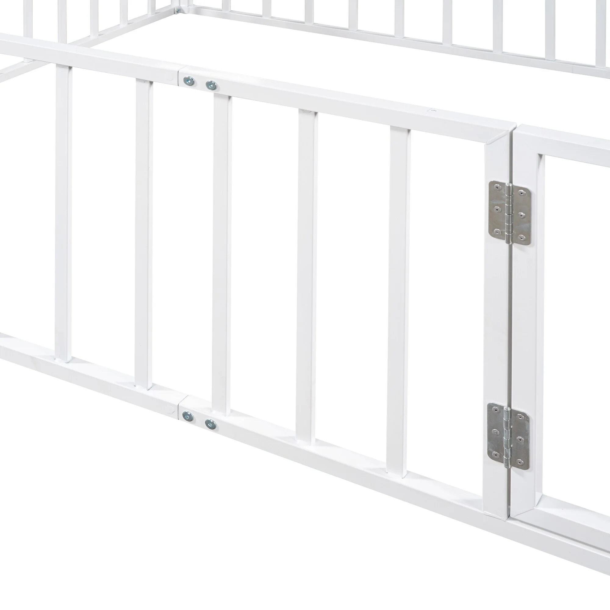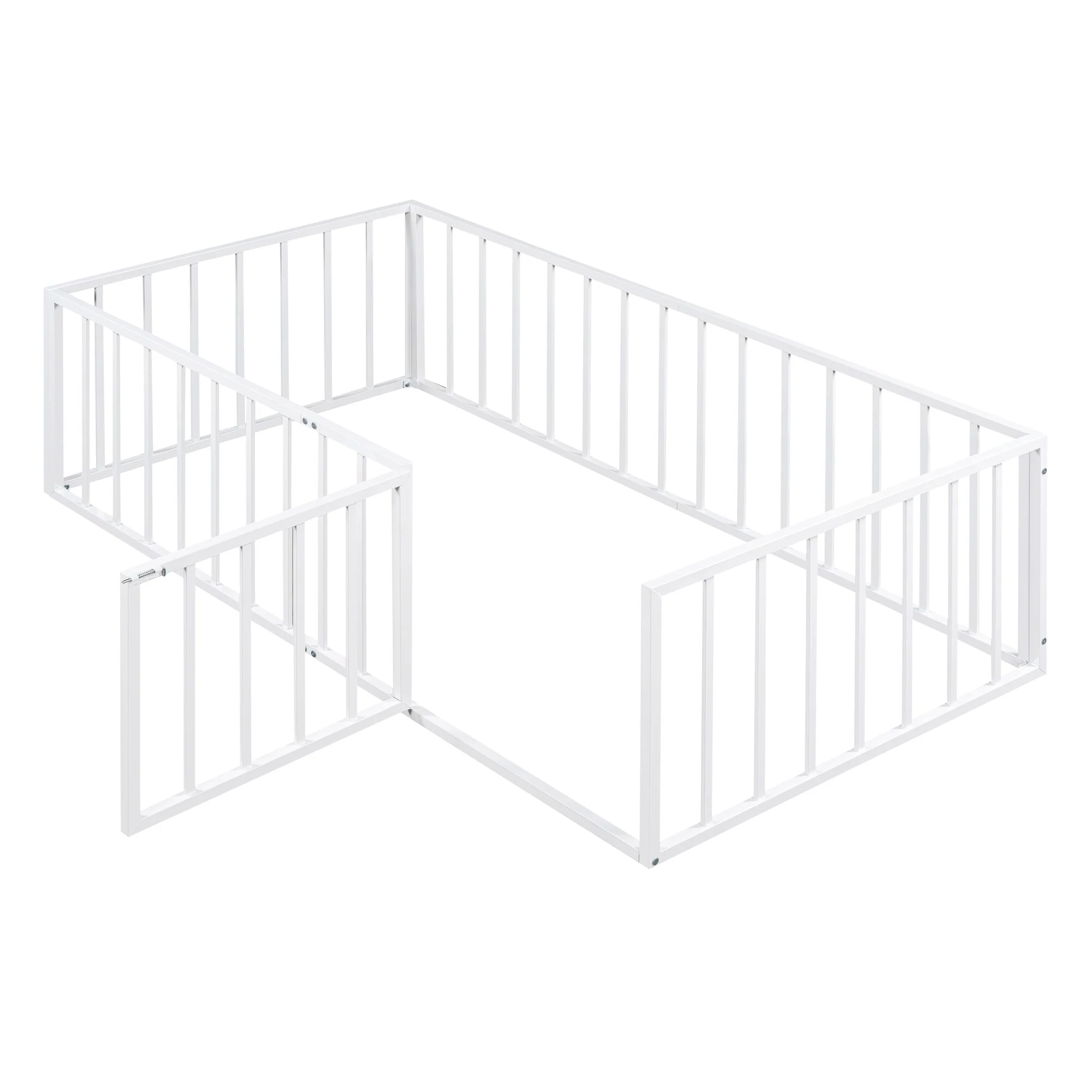 Twin Size Metal Floor Bed with Door and Fence, No Slats, Kids Play Space