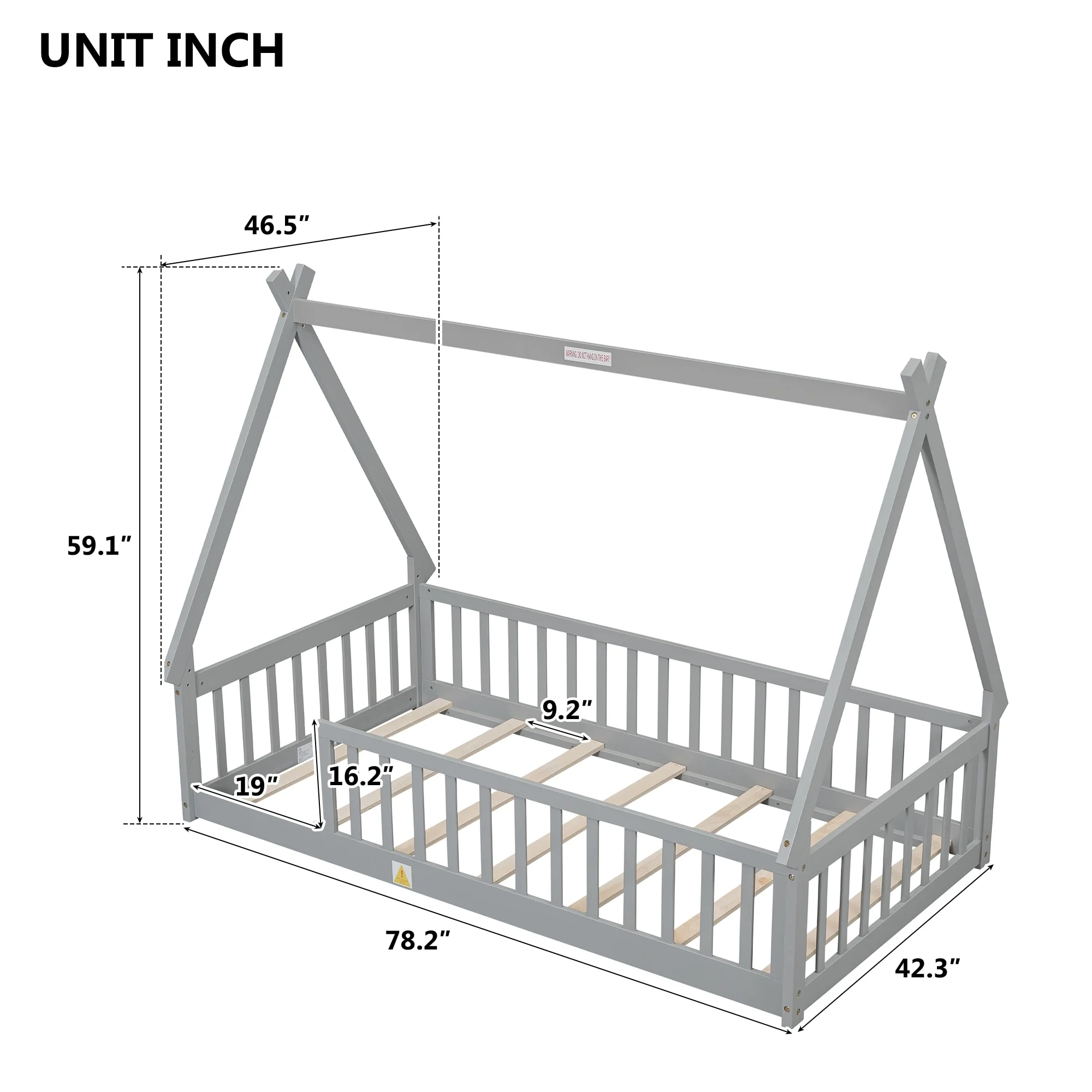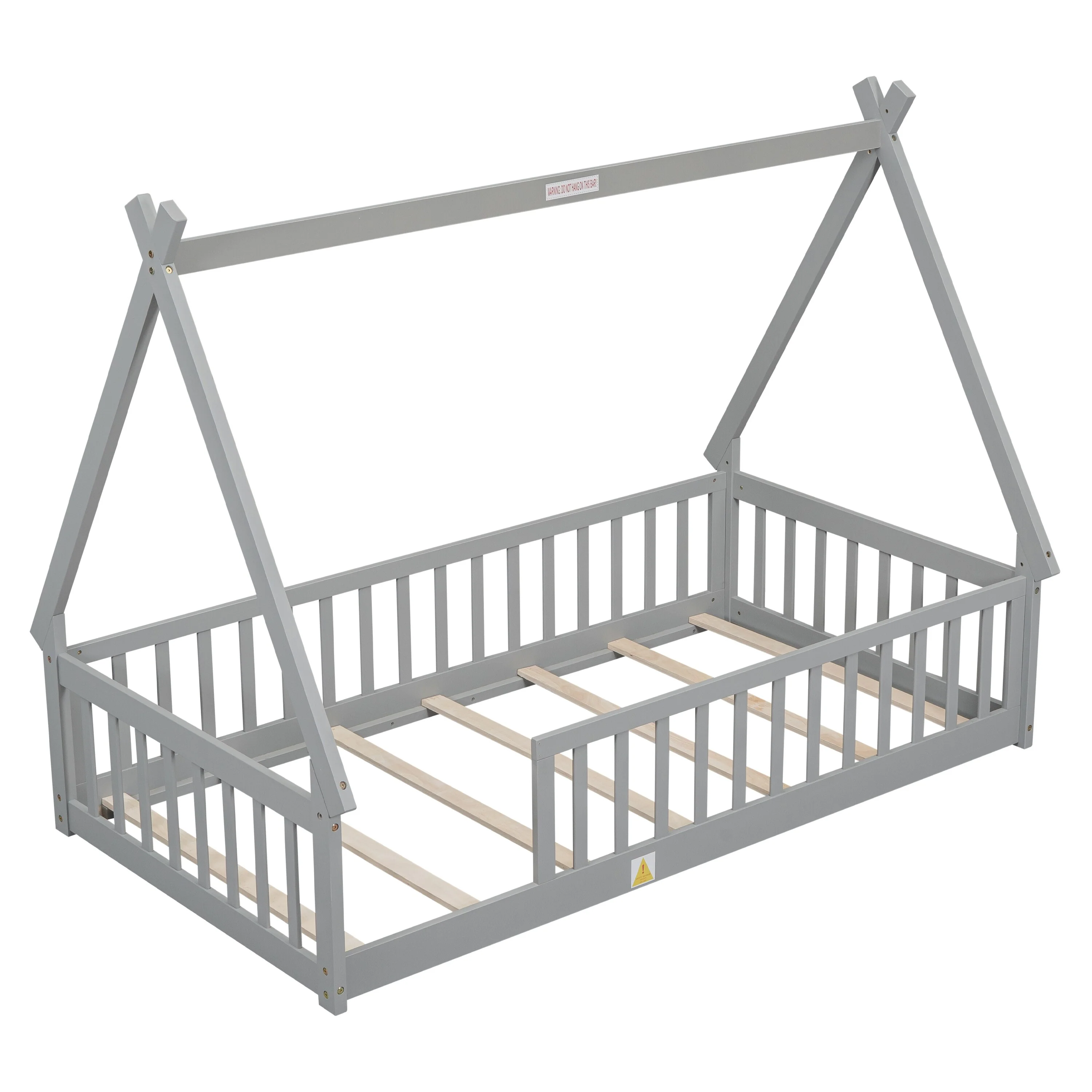 Tent-Shaped Twin Size Floor Bed with Fence and Guardrails, Pine Wood Construction