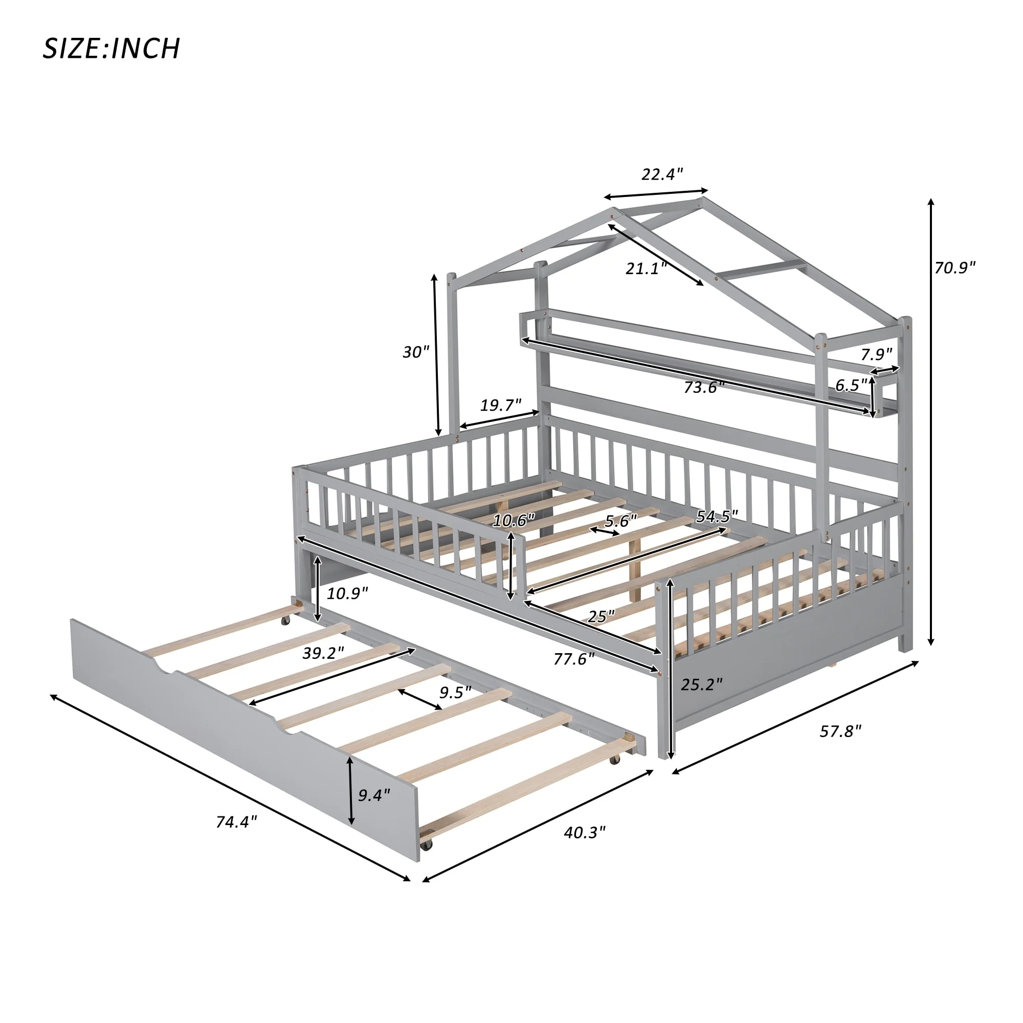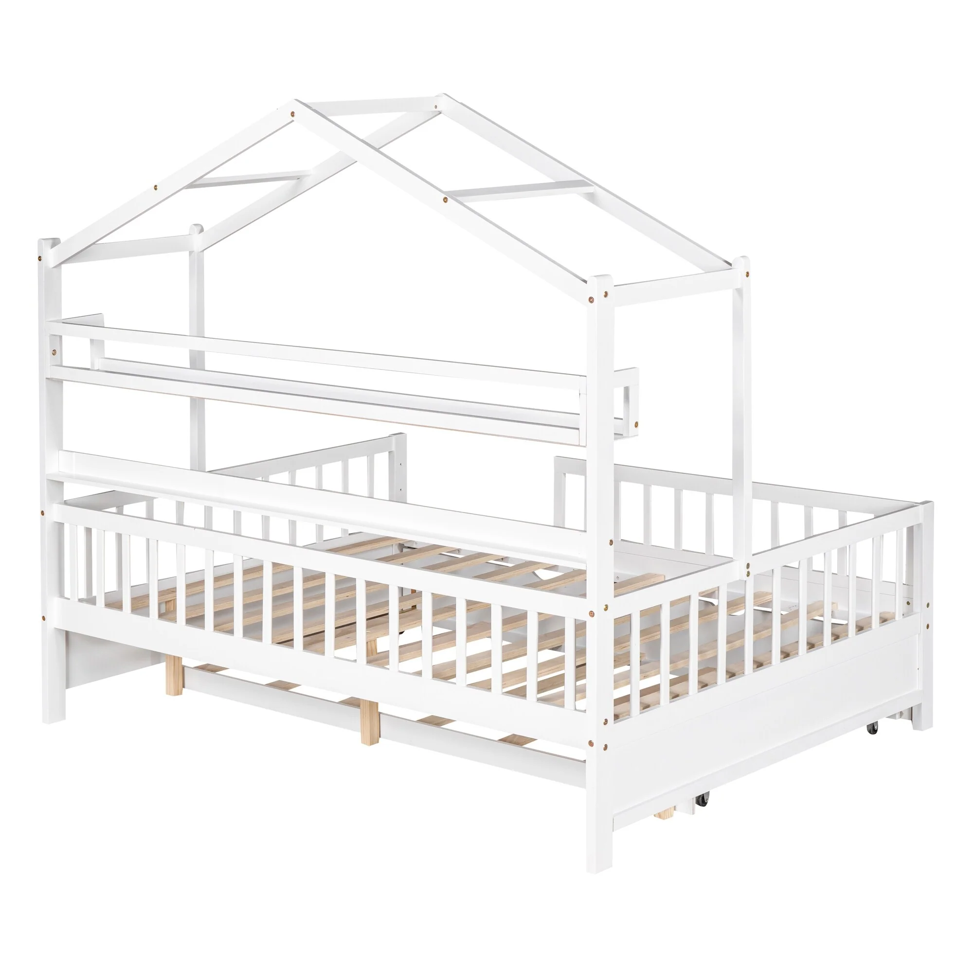 Full Size House Bed with Twin Trundle and Shelves, Kids Bed with Roof