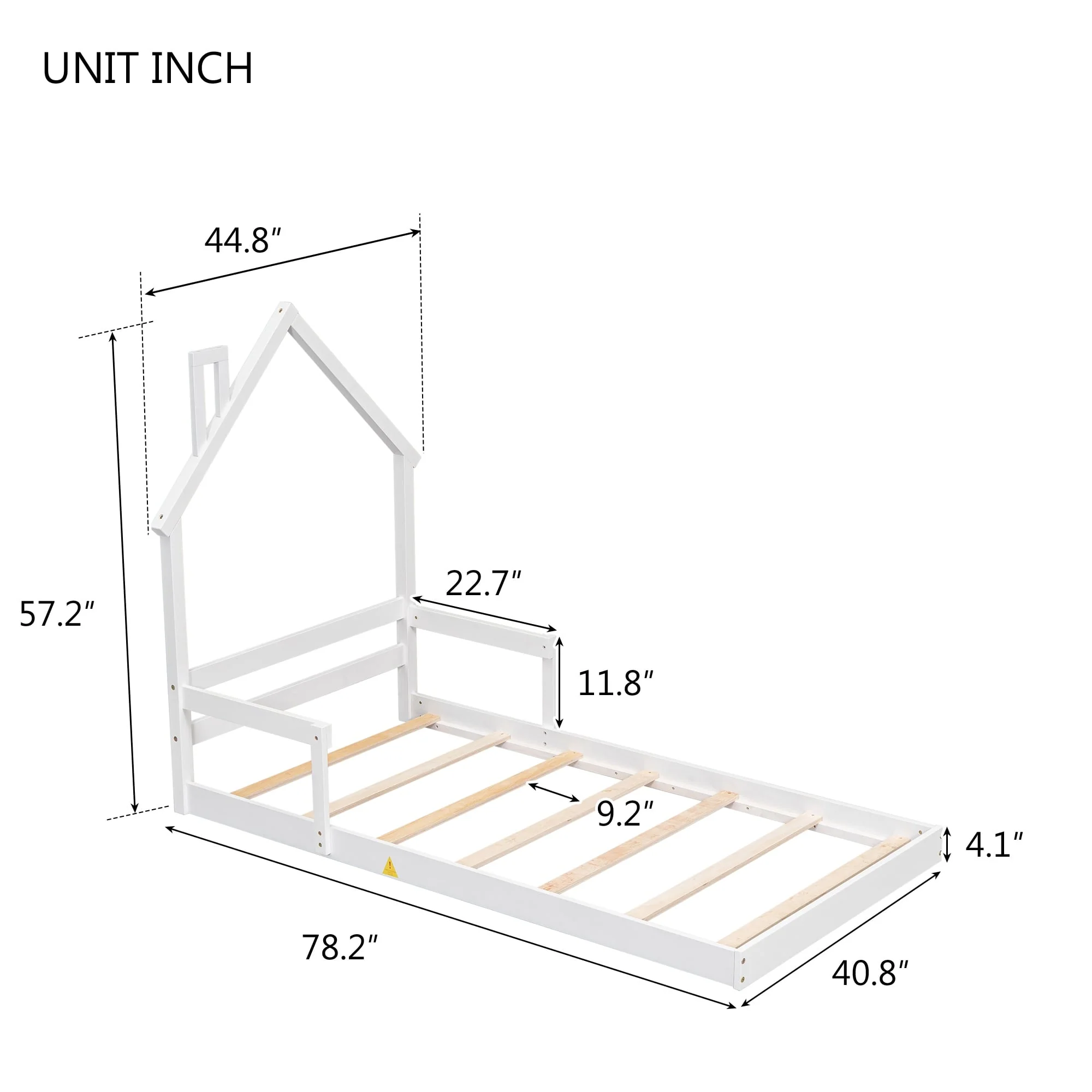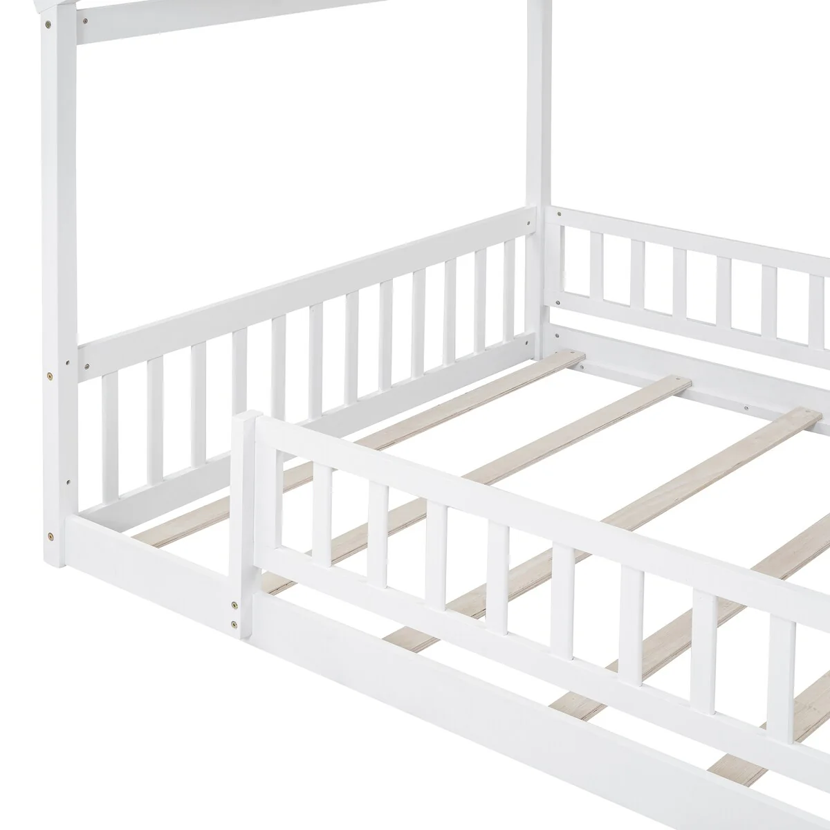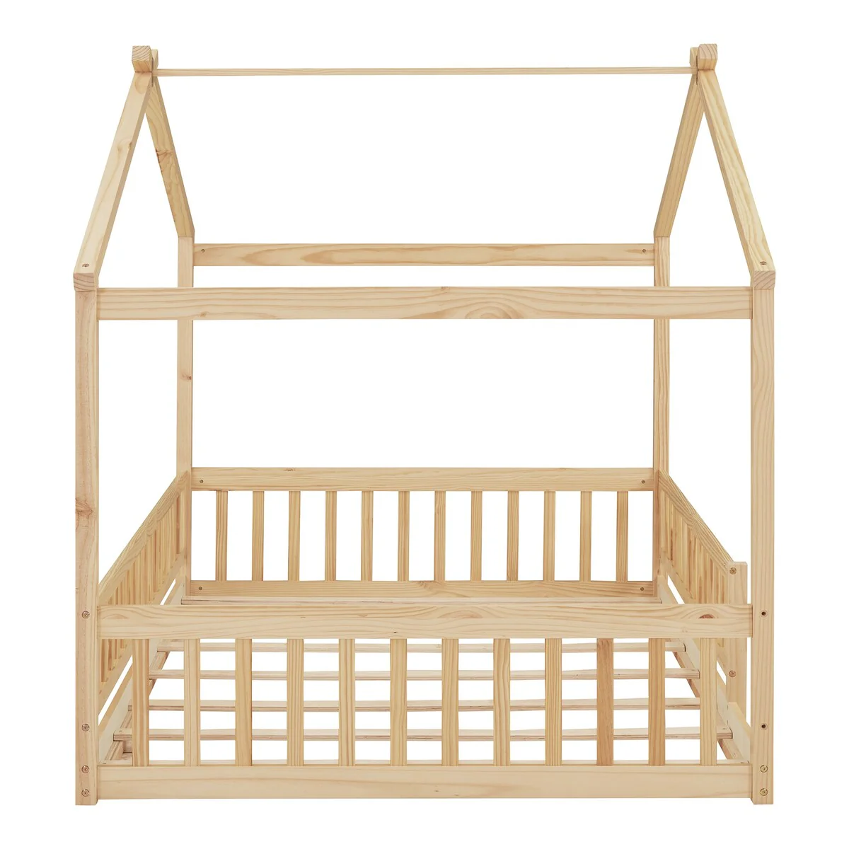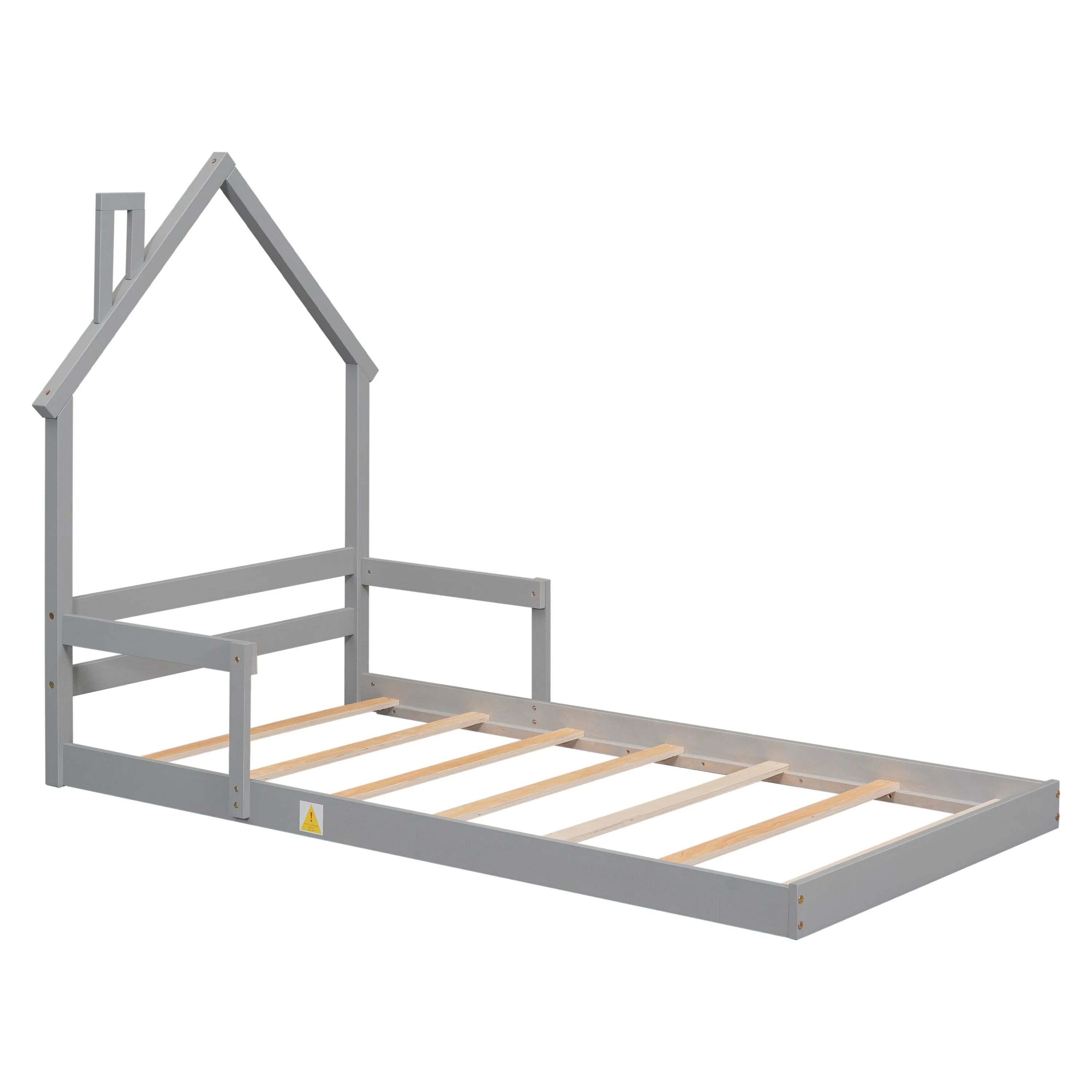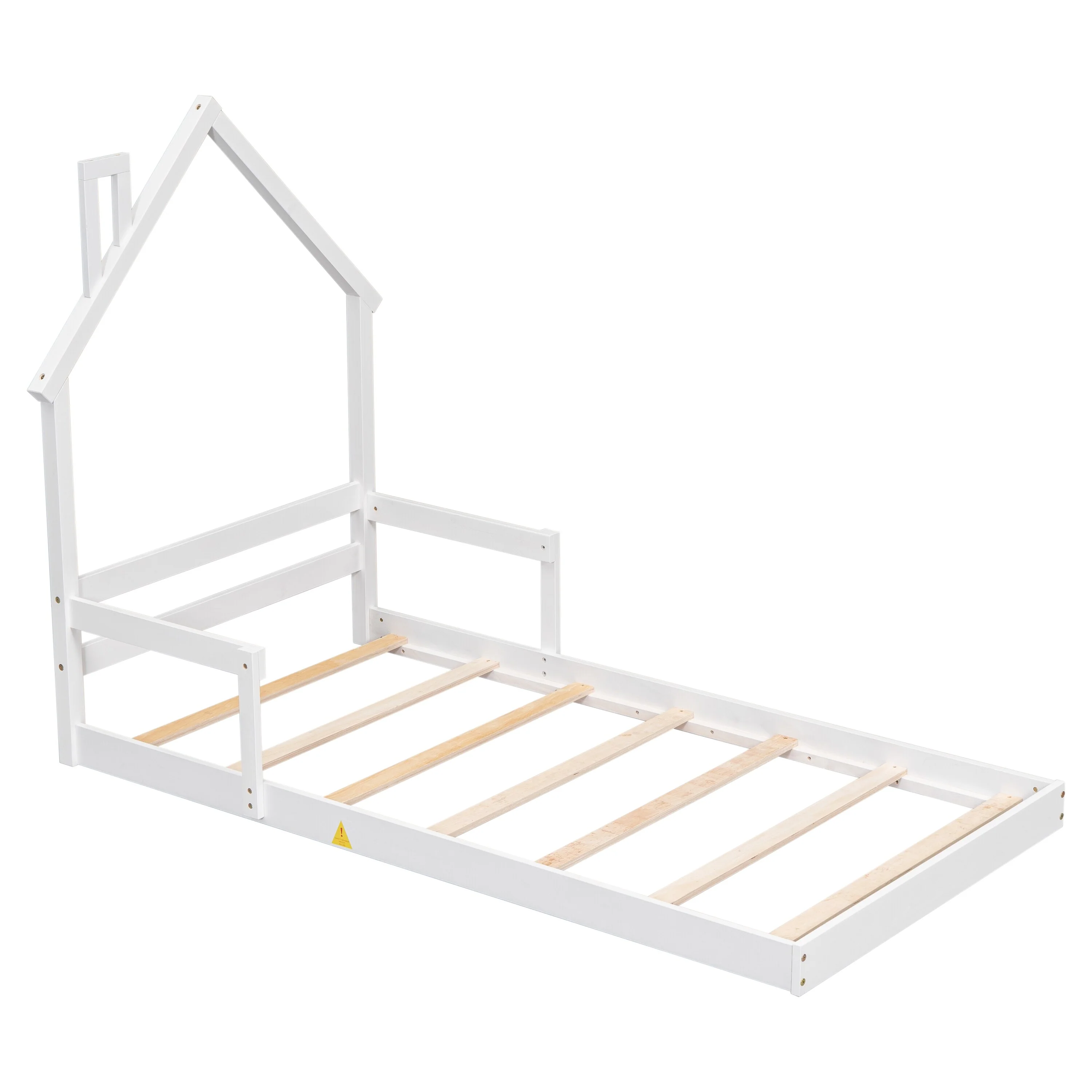Twin Size Floor Bed with House-Style Headboard, Handrails, and Slats, Pine Wood Construction