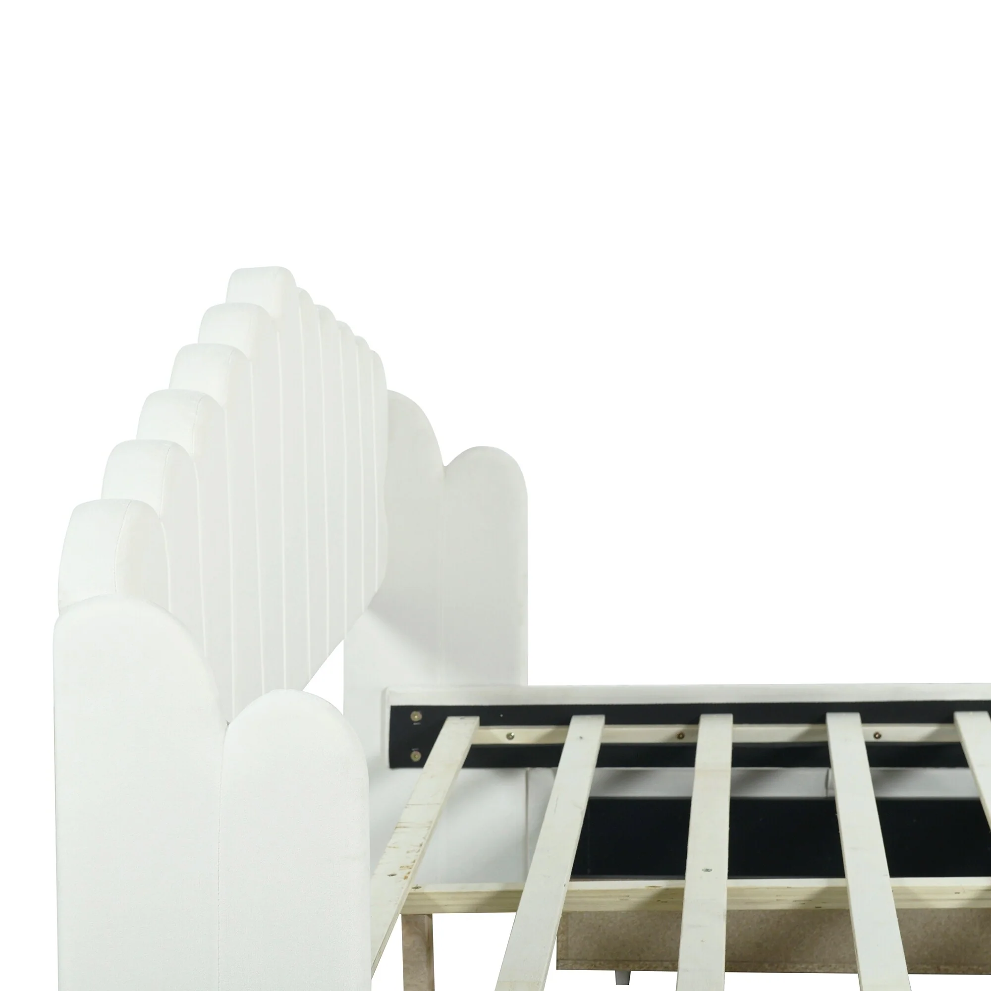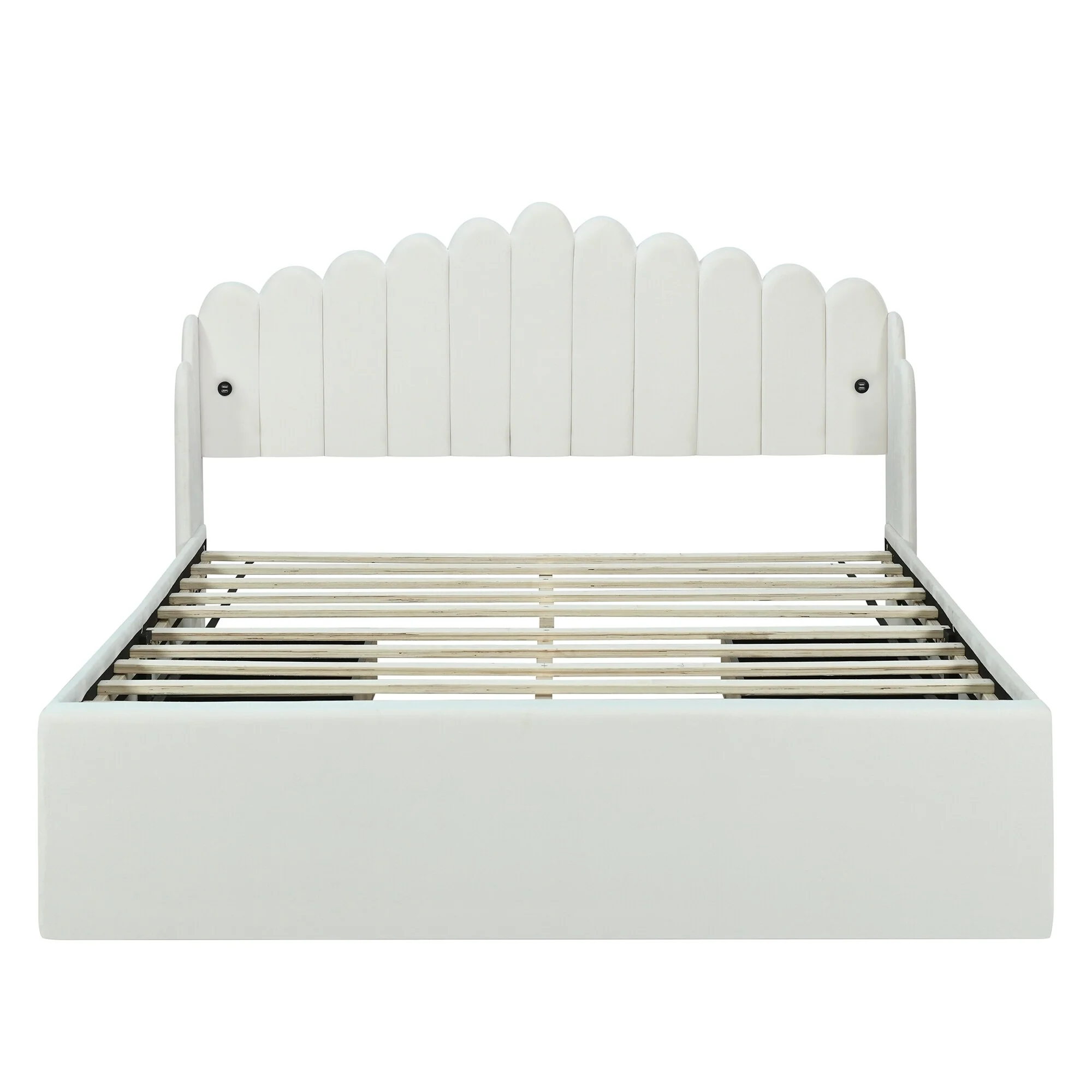 White Full Car-Shaped Platform Bed with Built-in Shelves and Cushioned Headboard