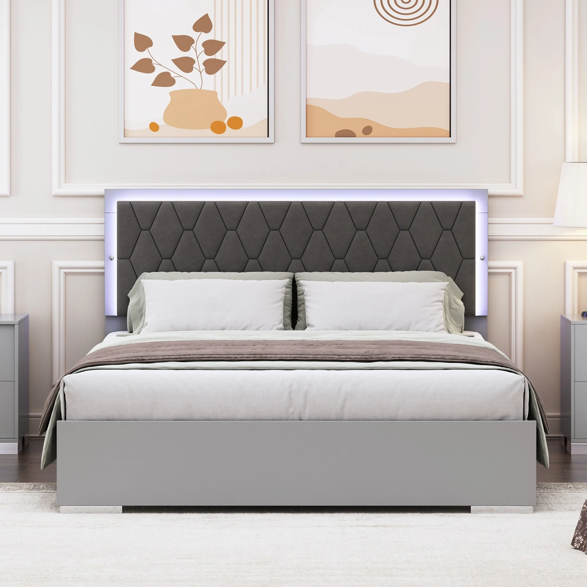Modern Queen Size Platform Bed with LED Lights and Soft Velvet Headboard